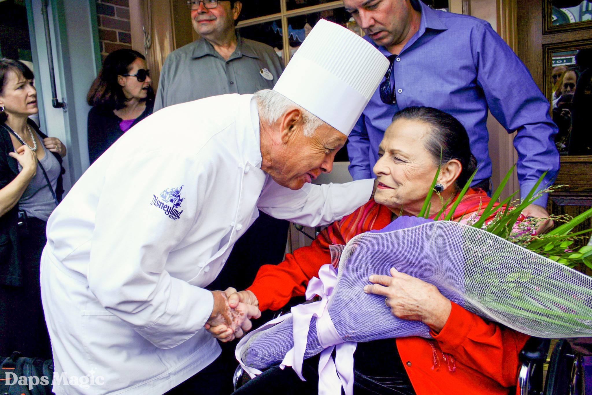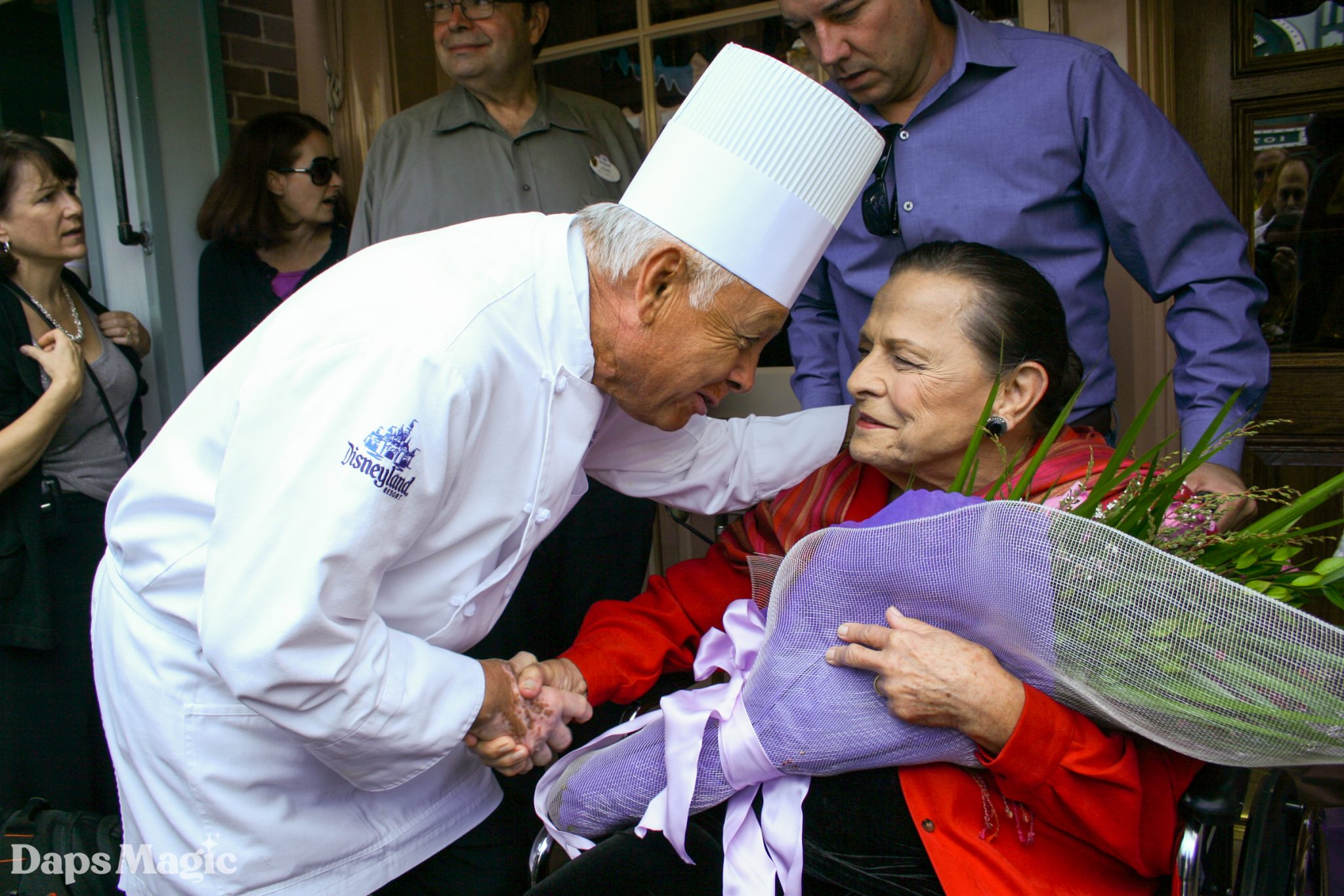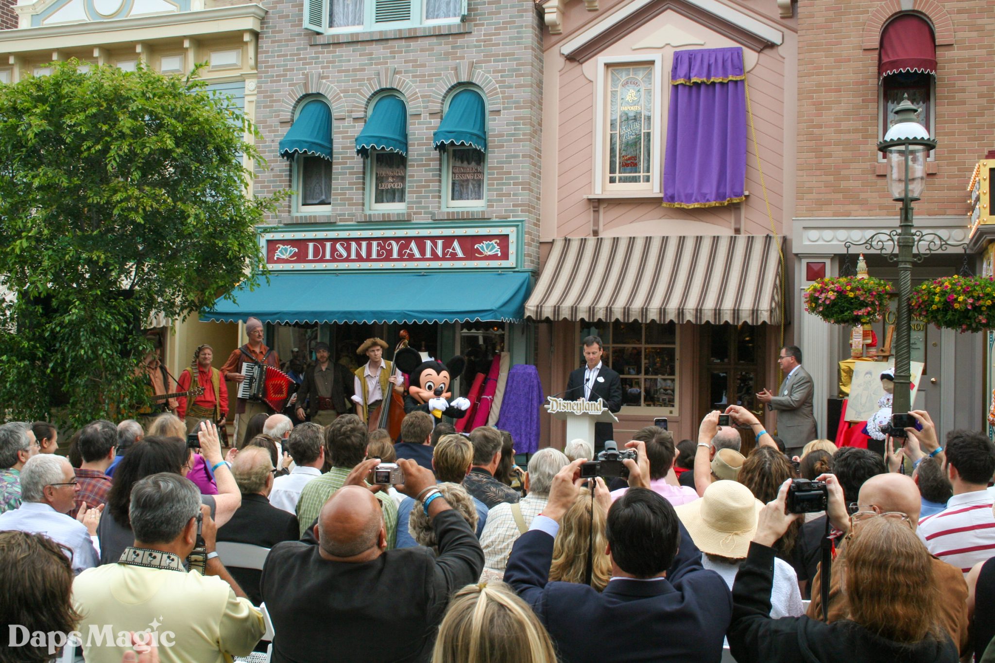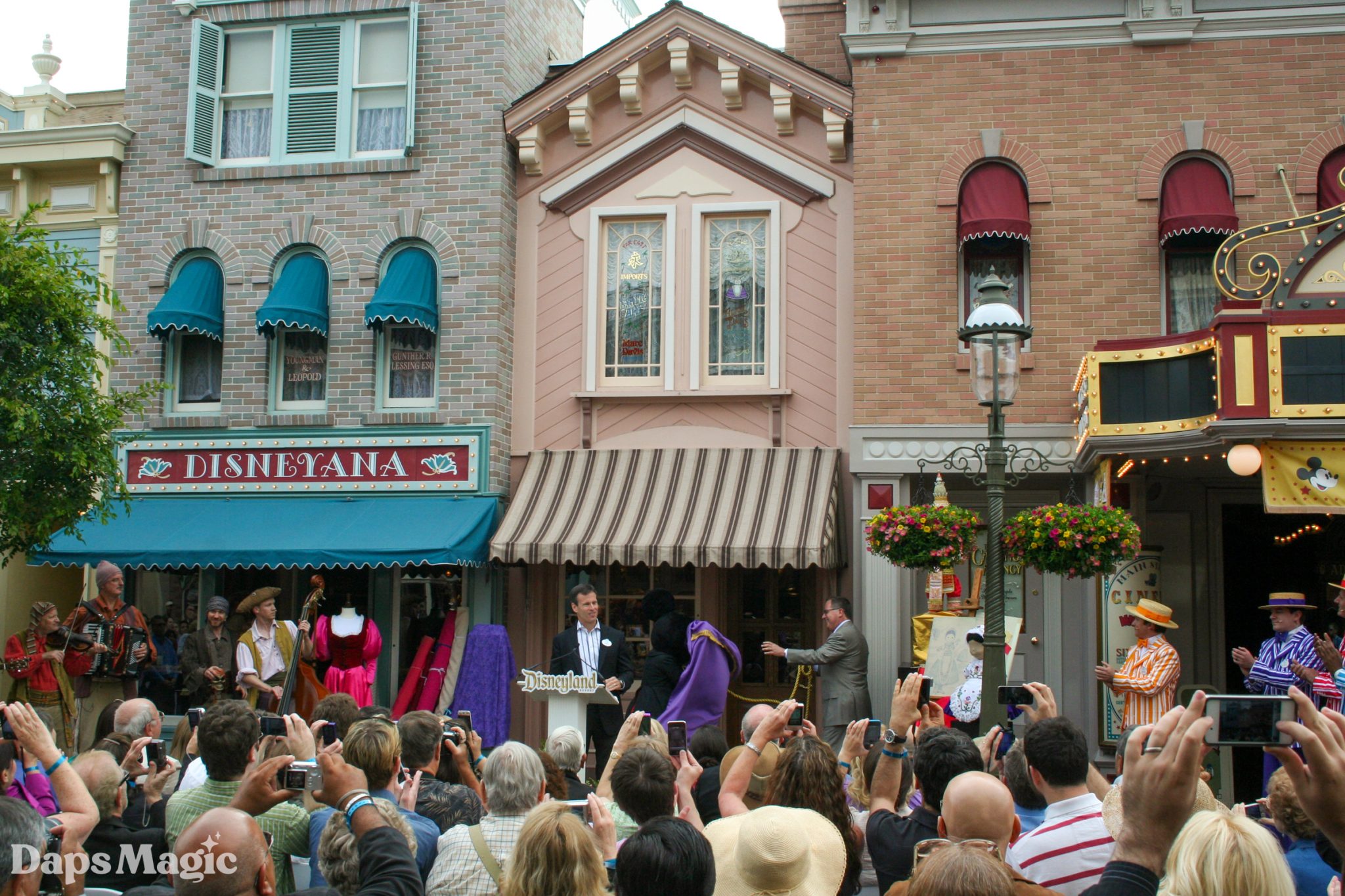 The ceremony began with the Dapper Dans singing as people entered the area. They then introduced President of the Disneyland Resort George Kalogridis by singing Zip-A-Dee-Do-Dah. President Kalogridis welcomed the guests and then explained the painted windows found around Main Street, USA and how they honor special people from the Walt Disney Company. He then introduced Chairman of Disney Parks and Resorts Tom Staggs. Mr. Staggs then gave tribute to Ms. Davis by sharing about her historic career with the Walt Disney Company. He explained how Marc Davis called Alice Davis to make a costume for Briar Rose for Sleeping Beauty. “It turned out that the costume was exactly what he was looking for… and so was Alice,” Staggs quipped. He then continued to share about Ms. Davis’ collaboration with Mary Blair on It’s a Small World and then her work on the costumes for Pirates of the Caribbean, General Electric’s Carousel of Progress, and Flight to the Moon before being named a Disney Legend in 2004.