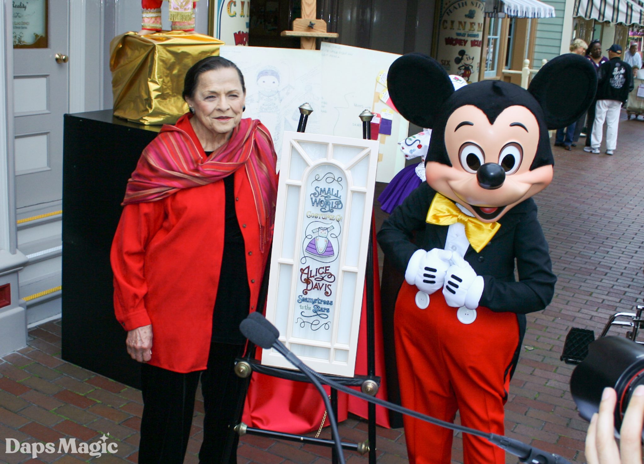 Tom Staggs then introduced Mickey Mouse, who with George Kalogridis, unveiled the new window dedicated to Alice Davis. The inscription says “Small World Costumer – Alice Davis – Seamstress to the Stars.” Alice Davis was then invited up to the podium to deliver a few remarks to a standing ovation. She started by sharing that “the greatest thing you can have in your life are good friends” and how touched she was that all her friends were there to share this special event with her.