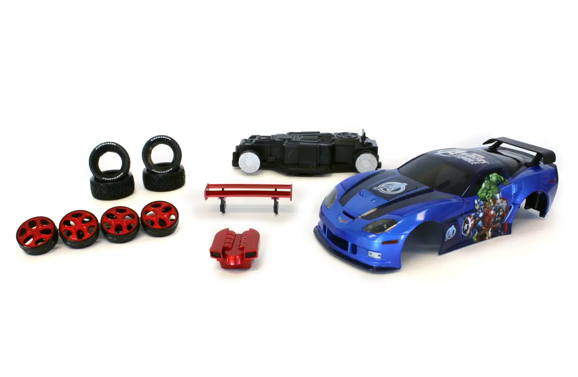 This Chevrolet Corvette features an Avengers-themed design, which includes Captain America, The Hulk, Iron Man, and Thor. It comes ready to assemble with a freewheel street chassis, 4 stock tires, 4 stock rims, working lights and sounds.