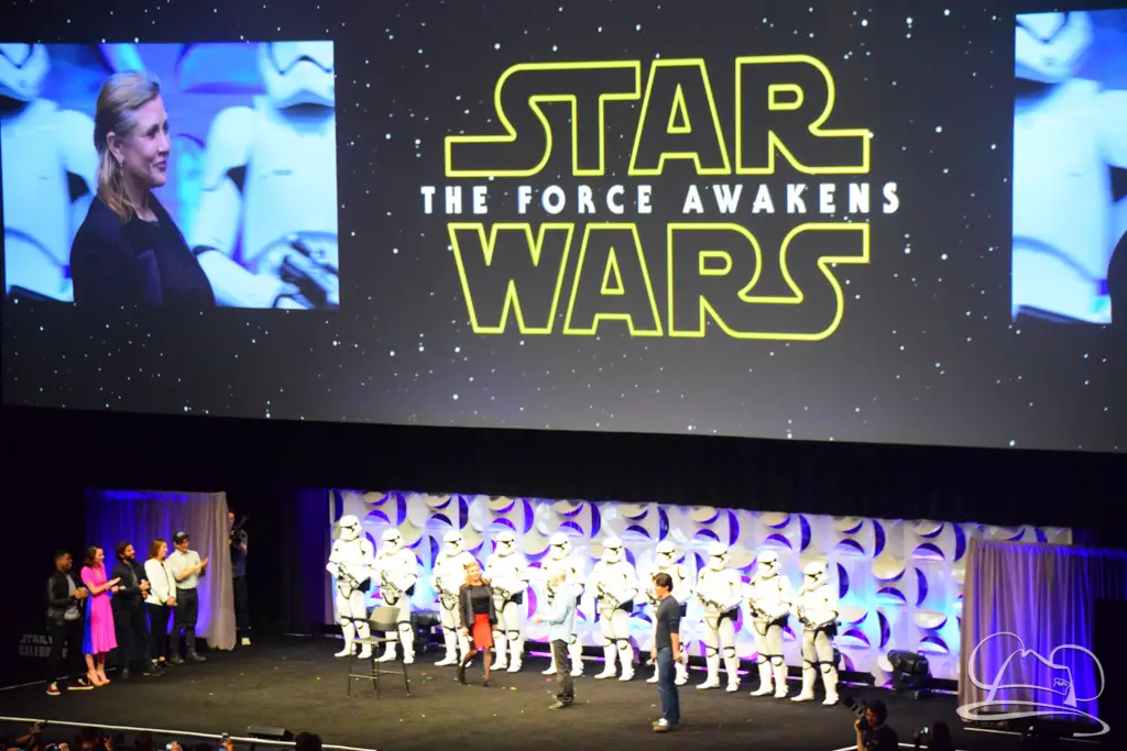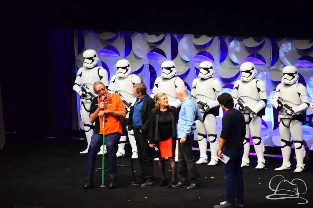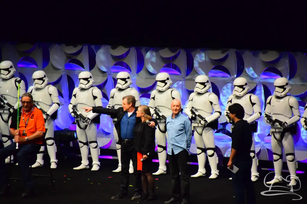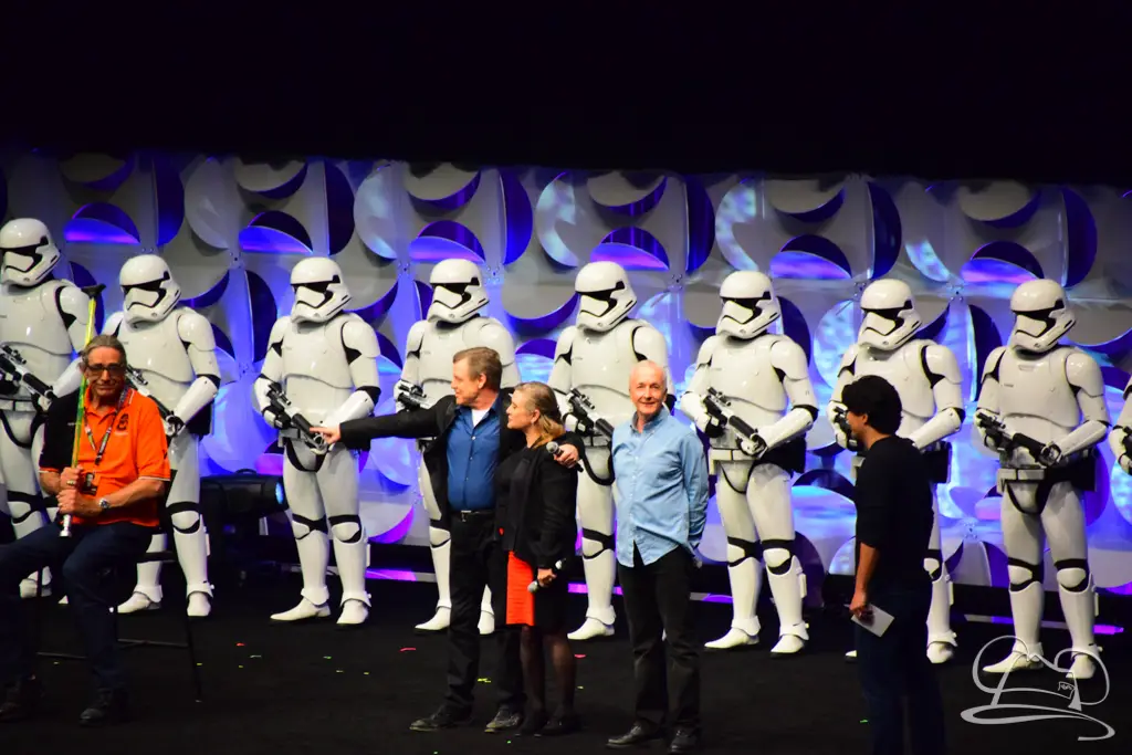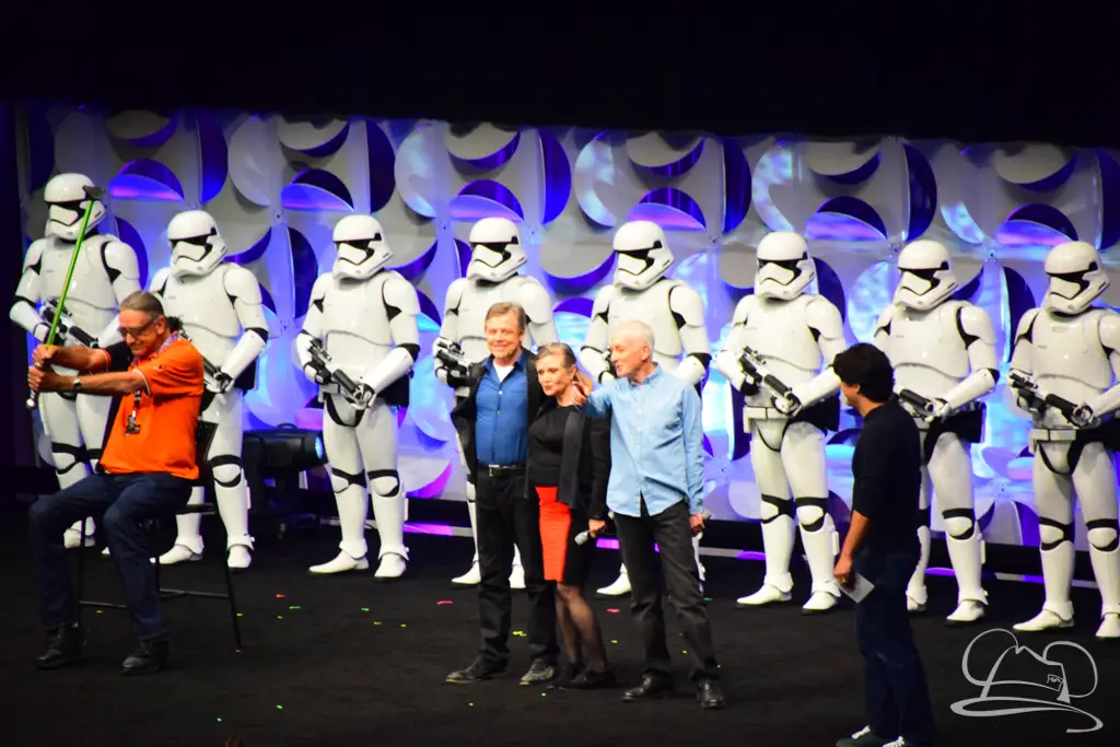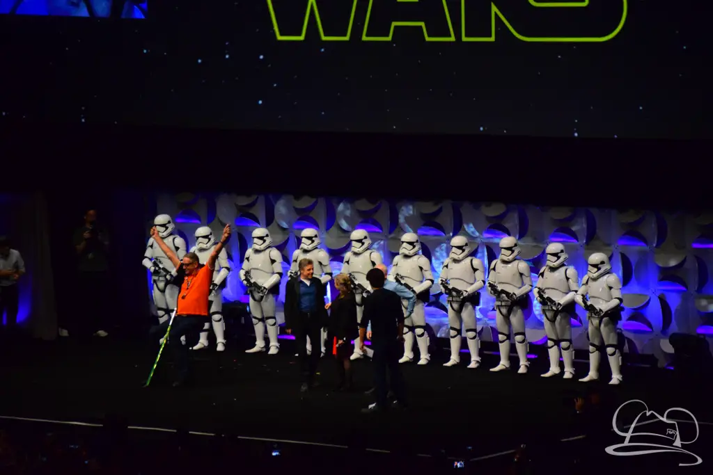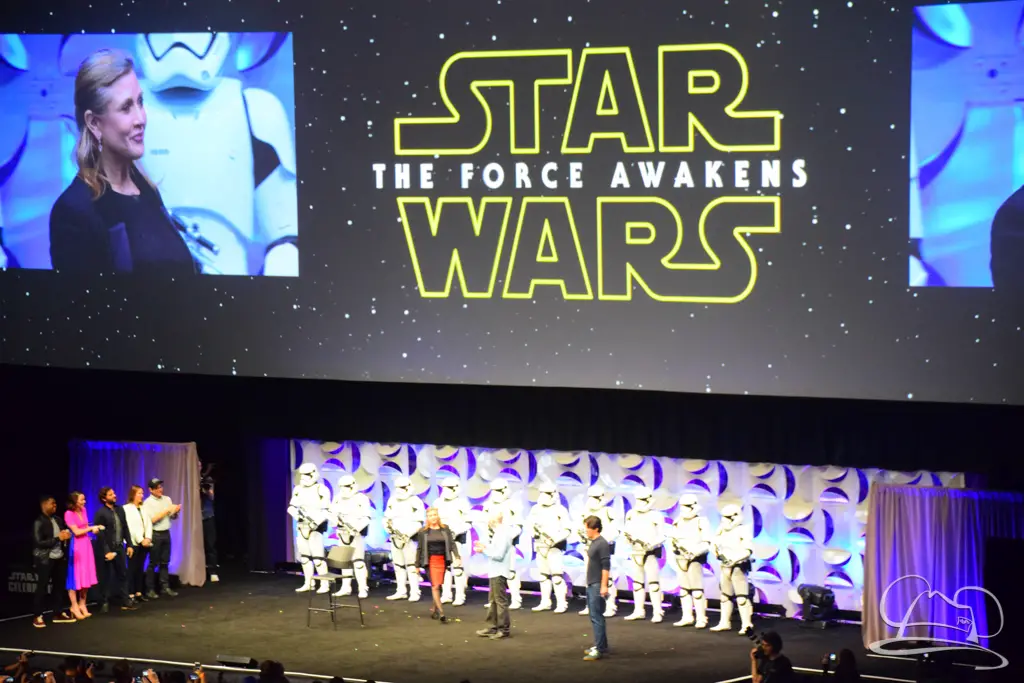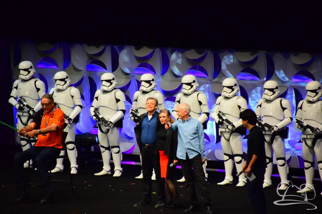 After a few tidbits were revealed with the new cast, including that the three characters are going to work together, a bit of a surprise came to the stage. Not only was there a legion of new stormtroopers paraded on, but some of the original cast that appears in the new film trodden out. Anthony Daniels, Mark Hamill, Peter Mayhew and Carrie Fisher brought on long applause. The quartet talked about how much they love the fans, and how great it has been to be part of the legacy of Star Wars.
