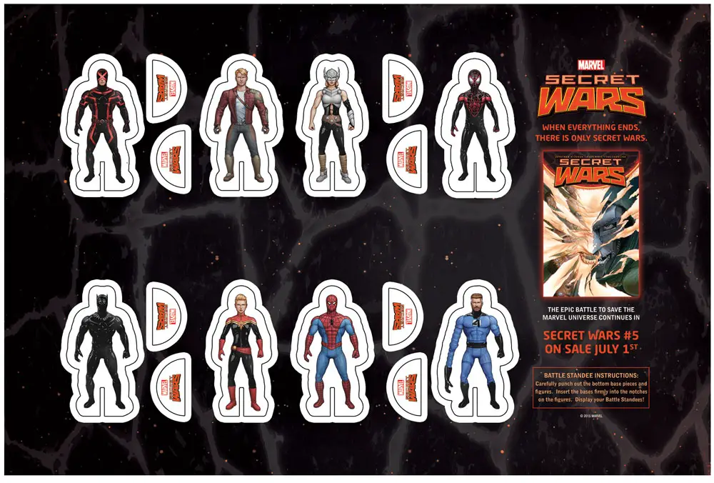 Releasing alongside June’s SECRET WARS #4, the SECRET WARS BATTLE STANDEE ONE-SHEET features eight different characters that can be assembled into individual figure standees. Featuring artwork by rising star John Tyler Christopher, each sheet includes standees of Mr. Fantastic, Black Panther, Miles Morales, Peter Parker, Star-Lord, Captain Marvel, Thor and Cyclops!