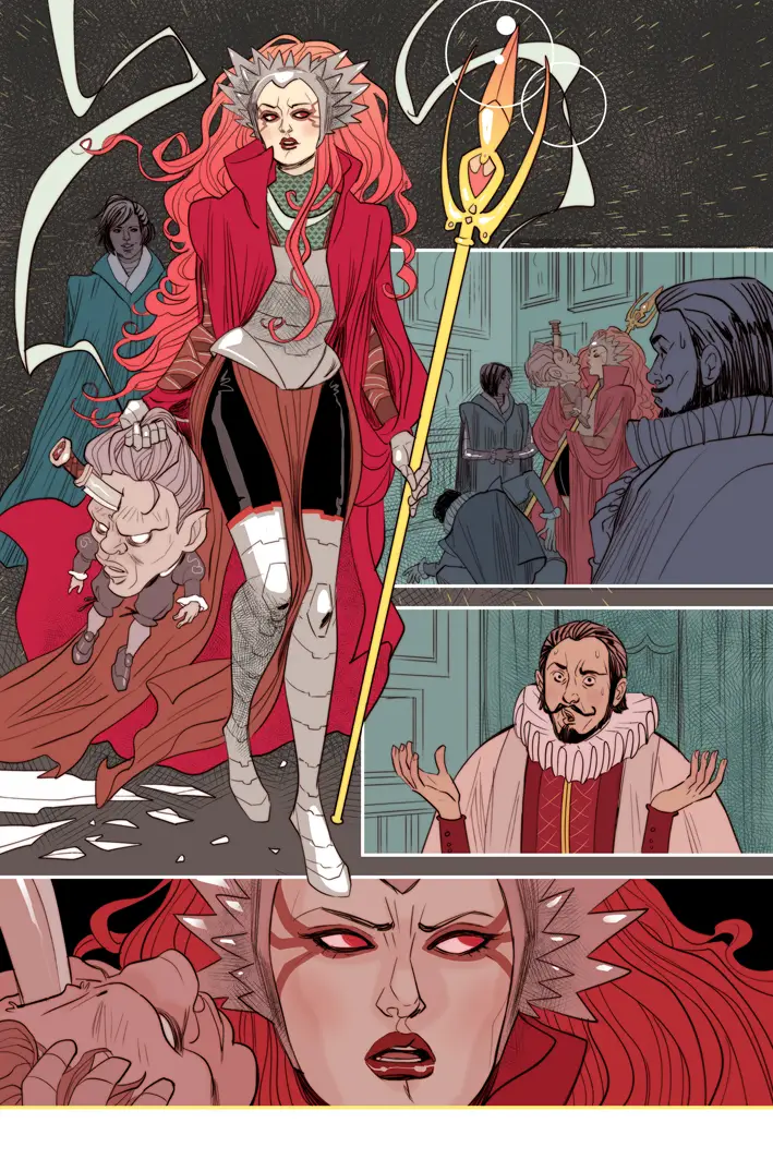 New York, NY—May 18th, 2015— This June – magic and might battle marvelous monstrosities as Angela and Sera take the fight to Battleworld! Today, Marvel is pleased to present your new look at 1602 WITCH HUNTER ANGELA #1 – a brand-new Secret Wars series! Blockbuster writers Marguerite Bennett and Kieron Gillen are joined by artists Stephanie Hans and Marguerite Sauvage for an adventure fueled tale that has to be seen to be believed! In King James’ England, two names are feared above all else – Angela and Sera, scourges of all creatures that haunt their Battleworld domain. They seek a new, seductive evil – not witchbreed, but deal-making Faustians, those who bargain with ancient creatures in return for unnatural power. As wicked evil and malicious shadow creep over the land – will Angela and Sera destroy this evil, or will they succumb to it? The answers lie within this June in 1602 WITCH HUNTER ANGELA #1!