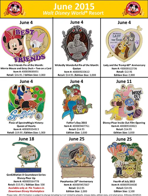 Calling all pin traders! Pins to be released in the month of June have been announced. New pins are set to be released for both the Disneyland Resort and Walt Disney World Resort. Pins will vary per resort.