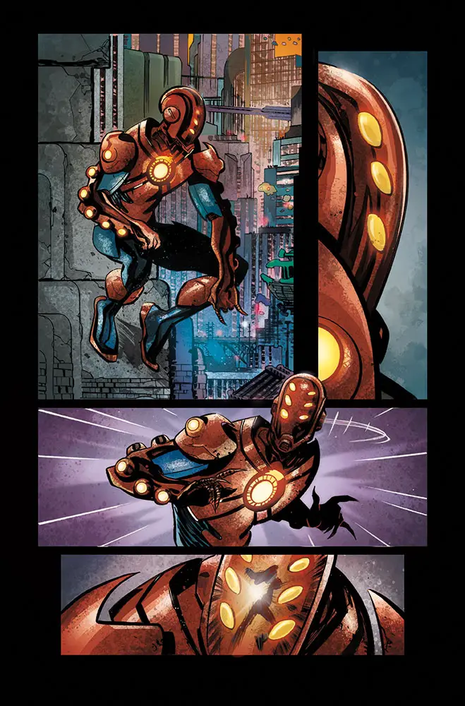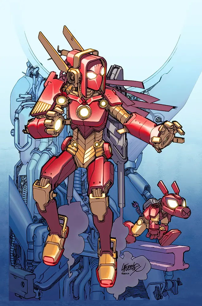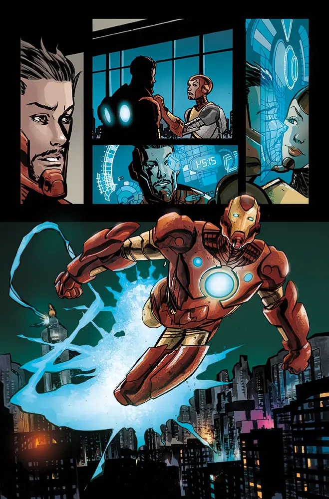 New York, NY—May 5th, 2015— This June, suit up and strap in as the Secret Wars bring you to a tecno-utopia, with a dark and sinister secret! Today, Marvel is pleased to present your new look at ARMOR WARS #1 – a brand new Secret Wars series from Eisner-award winning writer James Robinson and artist Marcio Takara! Deep in the heart of Battleworld lies Technopolis. A shining beacon of progress for all Battleworld to see. Full of science and wonder created by the two genius brothers – Tony and Arno Stark. Yet shadows fall over this armored paradise. A unique disease that forces EVERYONE to wear armor just to live and breathe! And when an unexpected murder strikes his domain, Baron Tony Stark must race against the clock to identify the culprit. But is he too late to stop more bodies from showing up? The mechanical murder mystery that will have readers guessing to the very last page kicks off this June in ARMOR WARS #1!