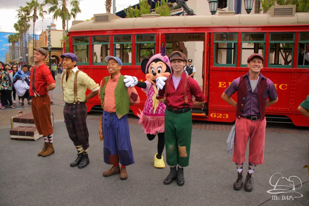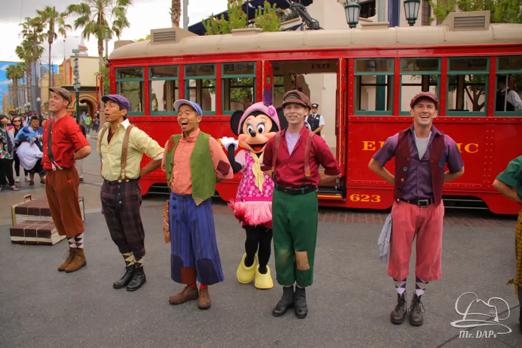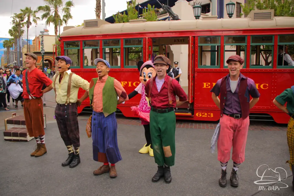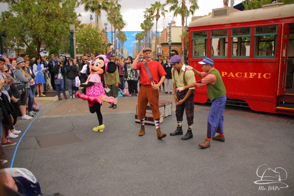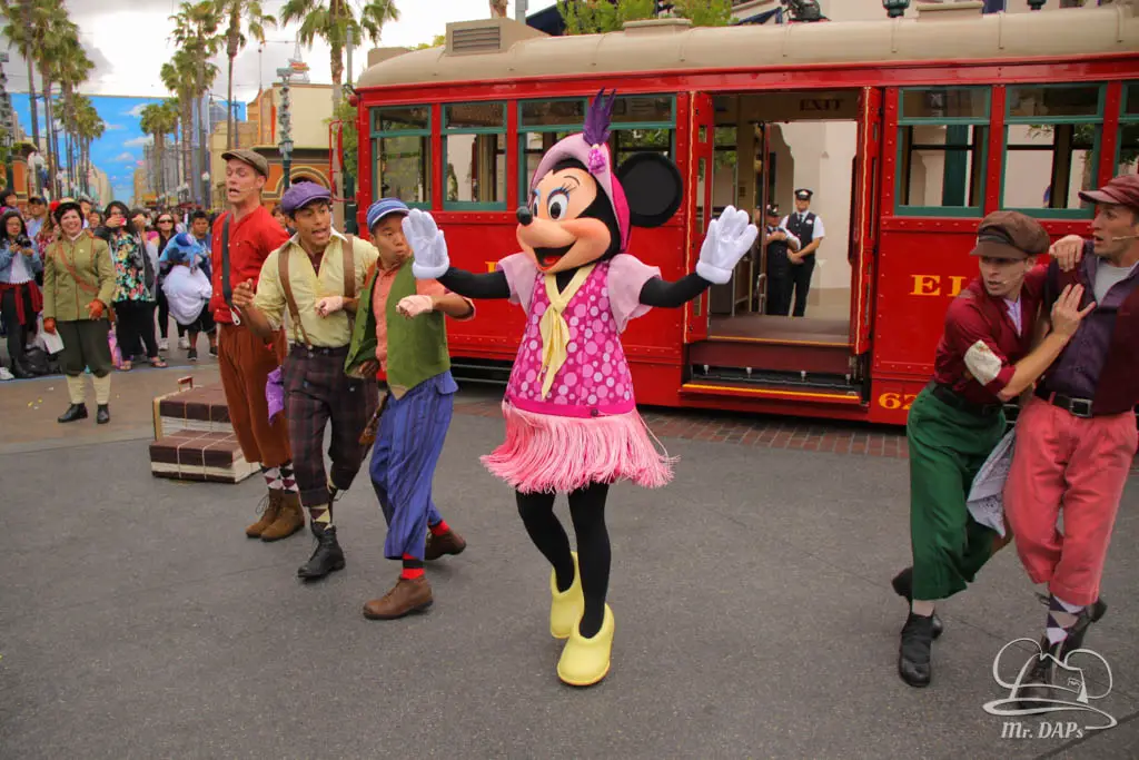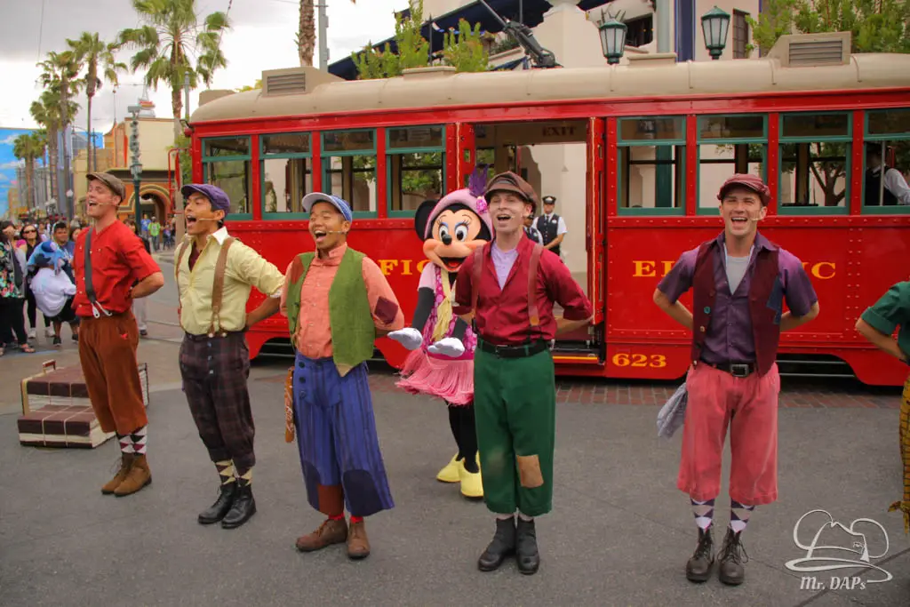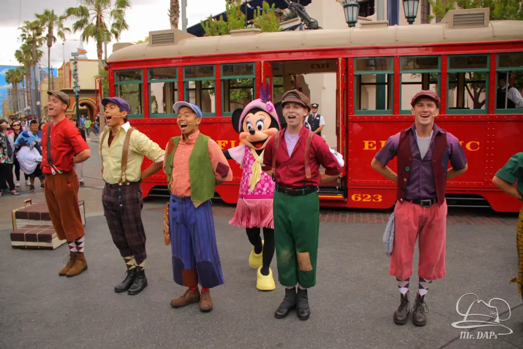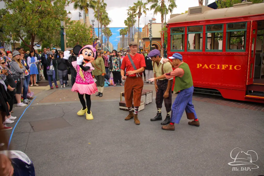Minnie Mouse can now be seen with Mickey Mouse and the Red Car Trolley News Boys on Buena Vista Street daily. With so many things going on with Disneyland’s 60th anniversary celebration, it would be easy to miss some of the many additions to some of the entertainment offerings at the Disneyland Resort. During the 24 hour day at the Disneyland Resort, one of these additions was a new song that helped bring Minnie Mouse into this popular Disney California Adventure show.
