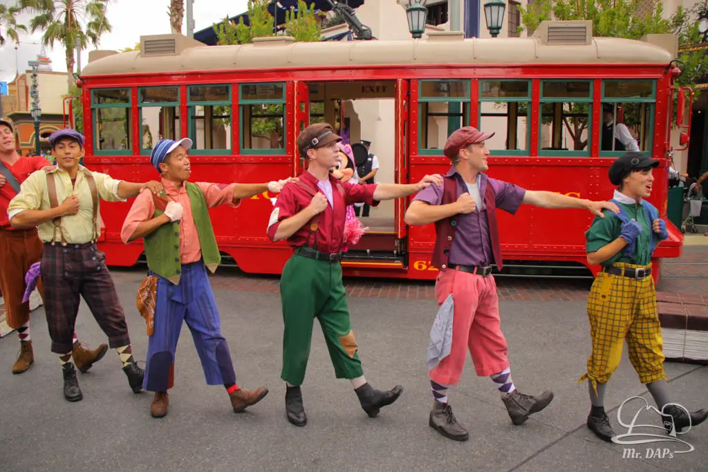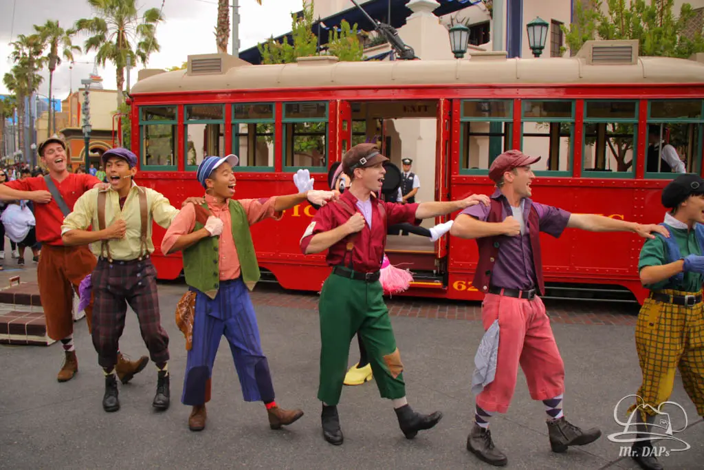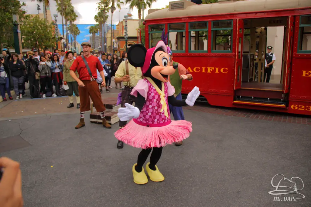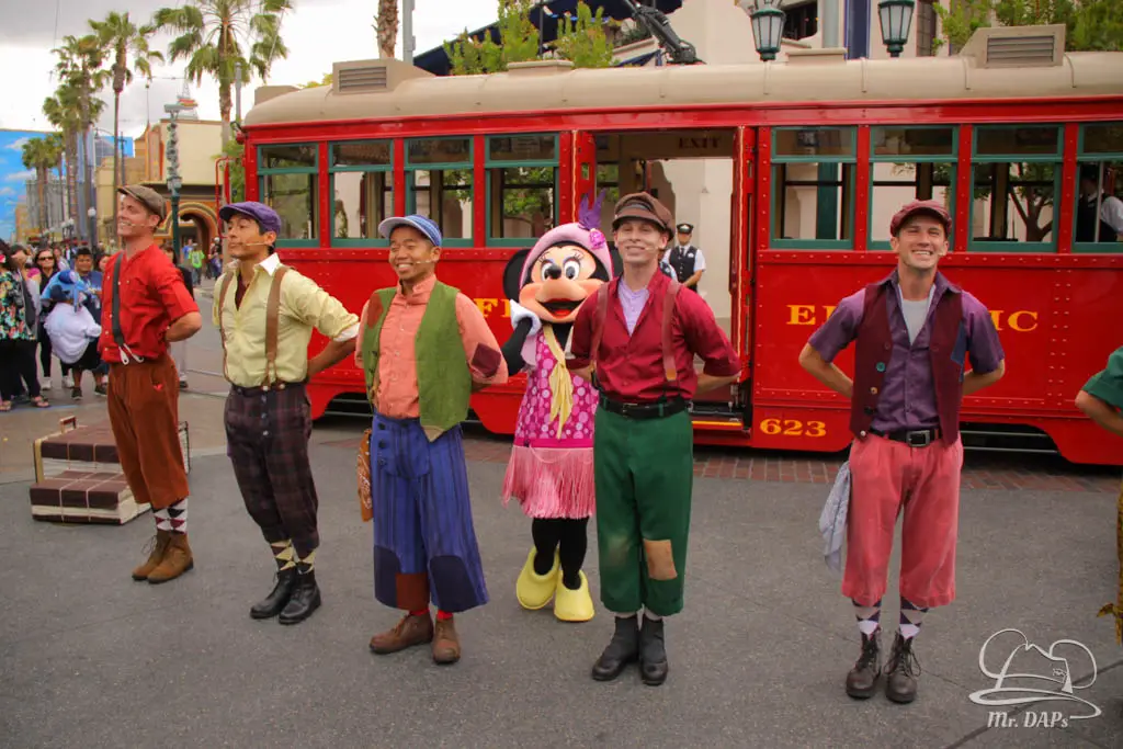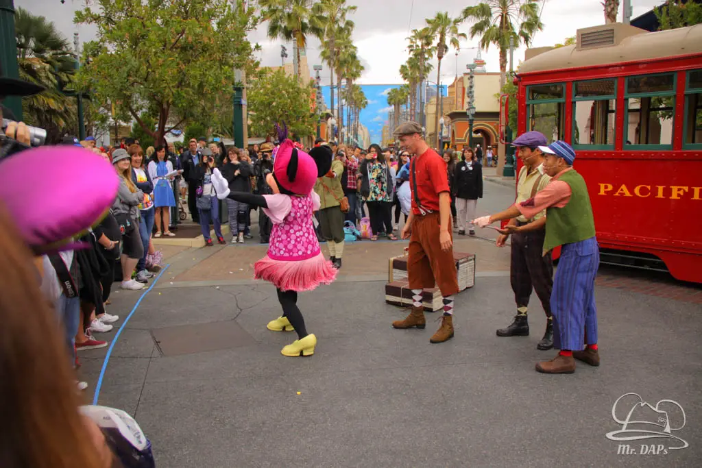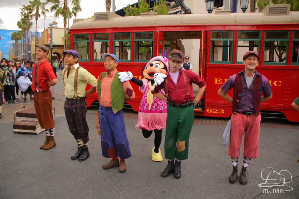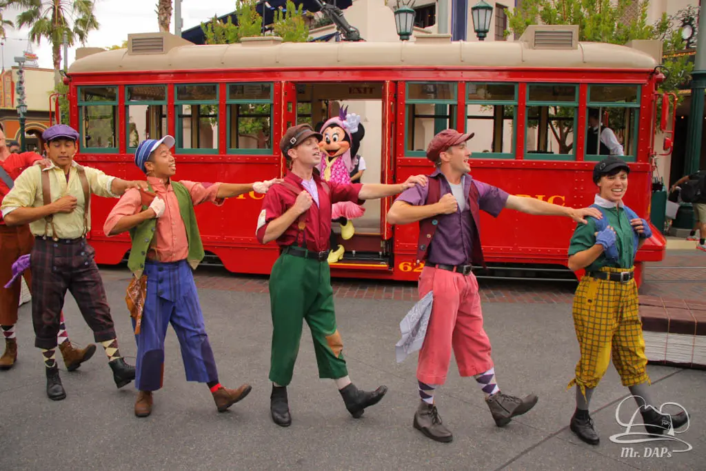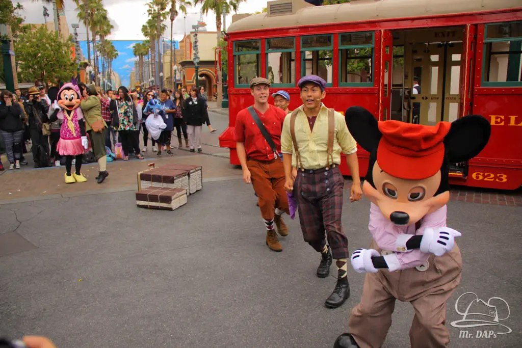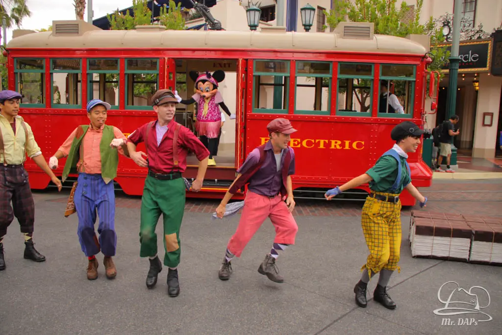 Minnie Mouse can now be seen with Mickey Mouse and the Red Car Trolley News Boys on Buena Vista Street daily. With so many things going on with Disneyland’s 60th anniversary celebration, it would be easy to miss some of the many additions to some of the entertainment offerings at the Disneyland Resort. During the 24 hour day at the Disneyland Resort, one of these additions was a new song that helped bring Minnie Mouse into this popular Disney California Adventure show.