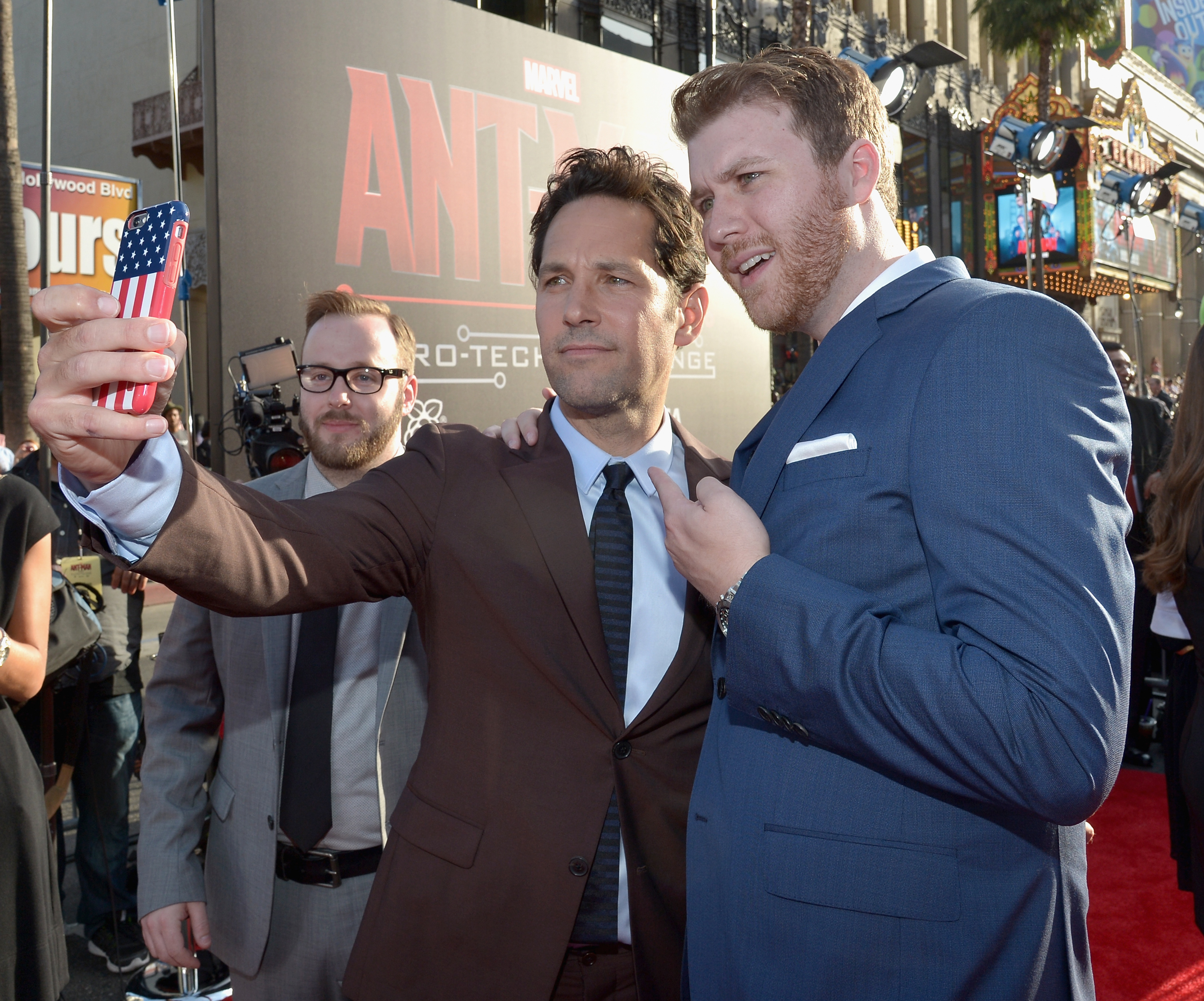 LOS ANGELES, CA – JUNE 29: Actor Paul Rudd (C) takes a selfie at the OMAZE booth at the world premiere of Marvel’s “Ant-Man” at The Dolby Theatre on June 29, 2015 in Los Angeles, California. (Photo by Charley Gallay/Getty Images) *** Local Caption *** Paul Rudd
