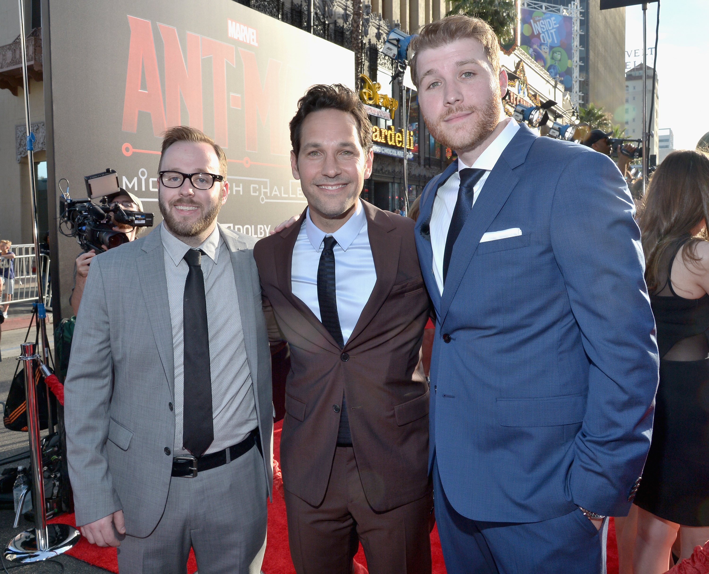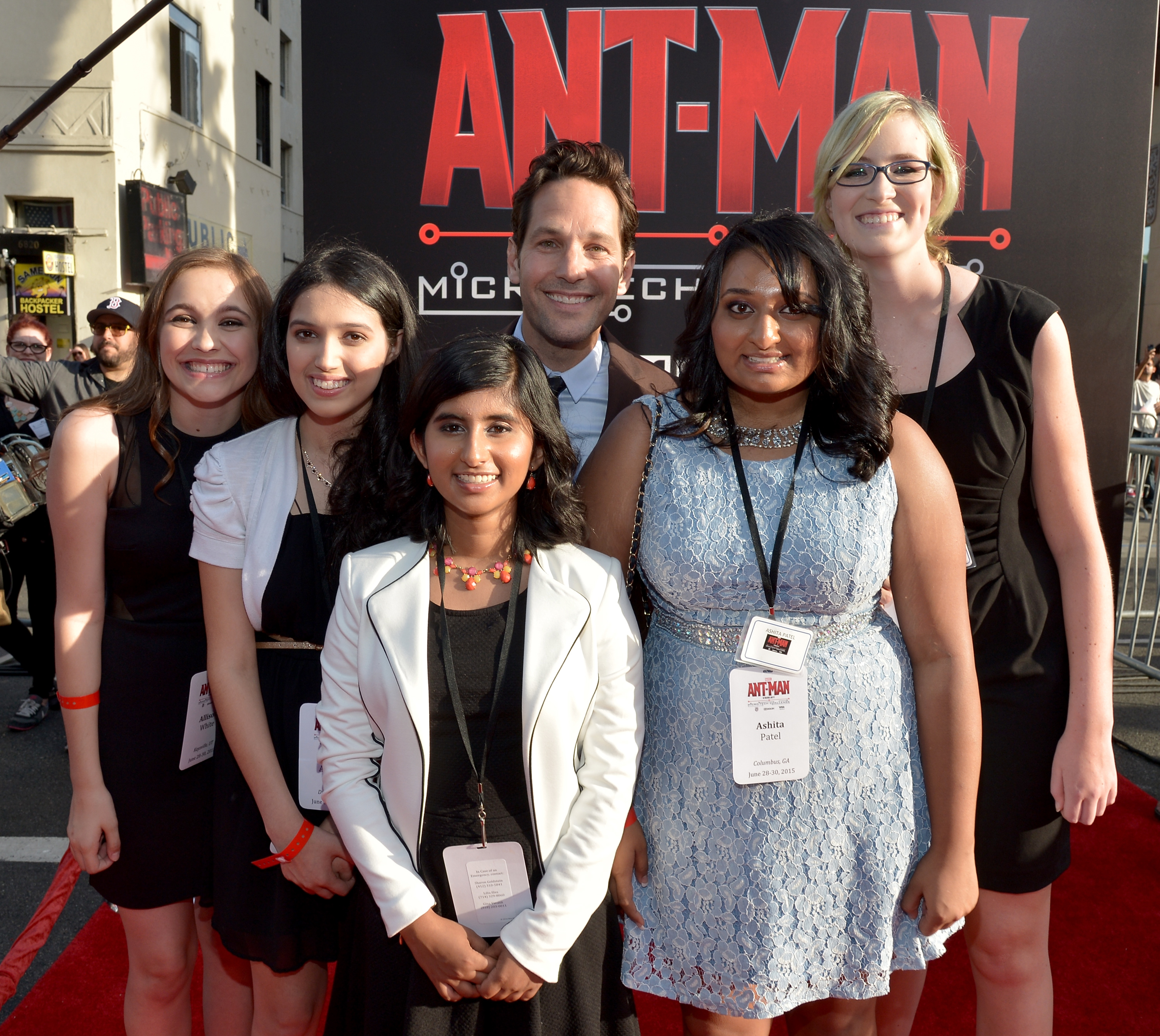 LOS ANGELES, CA – JUNE 29: Actor Paul Rudd (L) with Micro-Tech Challenge contest winners attend the world premiere of Marvel’s “Ant-Man” at The Dolby Theatre on June 29, 2015 in Los Angeles, California. (Photo by Charley Gallay/Getty Images) *** Local Caption *** Paul Rudd