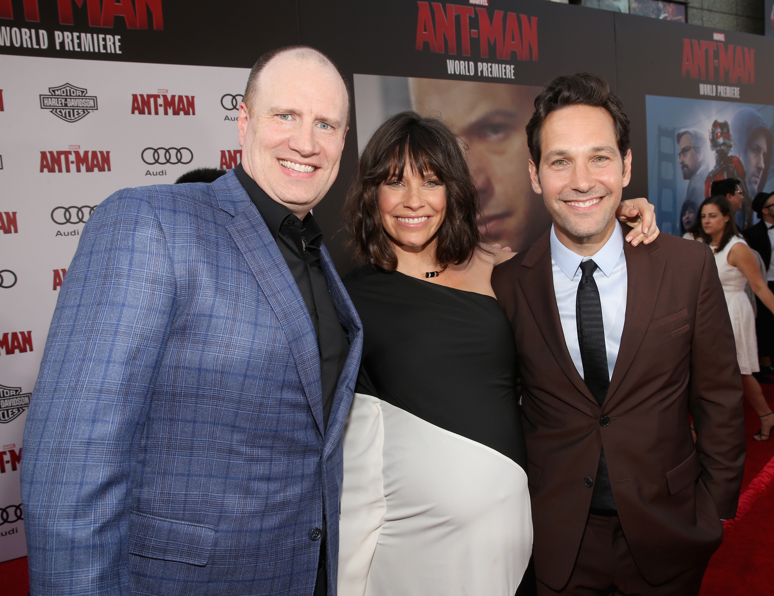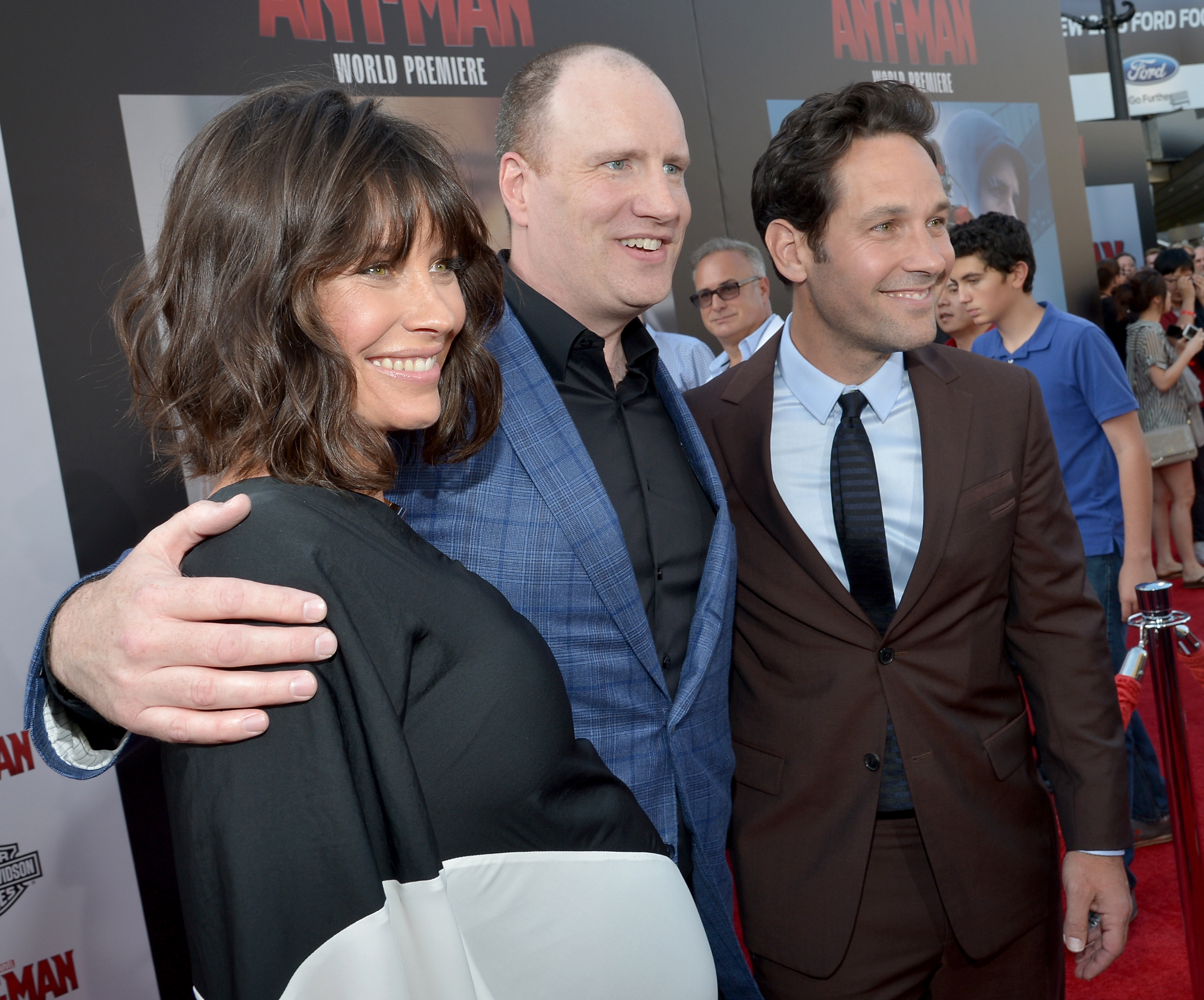 LOS ANGELES, CA – JUNE 29: (L-R) Producer Kevin Feige and actors Evangeline Lilly and Paul Rudd attend the world premiere of Marvel’s “Ant-Man” at The Dolby Theatre on June 29, 2015 in Los Angeles, California. (Photo by Jesse Grant/Getty Images for Disney) *** Local Caption *** Kevin Feige;Evangeline Lilly;Paul Rudd