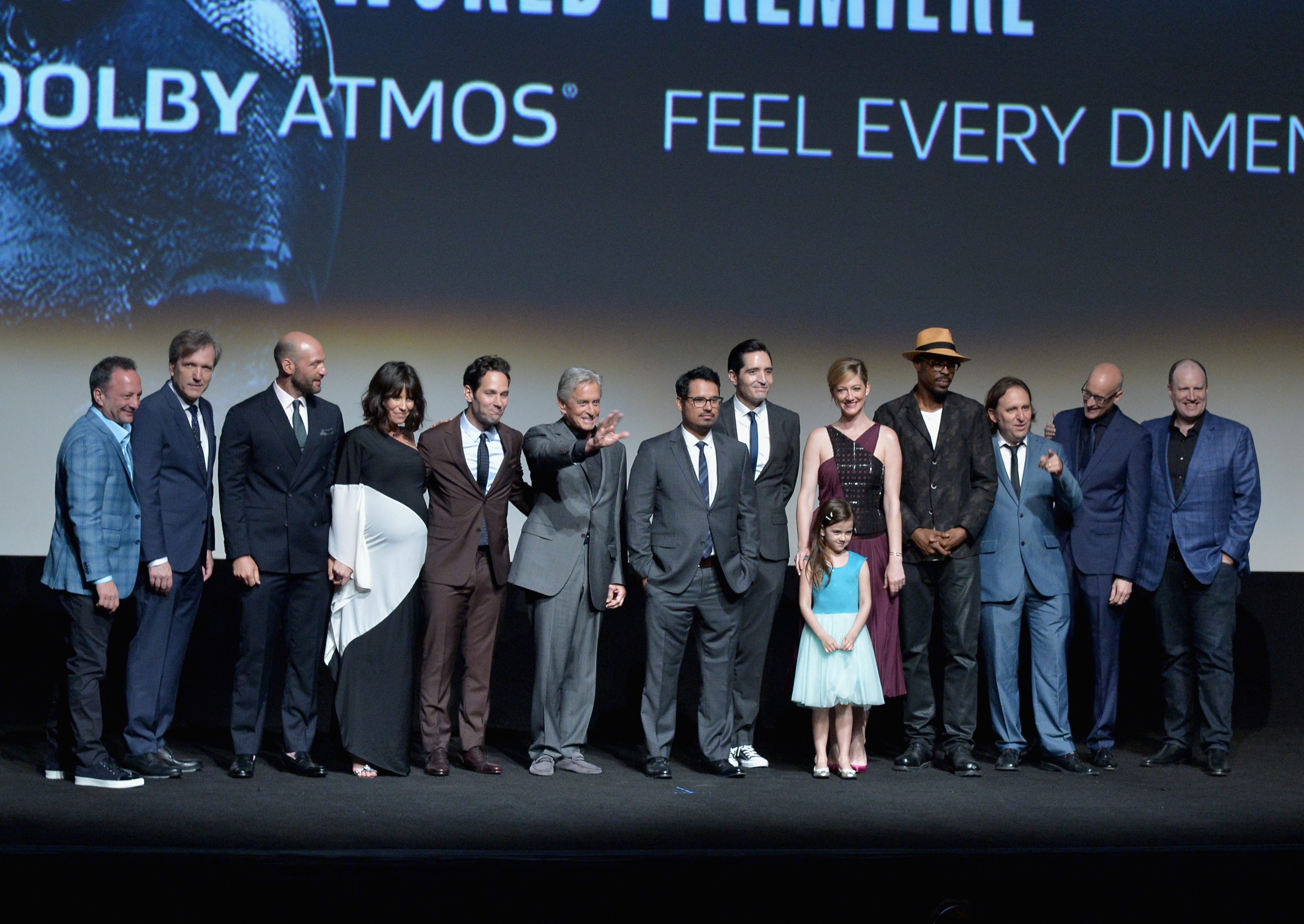LOS ANGELES, CA – JUNE 29: (L-R) Executive producer Louis D’Esposito, actors Martin Donovan, Corey Stoll, Evangeline Lilly, Paul Rudd, Michael Douglas, Michael Pena, David Dastmalchian, Abby Ryder Fortson, Judy Greer, Wood Harris and Gregg Turkington, director Director Peyton Reed and producer Kevin Feige onstage during the world premiere of Marvel’s “Ant-Man” at The Dolby Theatre on June 29, 2015 in Los Angeles, California. (Photo by Jesse Grant/Getty Images for Disney) *** Local Caption *** Louis D’Esposito;Martin Donovan;Corey Stoll;Evangeline Lilly;Paul Rudd;Michael Douglas;Michael Pena;David Dastmalchian;Abby Ryder Fortson;Judy Greer;Wood Harris;Gregg Turkington;Peyton Reed;Kevin Feige
