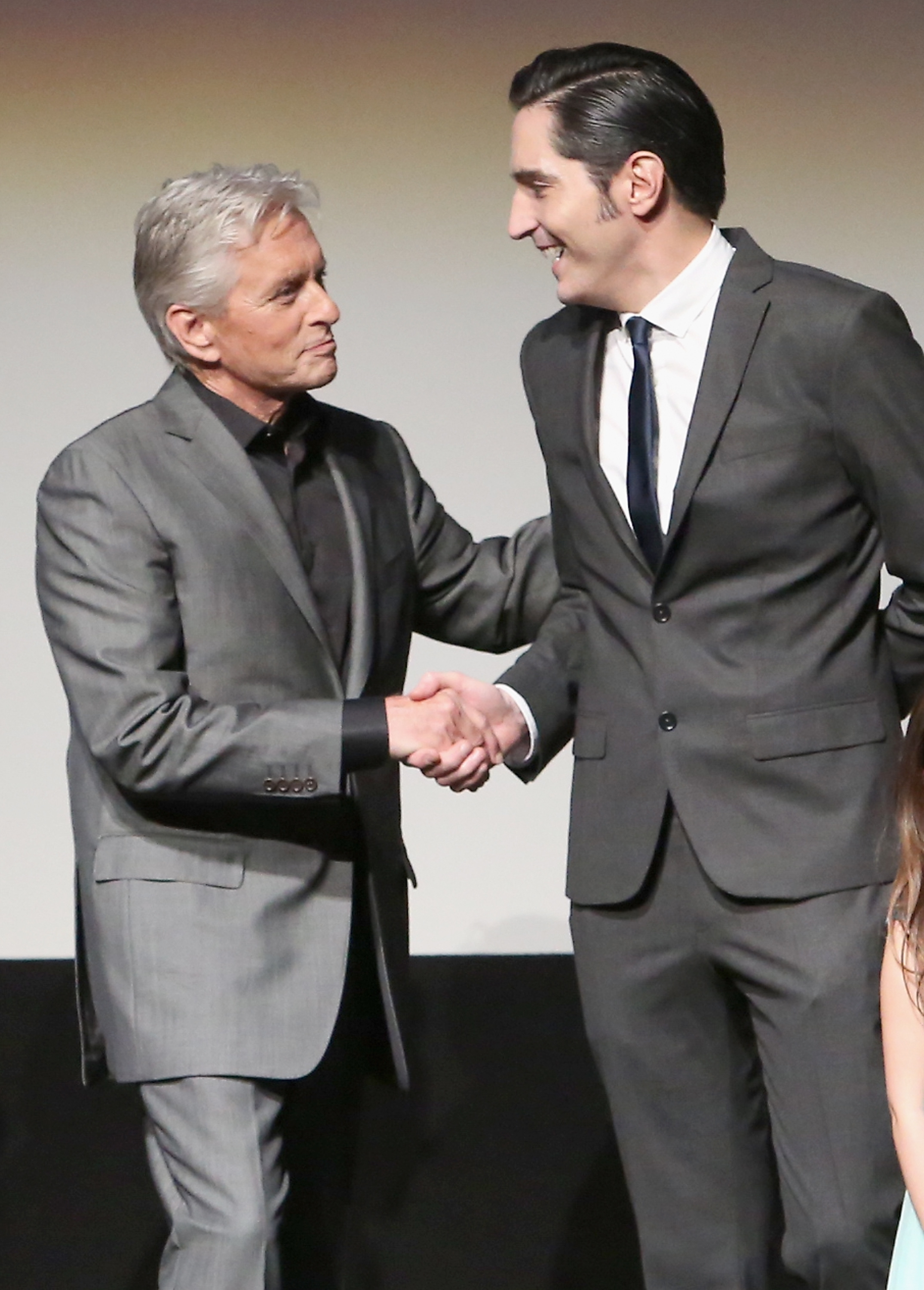 LOS ANGELES, CA – JUNE 29: Actors Michael Douglas (L) and David Dastmalchian onstage during the world premiere of Marvel’s “Ant-Man” at The Dolby Theatre on June 29, 2015 in Los Angeles, California. (Photo by Jesse Grant/Getty Images for Disney) *** Local Caption *** Michael Douglas;David Dastmalchian