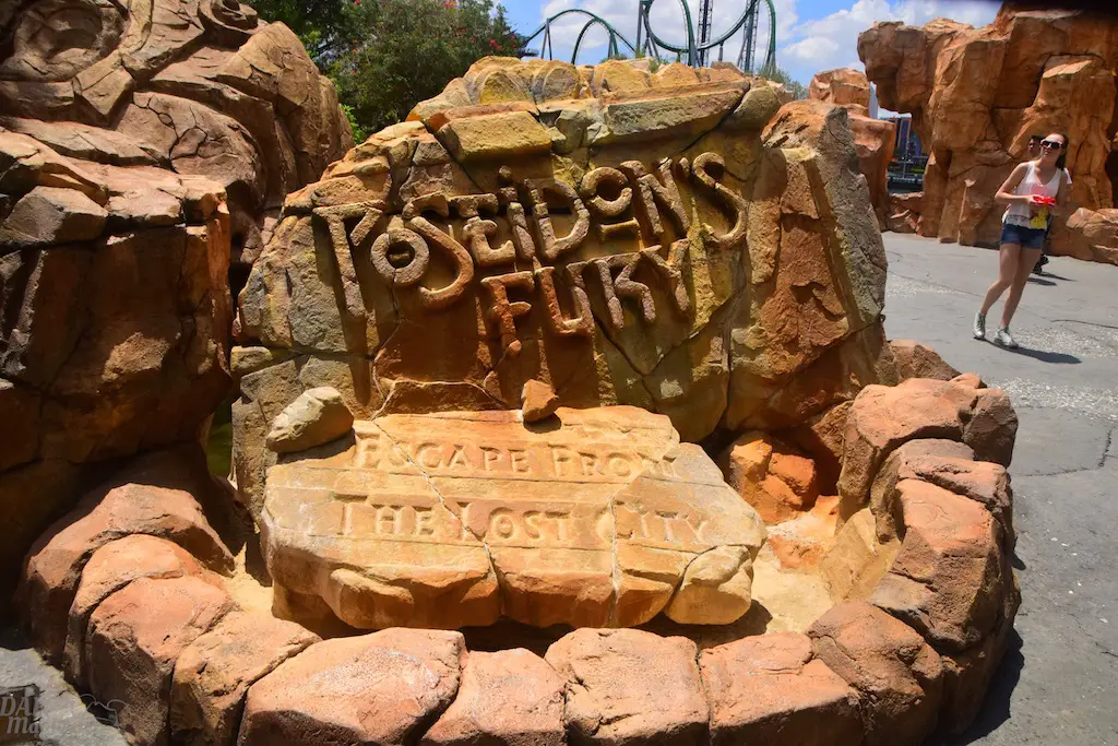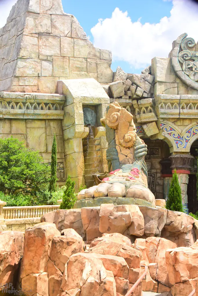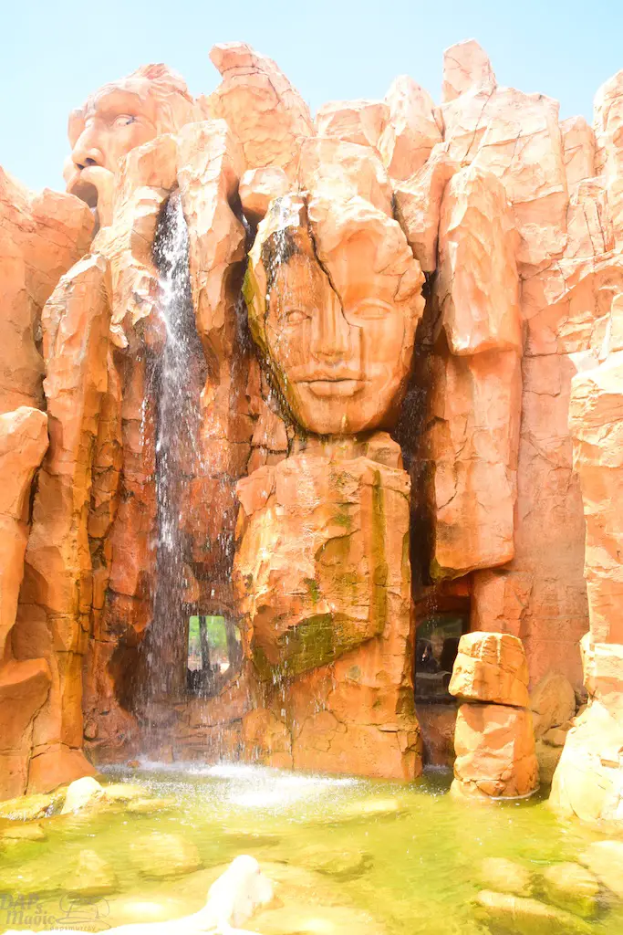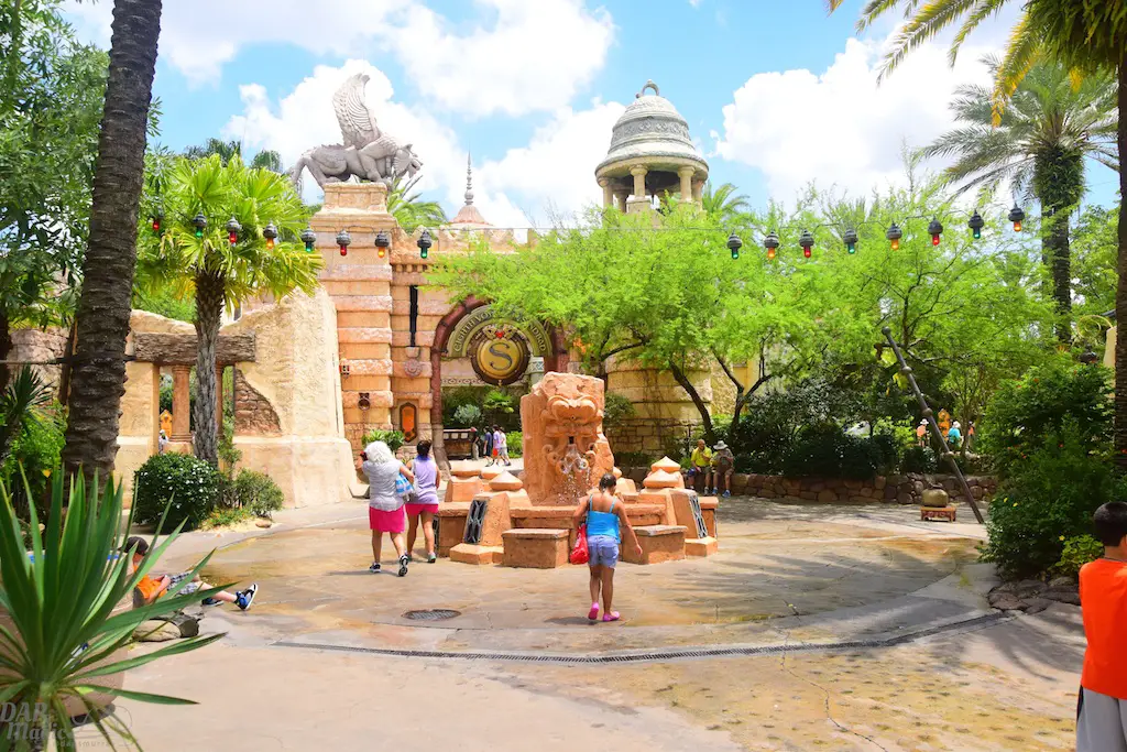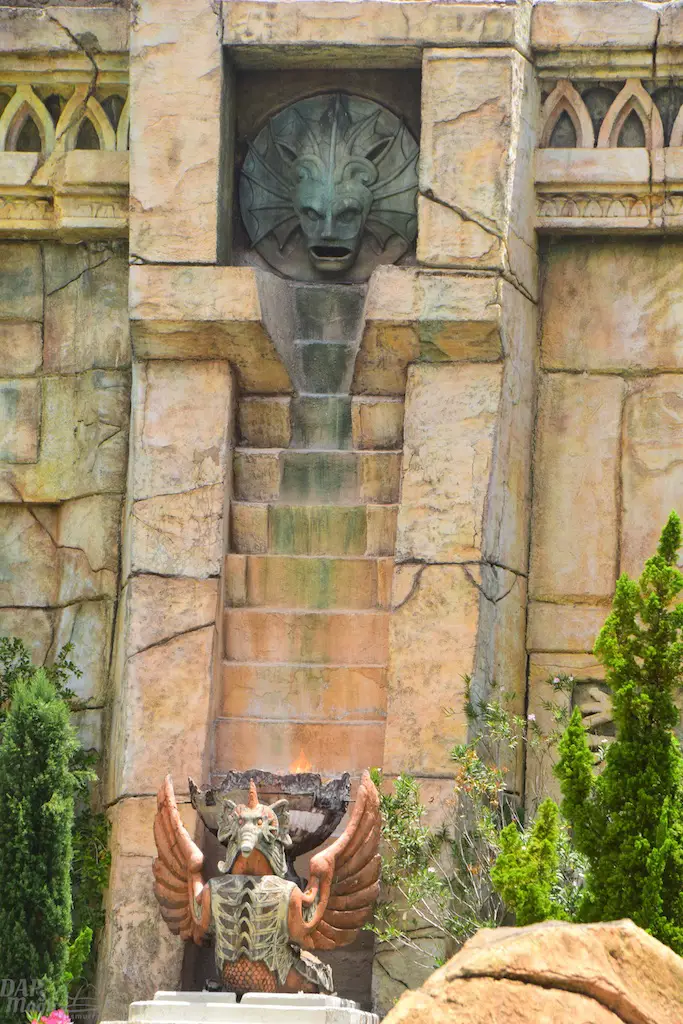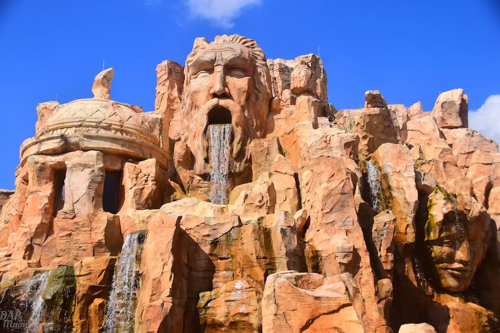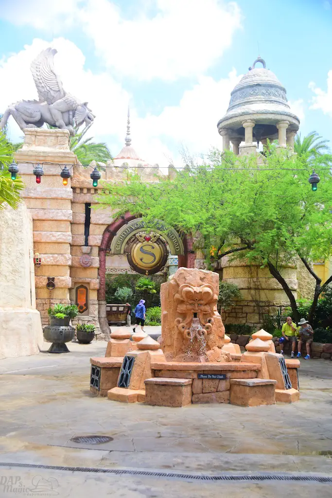 Right outside of Seuss Landing is Lost Continent, which had been a bit bigger when the park first started. Wizarding World absorbed the Medieval area of the island. Still, it’s quite the area. Upon entering from Seuss Landing, guests are greeted by a huge carved out mountain with a waterfall. Inside is the highly praised restaurant, Mythos. Across from here is Poseidon’s Fury, a walk through show. After all these is the 8th Voyage of Sinbad show with the Mystical Fountain outside of it. I don’t know that I’d call the Mystical Fountain an attraction as much as an interaction. It had a way to talk to guests. Sinbad was the one thing I did not experience here.
