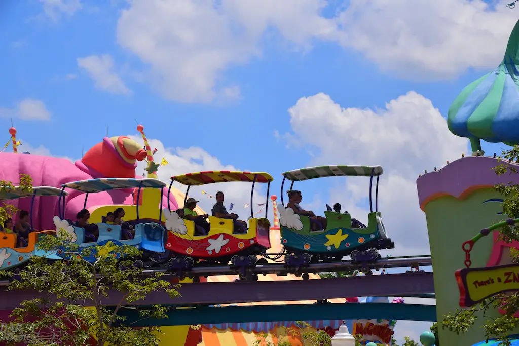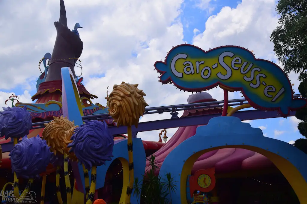 The two that I did not go on are Caro-Seuss-el and If I Ran the Zoo, although Zoo was more of a playground than a ride. One Fish, Two Fish, Red Fish, Blue Fish is a flying ride in the style of Dumbo. The twist is that there is potential to get wet. A song plays that instructs how not to, although I was confused and got a little wet until I figured out a height where no water could reach me. Beware, it’s not at the top! It was a fun attraction! I liked the water twist to a classic ride. It was fun to figure out how to avoid the water, or for some people, how to get soaked. The song was cute and catchy.