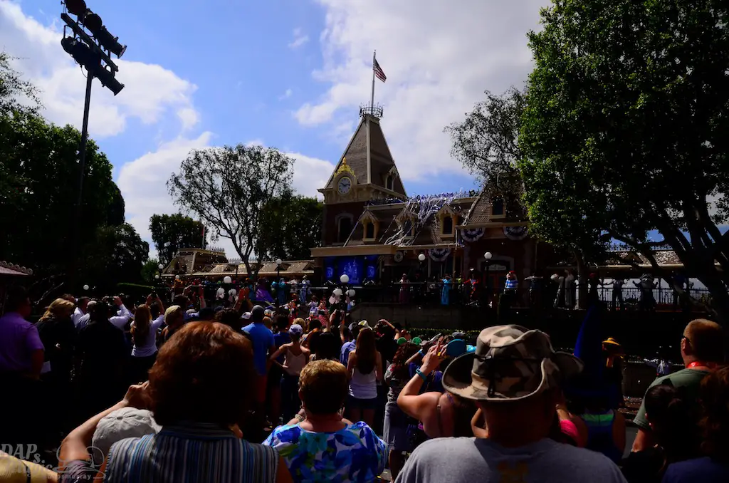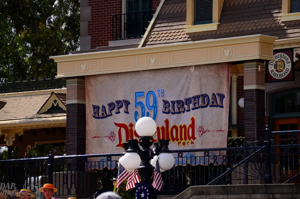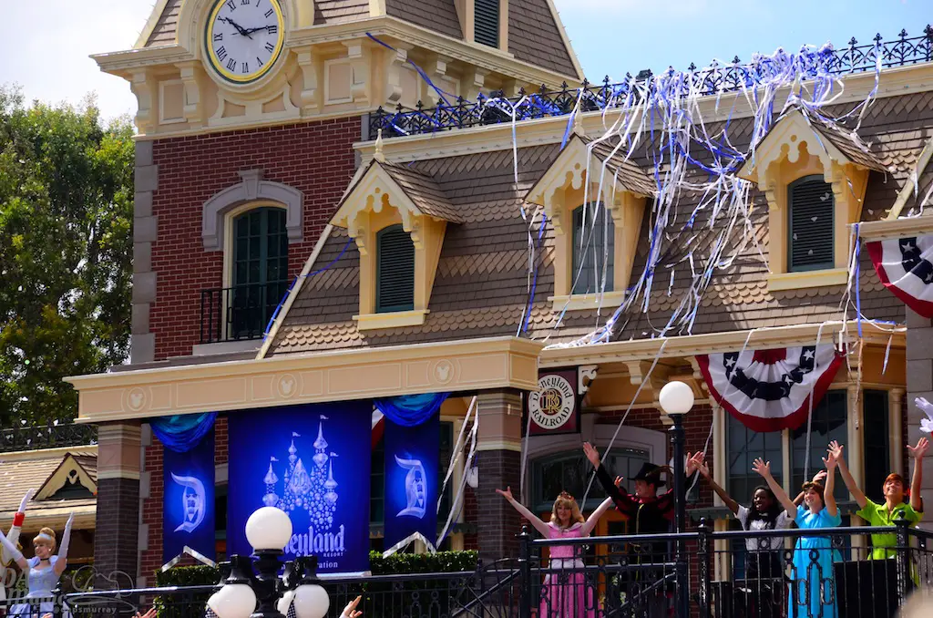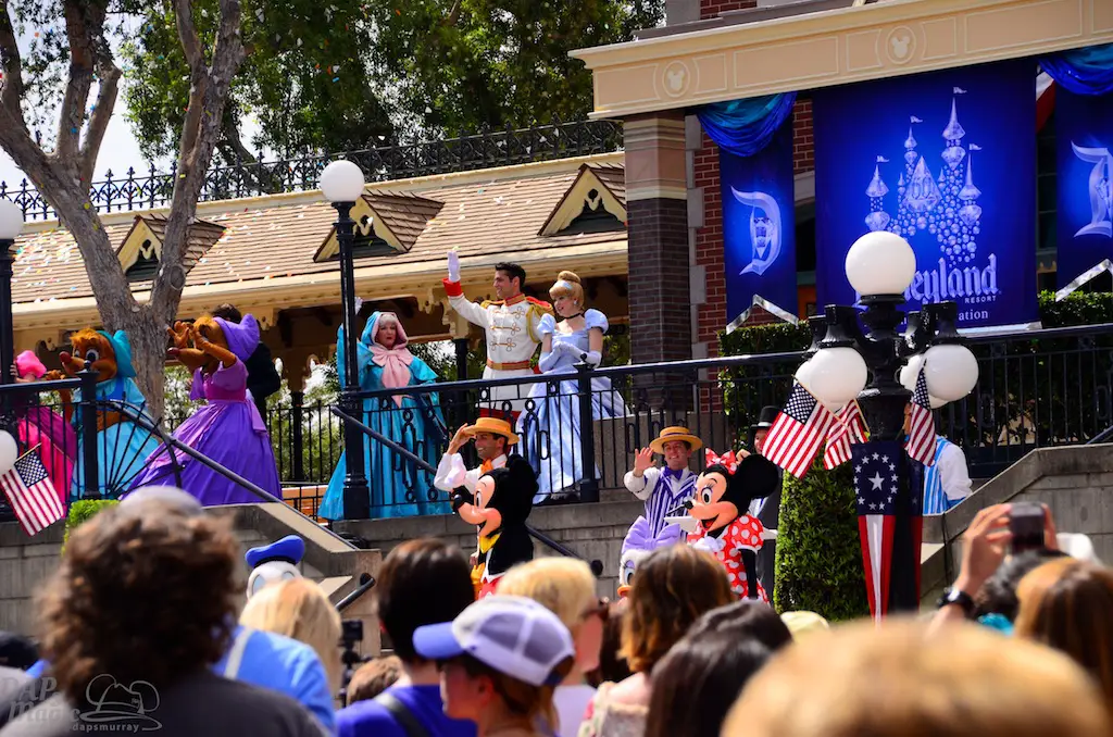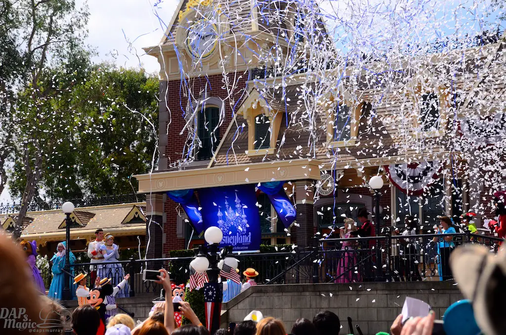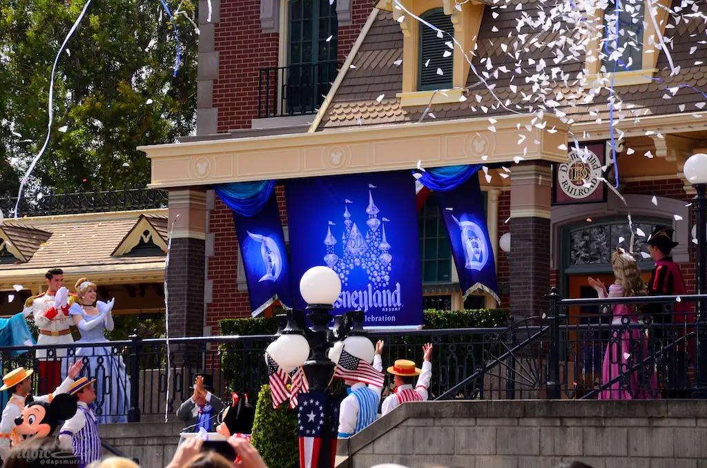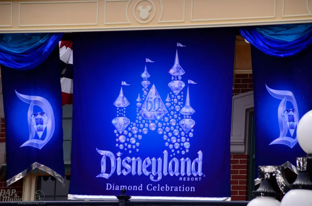The great ceremony to mark the 59th anniversary started with a sing-along of many beloved Disneyland songs. Characters paraded out to the train station, and the mayor of Main Street helped lead the birthday festivities. BUT, the real reason for having such a great presentation? The logo for the diamond anniversary, the 60th, was shown to all. Some guests were even escorted into the Opera House for a special party showing more about the 60th.