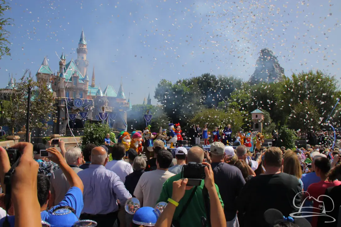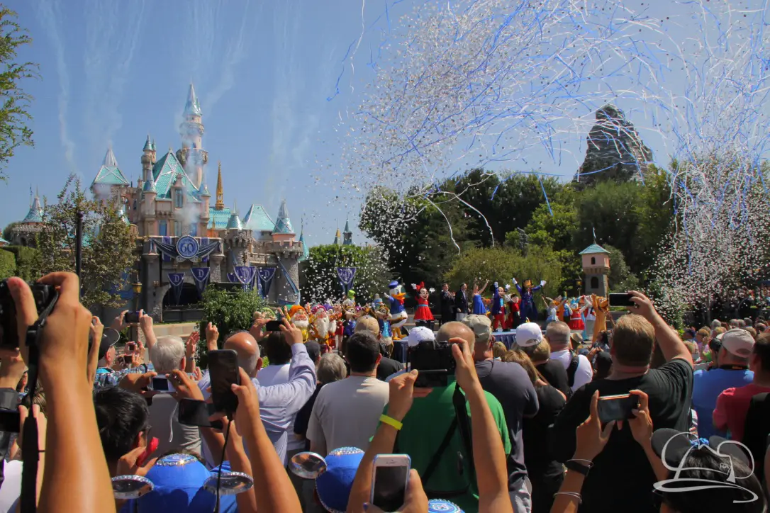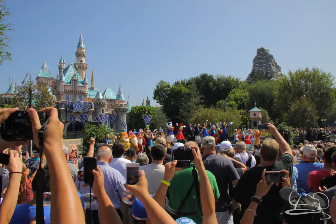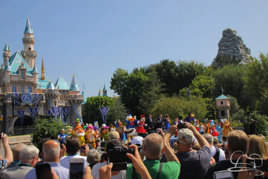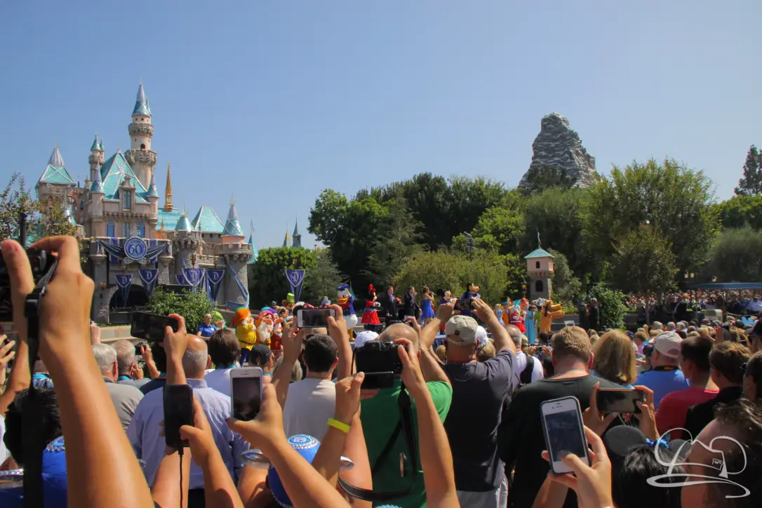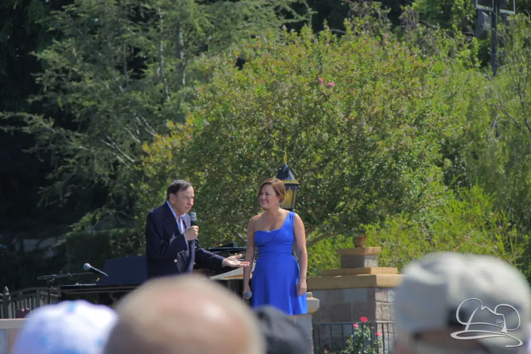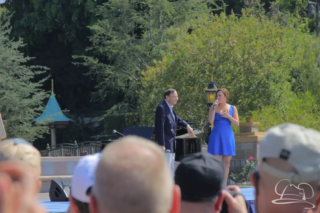 On July 17, 2015 Disneyland celebrated it’s 60th Anniversary. The day began with a short and sweet ceremony in front of Sleeping Beauty Castle at 10:00 AM. It was hosted by Disneyland President Michael Colglazier. It included the announcement of the the Million Dollar Dazzle where $1 million will be donated to local charities by the Disneyland Resort. The first charity to receive a grant was the Girl Scouts. The ceremony also included the recognition of Disney Legends and members of the Disney Family who were in attendance. The highlight for many was the beautiful rendition of Feed the Birds from Mary Poppins as sung by Ashley Brown who was accompanied on the piano by Richard Sherman. The ceremony ended with characters streaming around the small stage as all in attendance sang Happy Birthday to Disneyland.