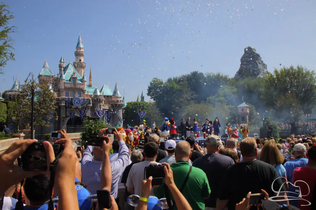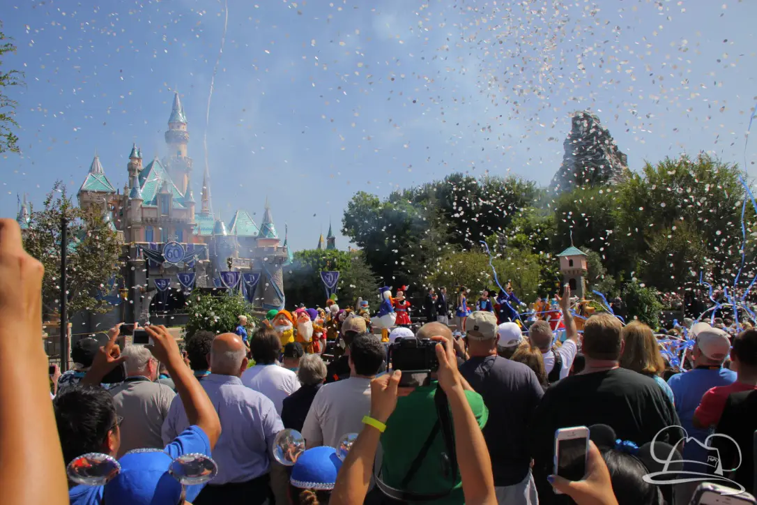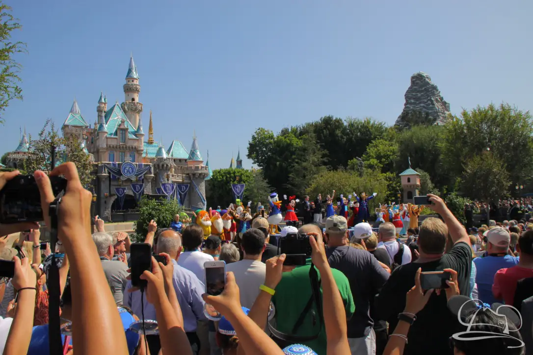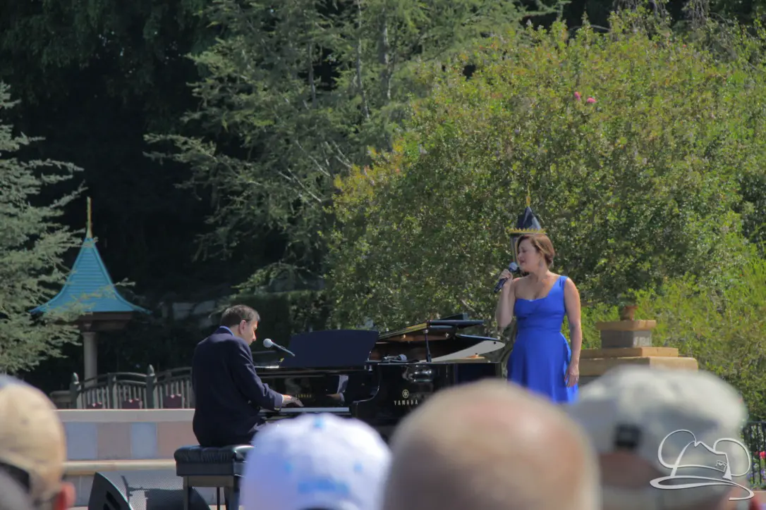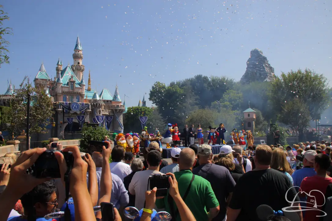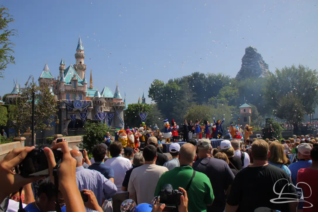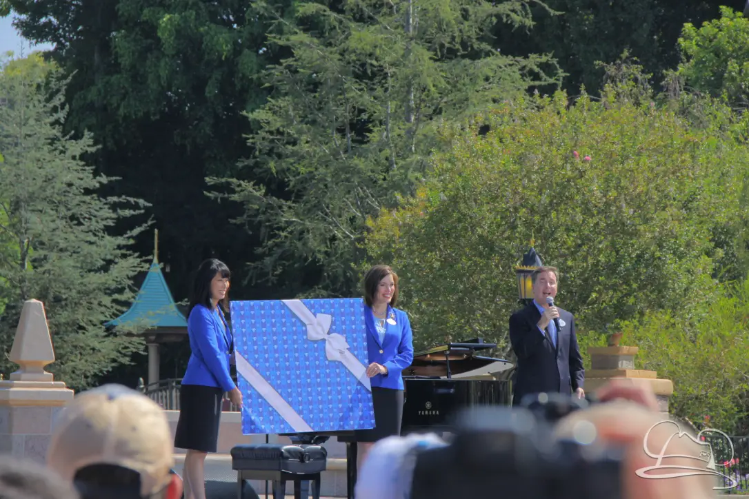 On July 17, 2015 Disneyland celebrated it’s 60th Anniversary. The day began with a short and sweet ceremony in front of Sleeping Beauty Castle at 10:00 AM. It was hosted by Disneyland President Michael Colglazier. It included the announcement of the the Million Dollar Dazzle where $1 million will be donated to local charities by the Disneyland Resort. The first charity to receive a grant was the Girl Scouts. The ceremony also included the recognition of Disney Legends and members of the Disney Family who were in attendance. The highlight for many was the beautiful rendition of Feed the Birds from Mary Poppins as sung by Ashley Brown who was accompanied on the piano by Richard Sherman. The ceremony ended with characters streaming around the small stage as all in attendance sang Happy Birthday to Disneyland.