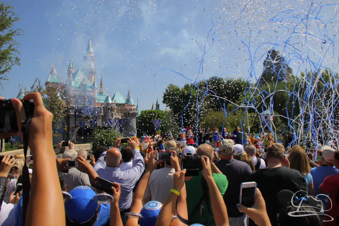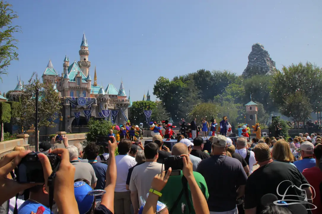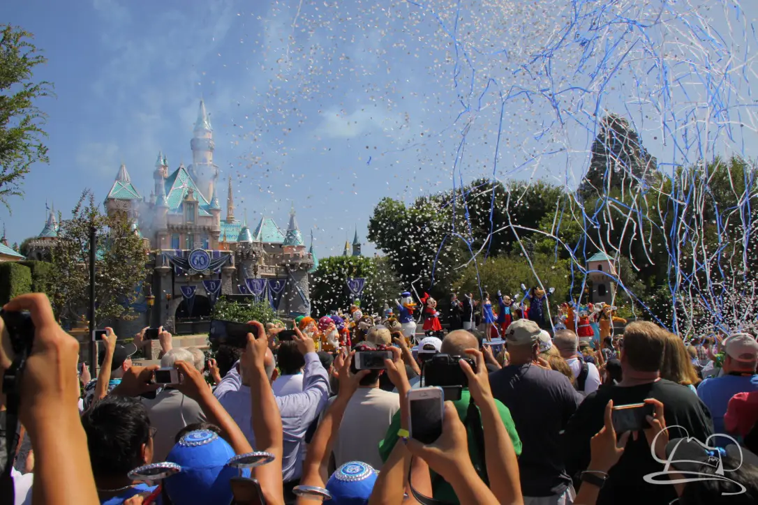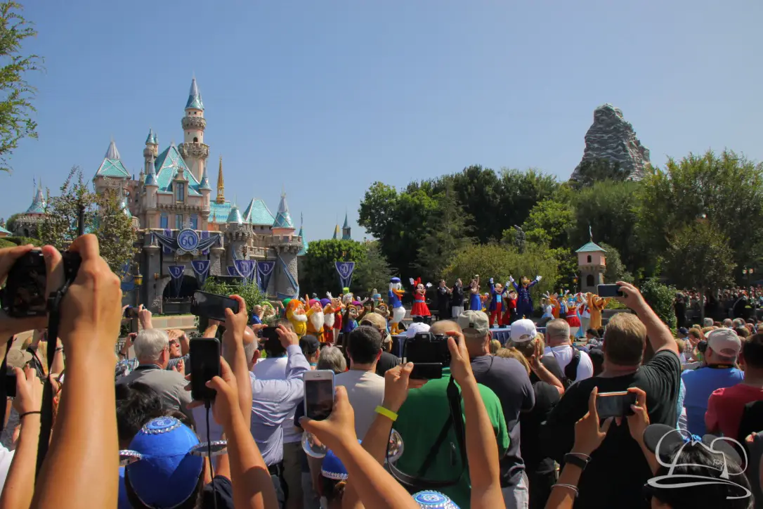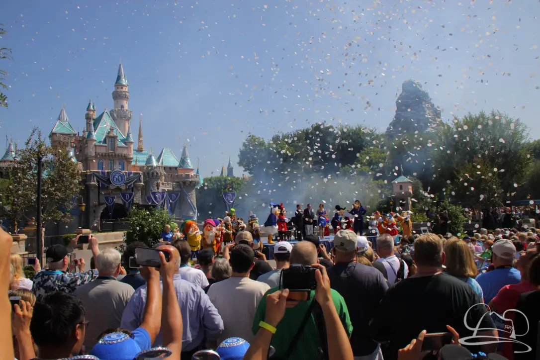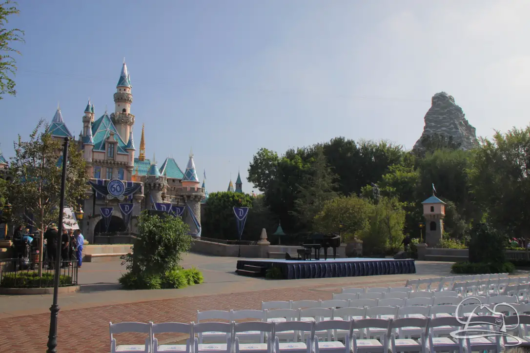 On July 17, 2015 Disneyland celebrated it’s 60th Anniversary. The day began with a short and sweet ceremony in front of Sleeping Beauty Castle at 10:00 AM. It was hosted by Disneyland President Michael Colglazier. It included the announcement of the the Million Dollar Dazzle where $1 million will be donated to local charities by the Disneyland Resort. The first charity to receive a grant was the Girl Scouts. The ceremony also included the recognition of Disney Legends and members of the Disney Family who were in attendance. The highlight for many was the beautiful rendition of Feed the Birds from Mary Poppins as sung by Ashley Brown who was accompanied on the piano by Richard Sherman. The ceremony ended with characters streaming around the small stage as all in attendance sang Happy Birthday to Disneyland.