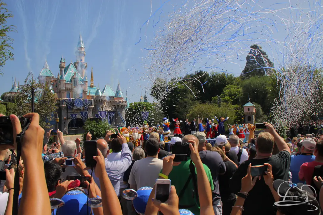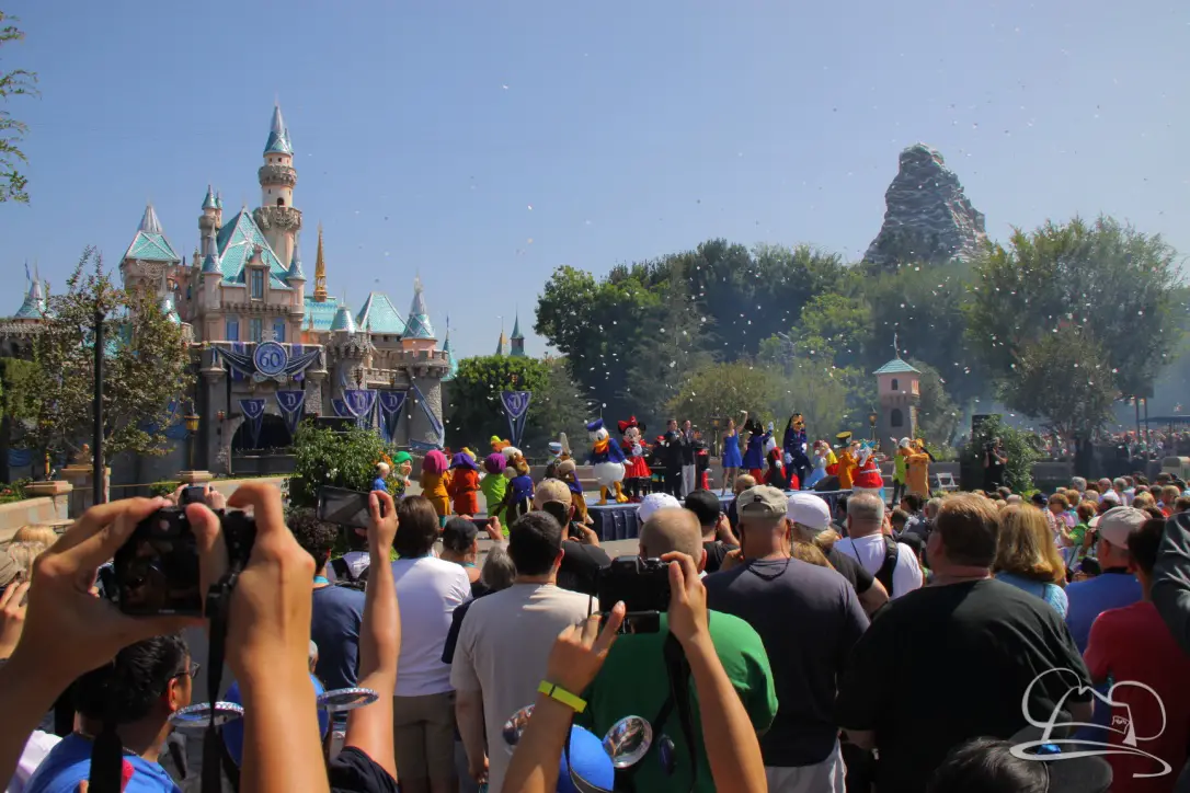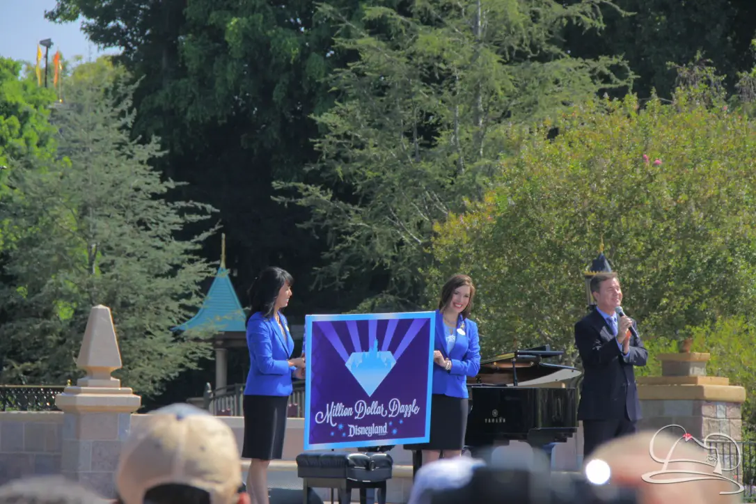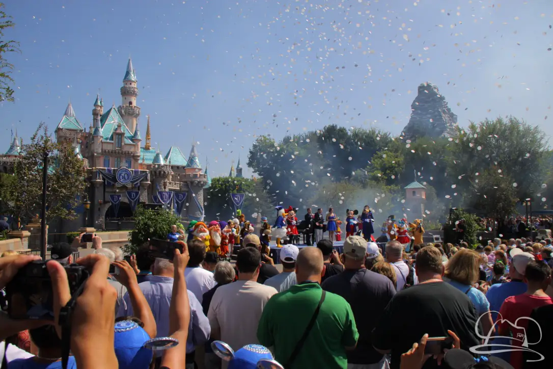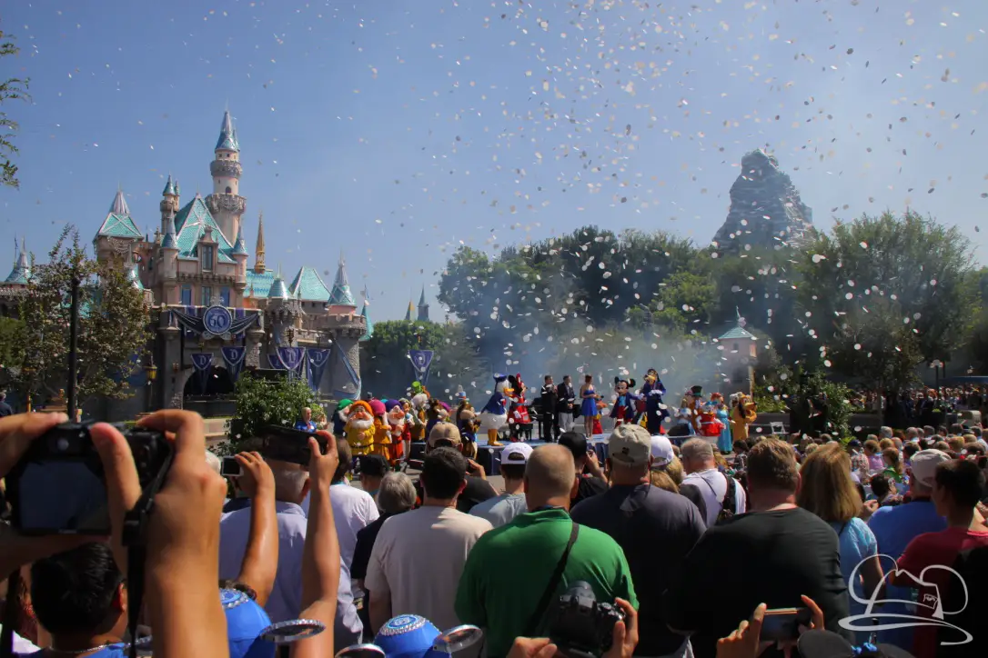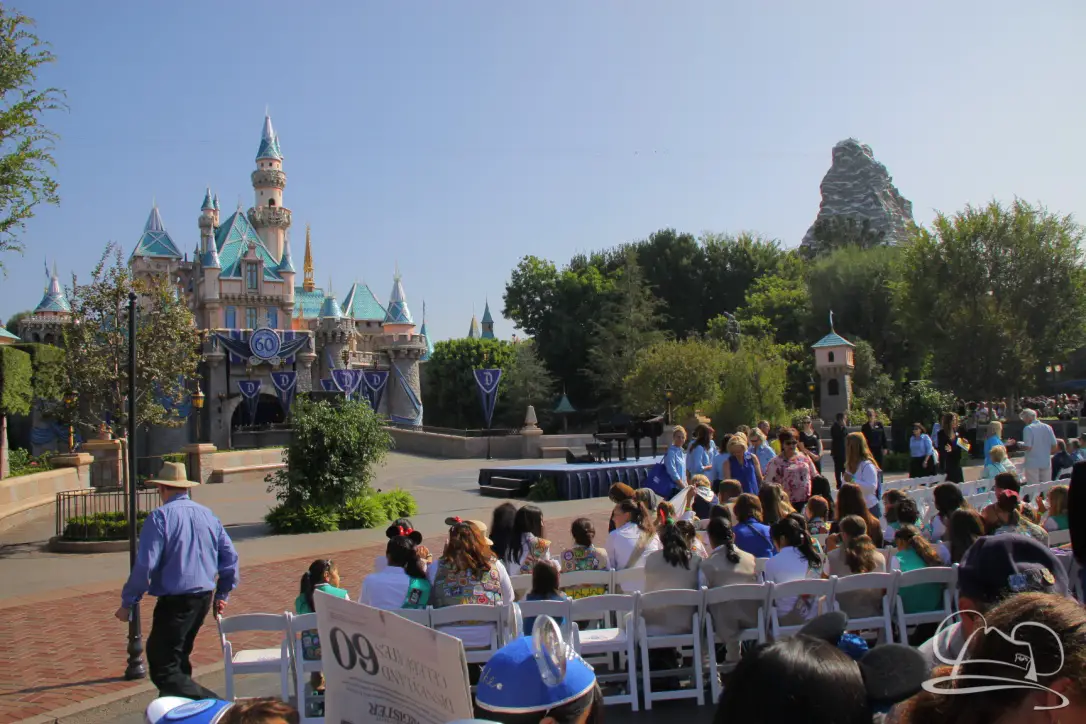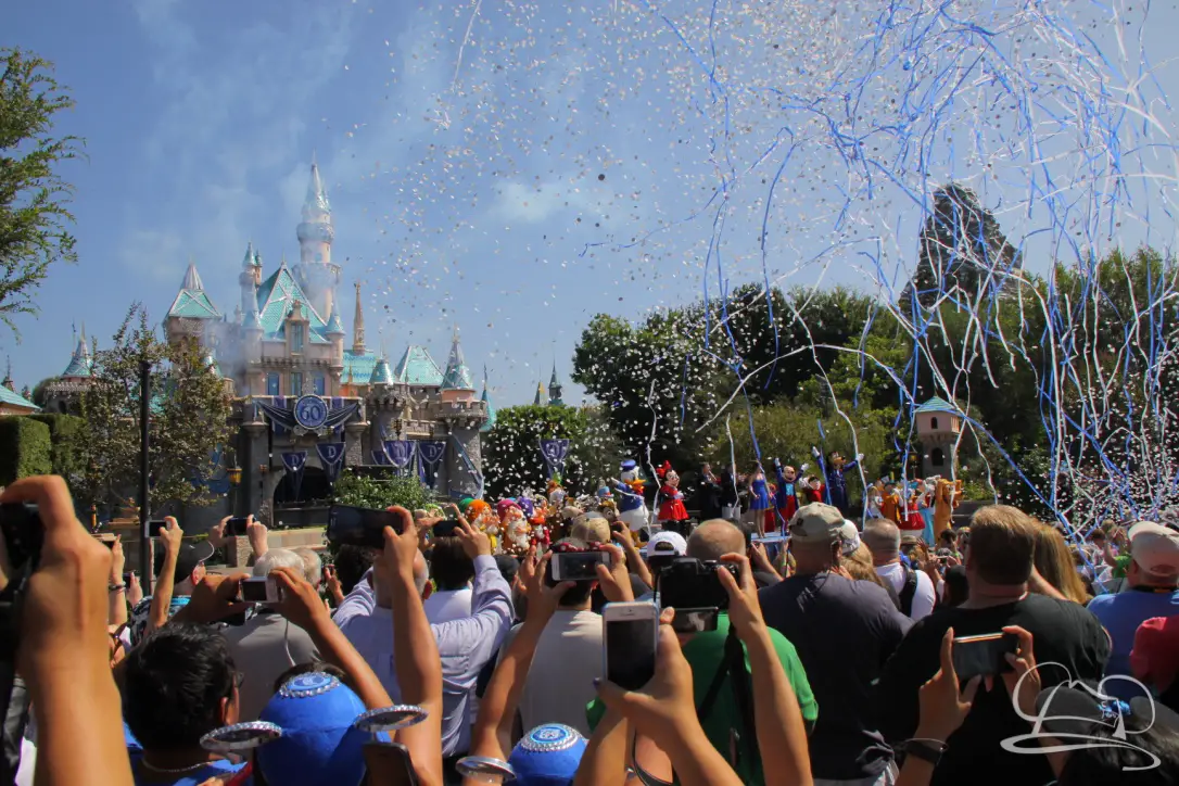 On July 17, 2015 Disneyland celebrated it’s 60th Anniversary. The day began with a short and sweet ceremony in front of Sleeping Beauty Castle at 10:00 AM. It was hosted by Disneyland President Michael Colglazier. It included the announcement of the the Million Dollar Dazzle where $1 million will be donated to local charities by the Disneyland Resort. The first charity to receive a grant was the Girl Scouts. The ceremony also included the recognition of Disney Legends and members of the Disney Family who were in attendance. The highlight for many was the beautiful rendition of Feed the Birds from Mary Poppins as sung by Ashley Brown who was accompanied on the piano by Richard Sherman. The ceremony ended with characters streaming around the small stage as all in attendance sang Happy Birthday to Disneyland.