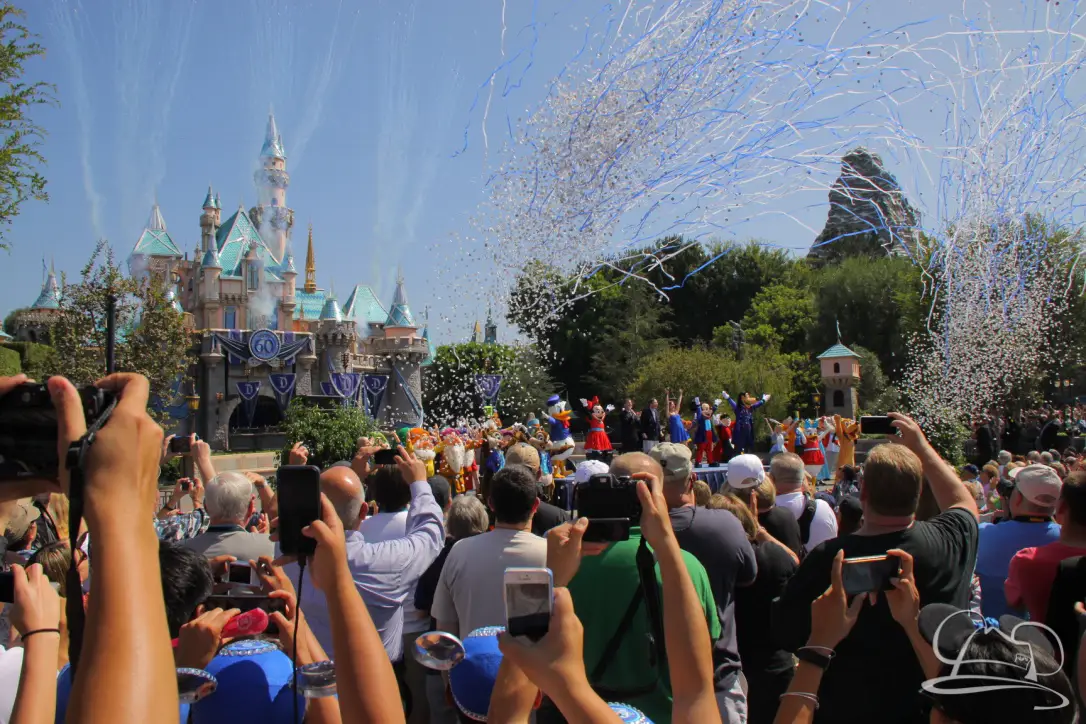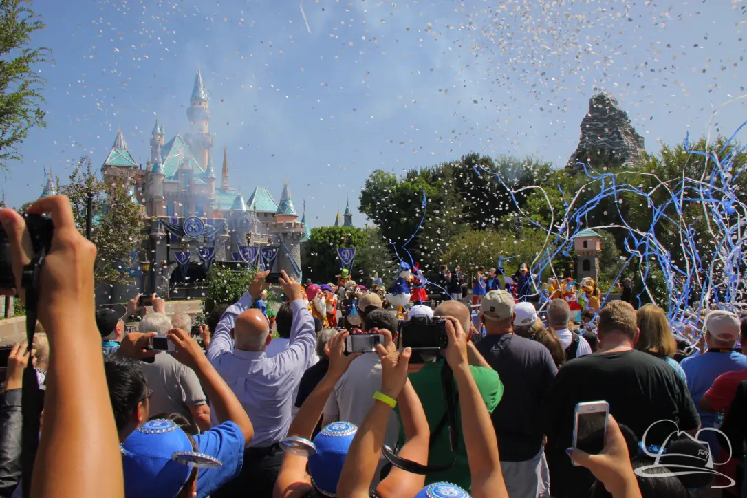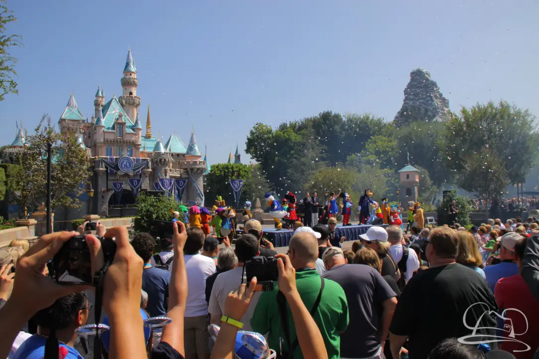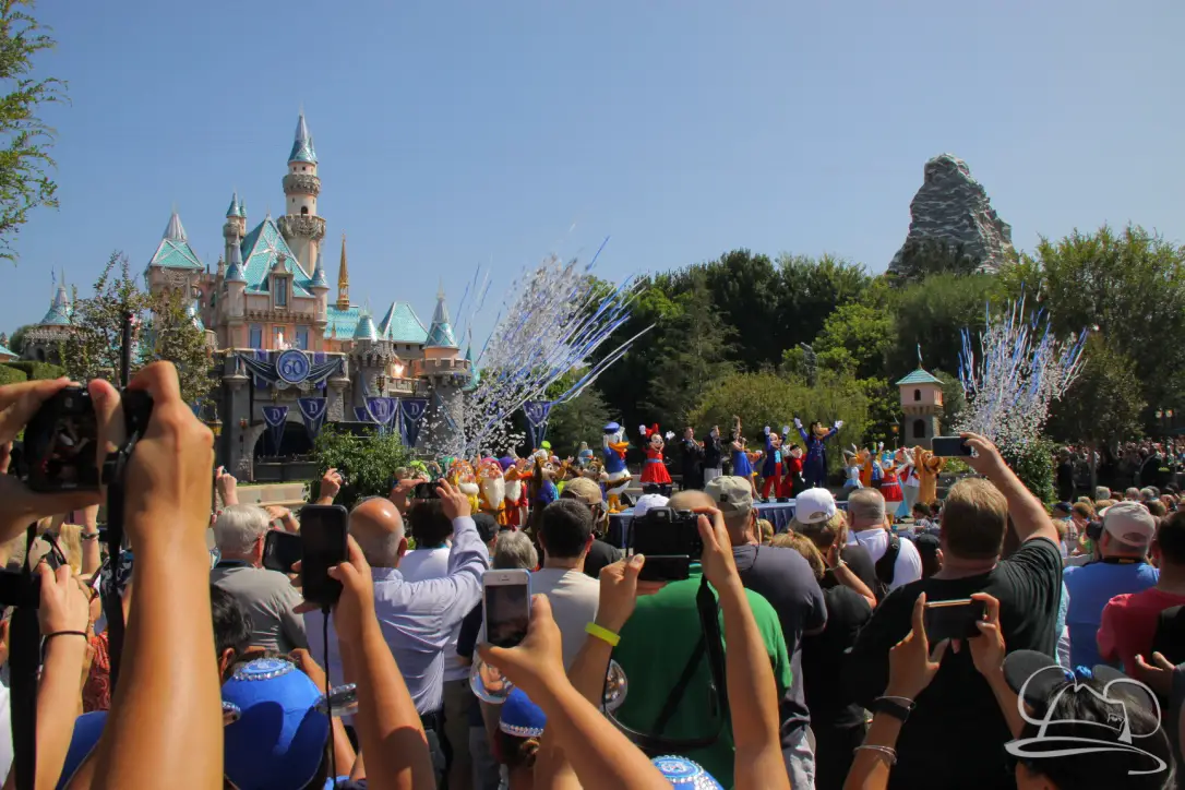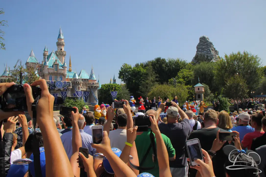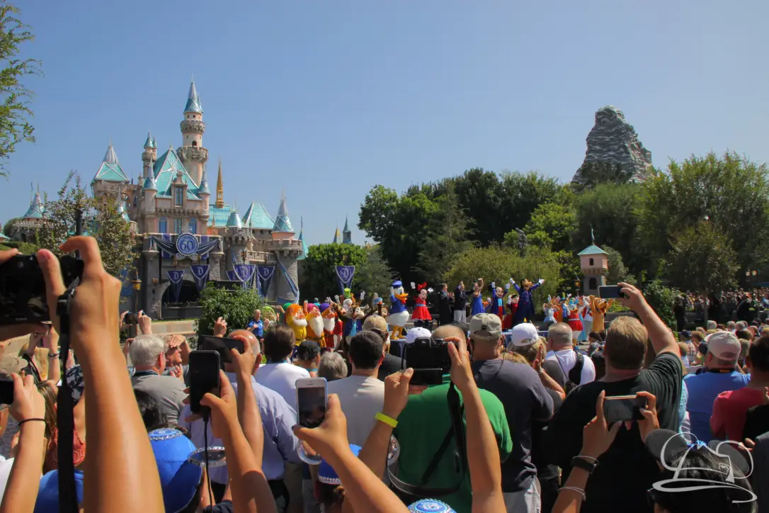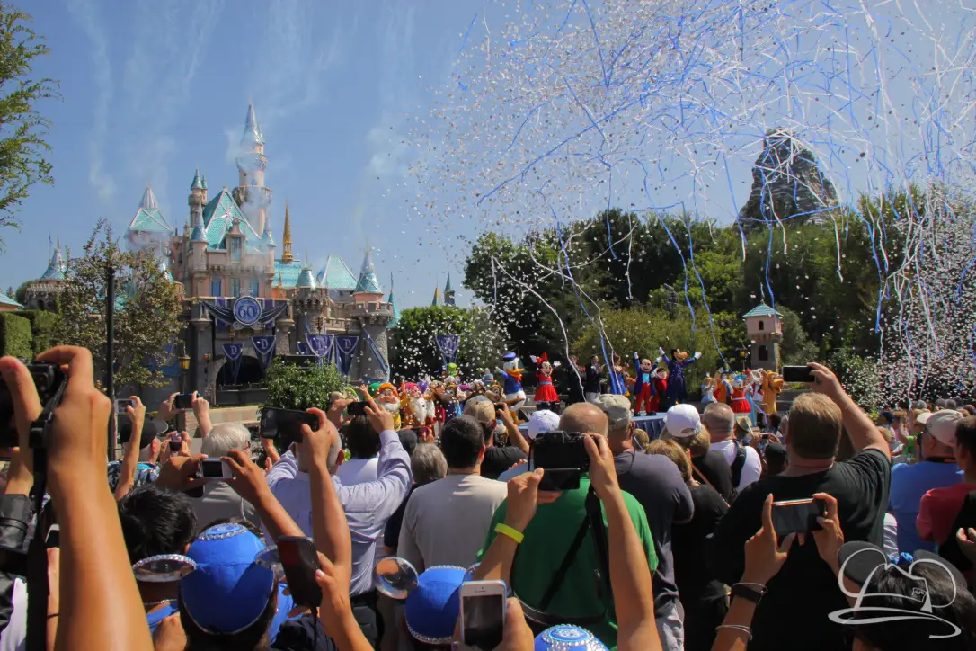 On July 17, 2015 Disneyland celebrated it’s 60th Anniversary. The day began with a short and sweet ceremony in front of Sleeping Beauty Castle at 10:00 AM. It was hosted by Disneyland President Michael Colglazier. It included the announcement of the the Million Dollar Dazzle where $1 million will be donated to local charities by the Disneyland Resort. The first charity to receive a grant was the Girl Scouts. The ceremony also included the recognition of Disney Legends and members of the Disney Family who were in attendance. The highlight for many was the beautiful rendition of Feed the Birds from Mary Poppins as sung by Ashley Brown who was accompanied on the piano by Richard Sherman. The ceremony ended with characters streaming around the small stage as all in attendance sang Happy Birthday to Disneyland.