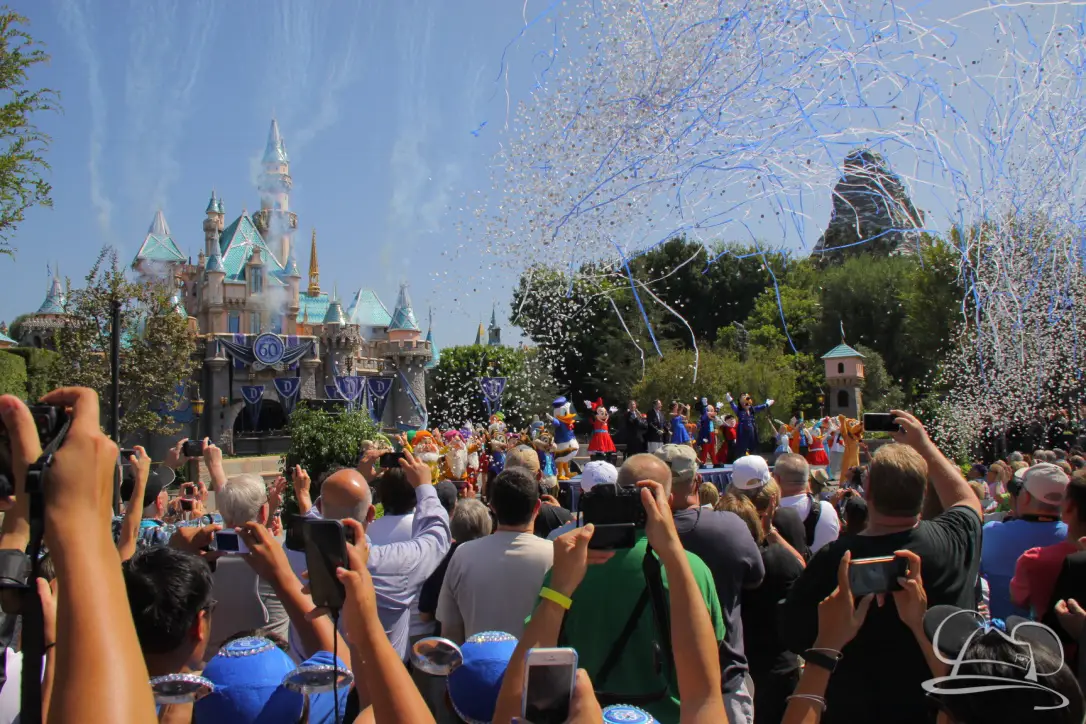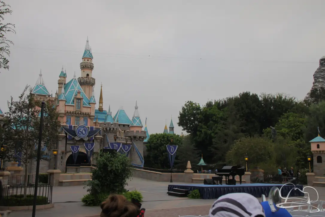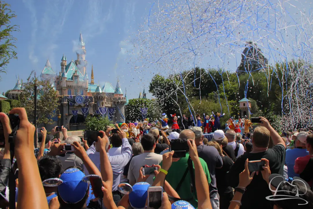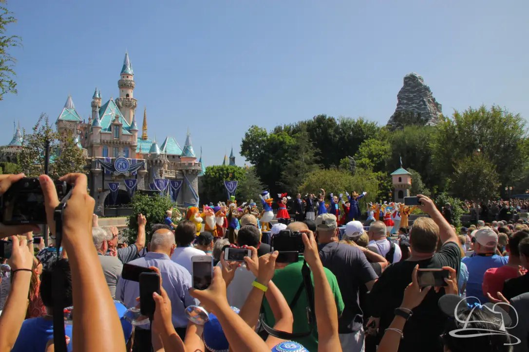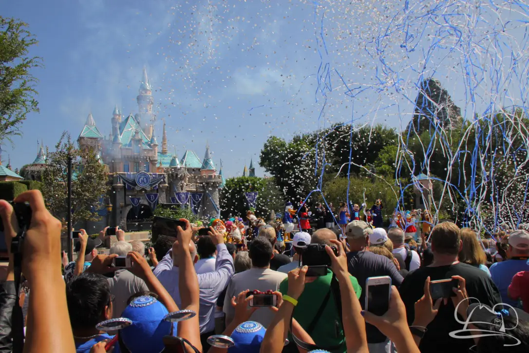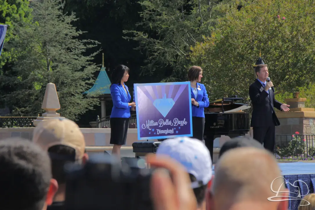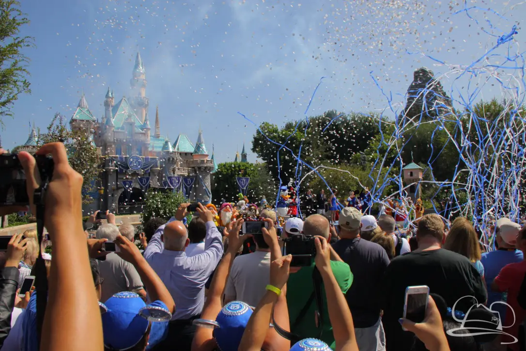 On July 17, 2015 Disneyland celebrated it’s 60th Anniversary. The day began with a short and sweet ceremony in front of Sleeping Beauty Castle at 10:00 AM. It was hosted by Disneyland President Michael Colglazier. It included the announcement of the the Million Dollar Dazzle where $1 million will be donated to local charities by the Disneyland Resort. The first charity to receive a grant was the Girl Scouts. The ceremony also included the recognition of Disney Legends and members of the Disney Family who were in attendance. The highlight for many was the beautiful rendition of Feed the Birds from Mary Poppins as sung by Ashley Brown who was accompanied on the piano by Richard Sherman. The ceremony ended with characters streaming around the small stage as all in attendance sang Happy Birthday to Disneyland.