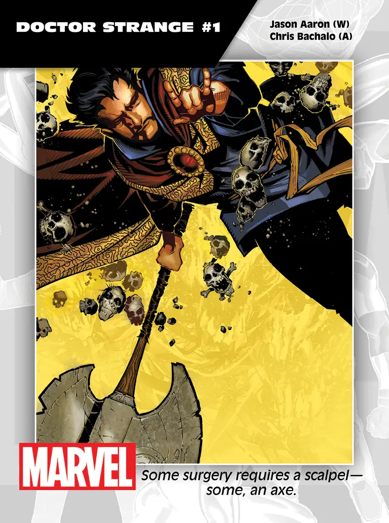 “Dropping the mic right before San Diego Comic-Con has become a Marvel tradition,” says Marvel Editor-in-Chief Axel Alonso. “The ALL-NEW, ALL-DIFFERENT MARVEL PREVIEWS magazine provides a large snapshot of what’s to expect in the fall: new characters, new teams, new wrinkles for our heroes, and most importantly, fresh creative directions. And we’re just getting started. We have a few more aces up our sleeves.”