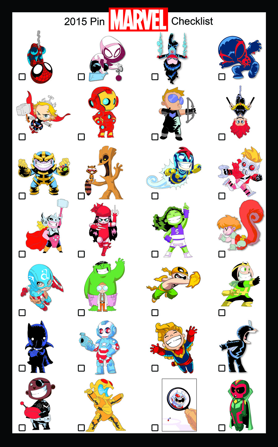 Starting at the opening of the show, fans can get their hands on 28 uniquely designed enamel pins featuring Skottie Young’s instantly recognizable Marvel artwork. Here’s a rundown of how you can get your hands on the entire set: