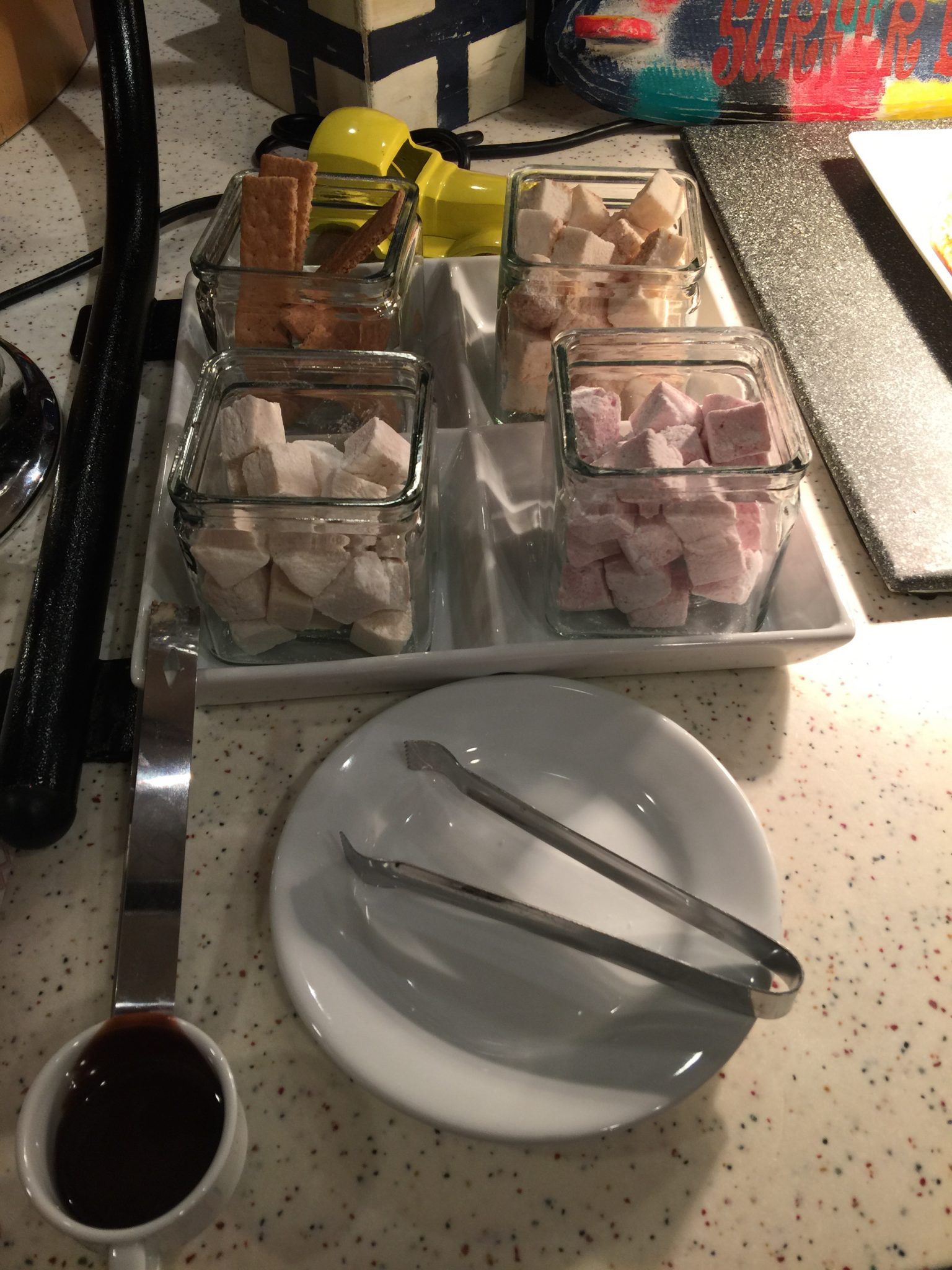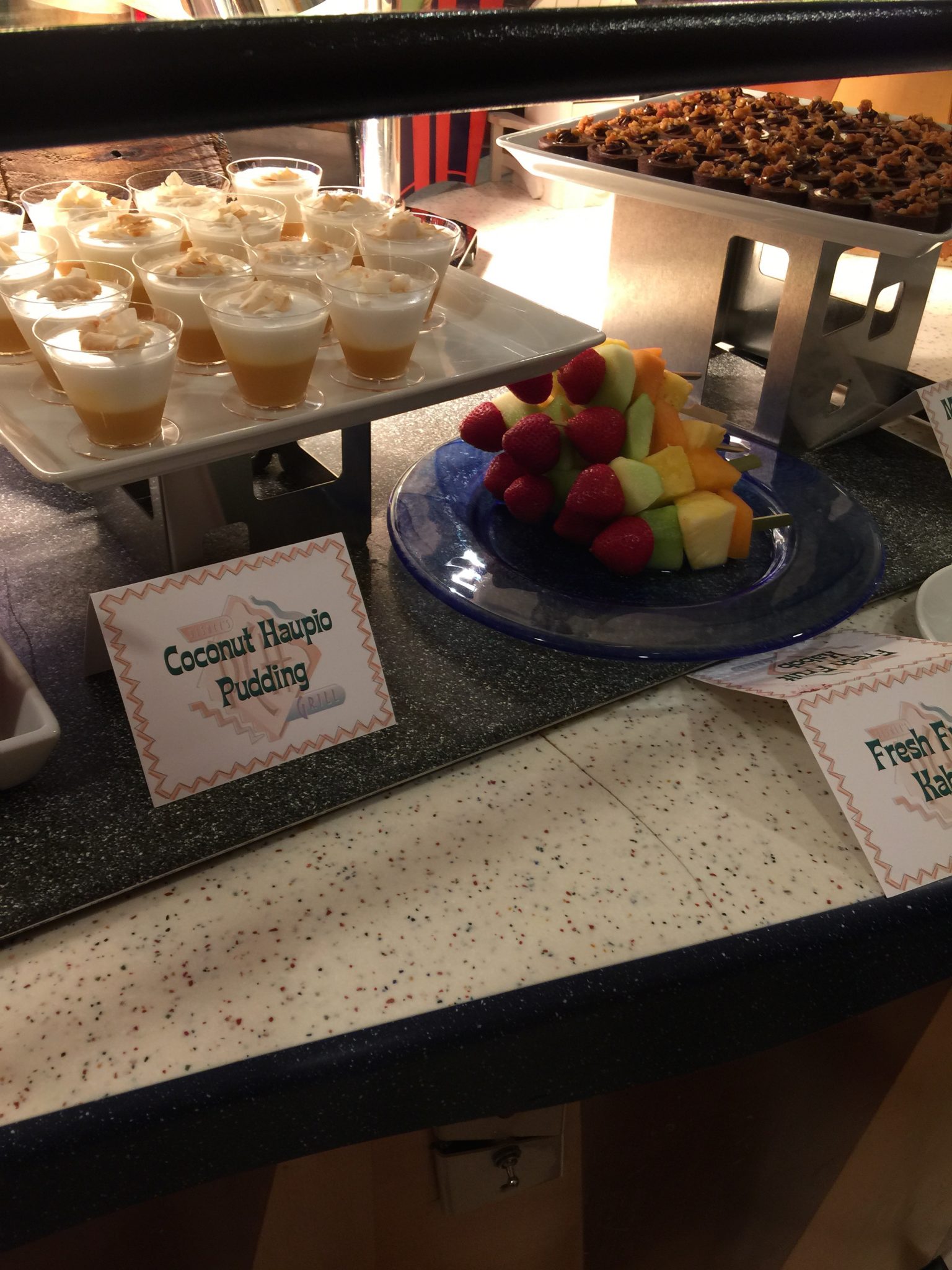 Dessert is mostly in your hands: a s’mores bar or build-your-own strawberry shortcake, fancy ice cream cones filled with vanilla bean, passion fruit and strawberry mousse. Or there’s a brioche fresh fruit pizza (made in the wood-burning oven), seasonal berry crisp and milk chocolate caramel tart (with sea salt and bacon brittle!). Add a little taste of the islands with creamy haupia pudding with layers of coconut and mango.