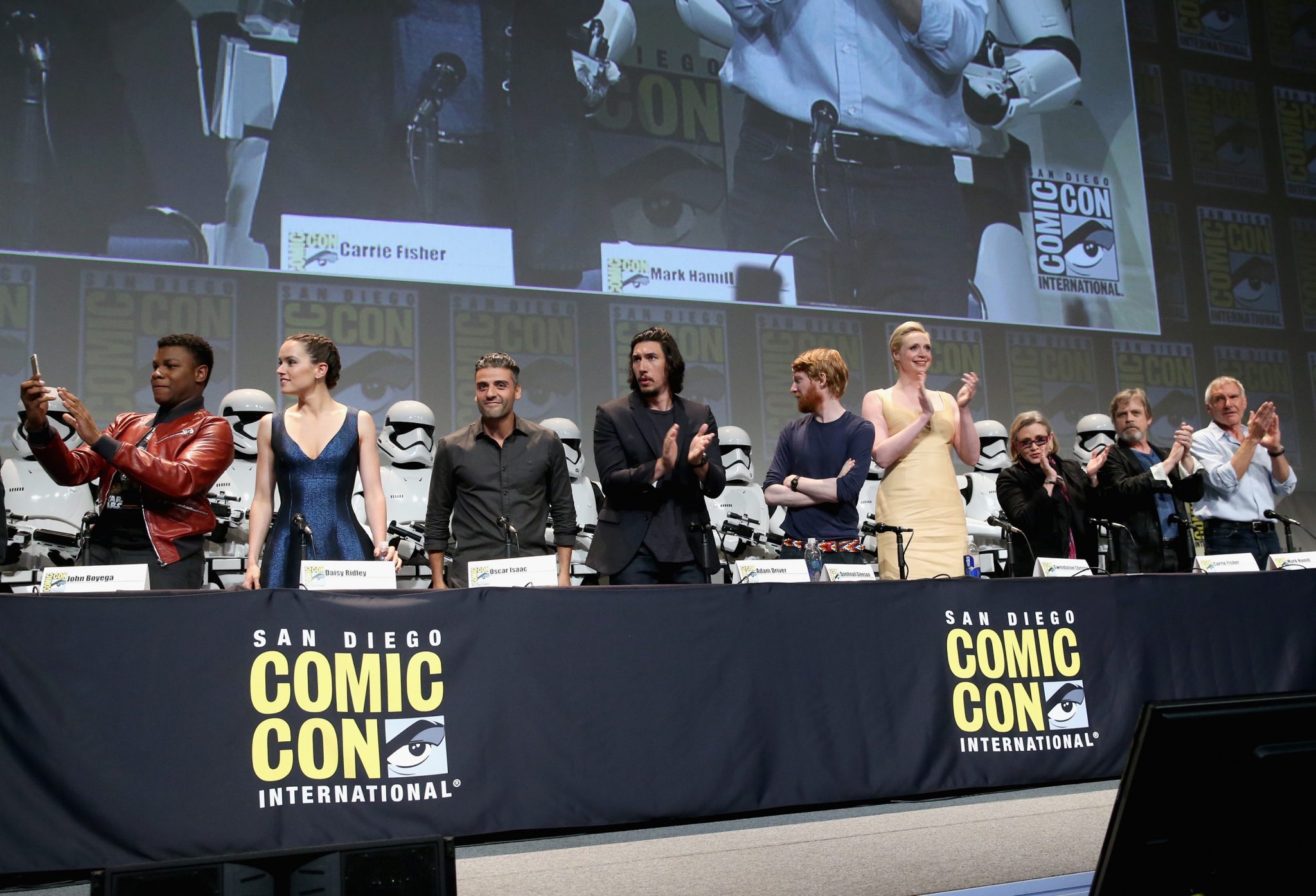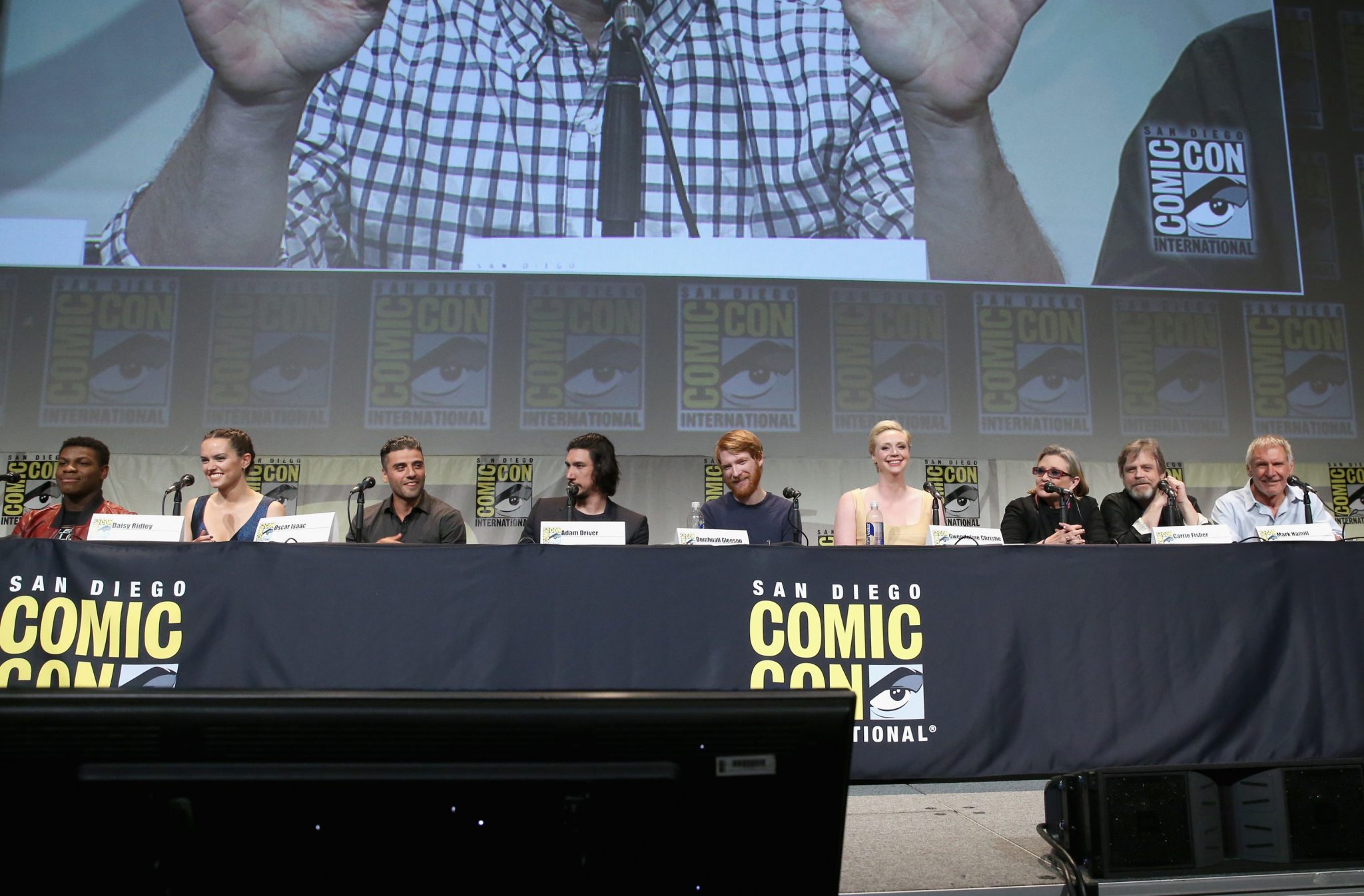 SAN DIEGO, CA – JULY 10: (L-R) Actors John Boyega, Daisy Ridley, Oscar Isaac, Adam Driver, Domhnall Gleeson, Gwendoline Christie, Carrie Fisher, Mark Hamill and Harrison Ford at the Hall H Panel for `Star Wars: The Force Awakens` during Comic-Con International 2015 at the San Diego Convention Center on July 10, 2015 in San Diego, California. (Photo by Jesse Grant/Getty Images for Disney) *** Local Caption *** John Boyega; Daisy Ridley; Oscar Isaac; Adam Driver; Domhnall Gleeson; Gwendoline Christie; Carrie Fisher; Mark Hamill; Harrison Ford