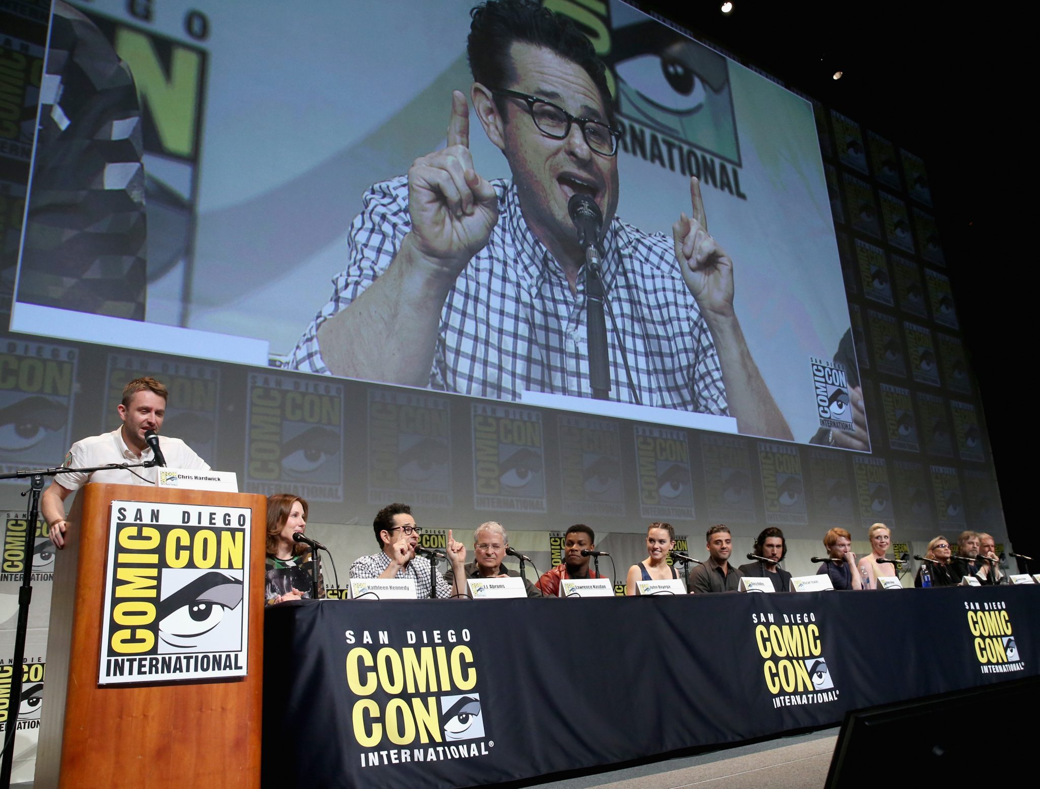 SAN DIEGO, CA – JULY 10: (L-R) Moderator Chris Hardwick, producer Kathleen Kennedy, director J.J. Abrams, screenwriter Lawrence Kasdan and actors John Boyega, Daisy Ridley, Oscar Isaac, Adam Driver, Domhnall Gleeson, Gwendoline Christie, Carrie Fisher, Mark Hamill and Harrison Ford at the Hall H Panel for `Star Wars: The Force Awakens` during Comic-Con International 2015 at the San Diego Convention Center on July 10, 2015 in San Diego, California. (Photo by Michael Buckner/Getty Images for Disney) *** Local Caption *** Chris Hardwick; Kathleen Kennedy; J.J. Abrams; Lawrence Kasdan; John Boyega; Daisy Ridley; Oscar Isaac; Adam Driver; Domhnall Gleeson; Gwendoline Christie; Carrie Fisher; Mark Hamill; Harrison Ford