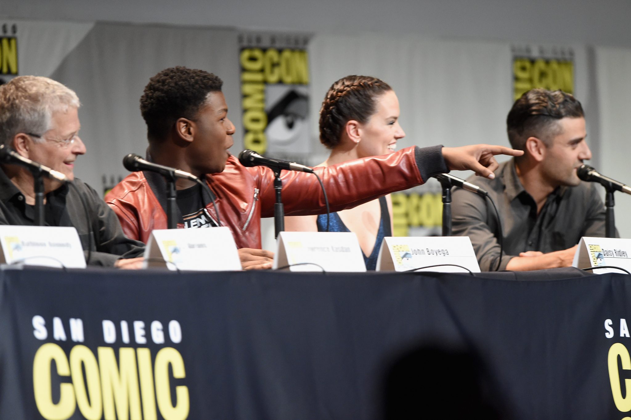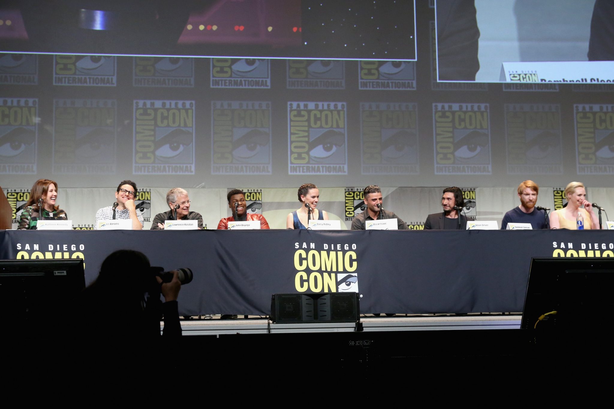SAN DIEGO, CA – JULY 10: (L-R) Producer Kathleen Kennedy, director J.J. Abrams, screenwriter Lawrence Kasdan and actors John Boyega, Daisy Ridley, Oscar Isaac, Adam Driver, Domhnall Gleeson and Gwendoline Christie at the Hall H Panel for `Star Wars: The Force Awakens` during Comic-Con International 2015 at the San Diego Convention Center on July 10, 2015 in San Diego, California. (Photo by Jesse Grant/Getty Images for Disney) *** Local Caption *** Kathleen Kennedy; J.J. Abrams; Lawrence Kasdan; John Boyega; Daisy Ridley; Oscar Isaac; Adam Driver; Domhnall Gleeson; Gwendoline Christie