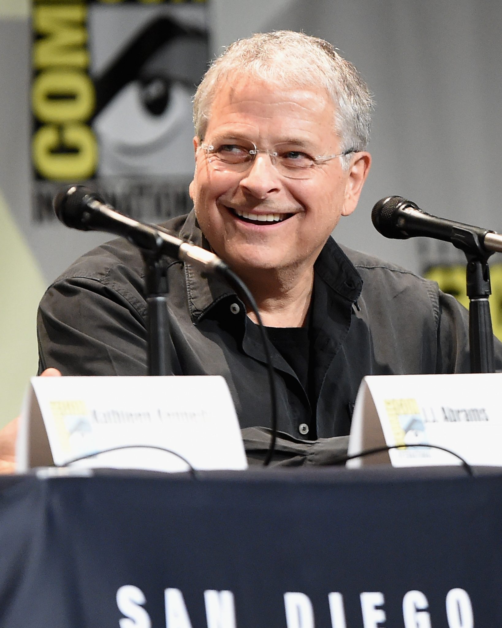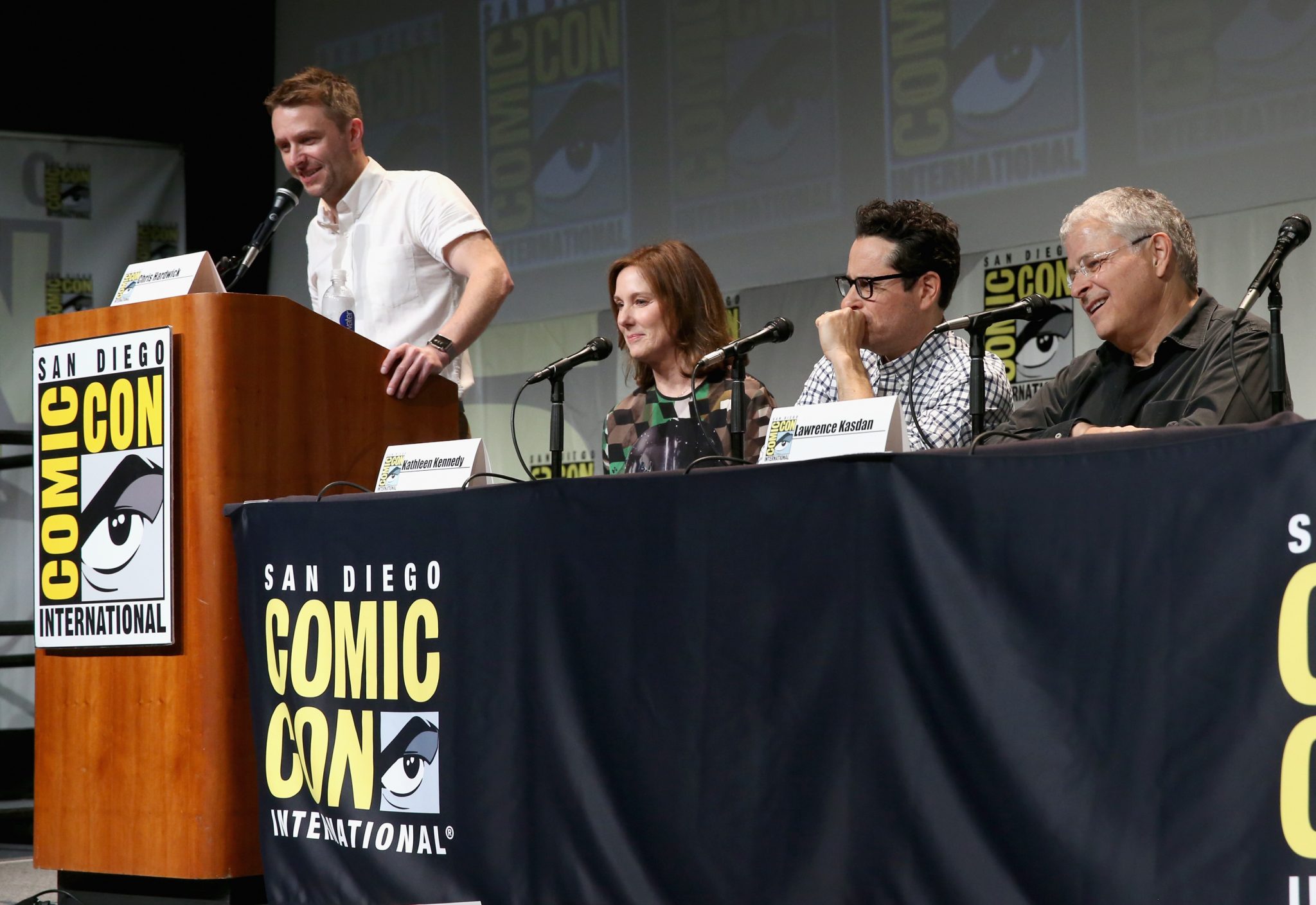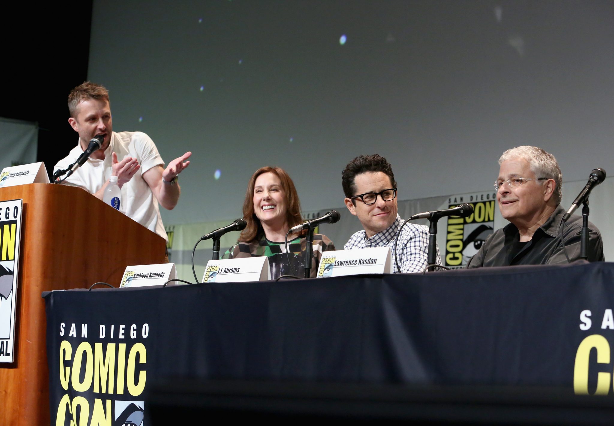 SAN DIEGO, CA – JULY 10: (L-R) Moderator Chris Hardwick, producer Kathleen Kennedy, director J.J. Abrams and screenwriter Lawrence Kasdan at the Hall H Panel for `Star Wars: The Force Awakens` during Comic-Con International 2015 at the San Diego Convention Center on July 10, 2015 in San Diego, California. (Photo by Jesse Grant/Getty Images for Disney) *** Local Caption *** Chris Hardwick; Kathleen Kennedy; J.J. Abrams; Lawrence Kasdan