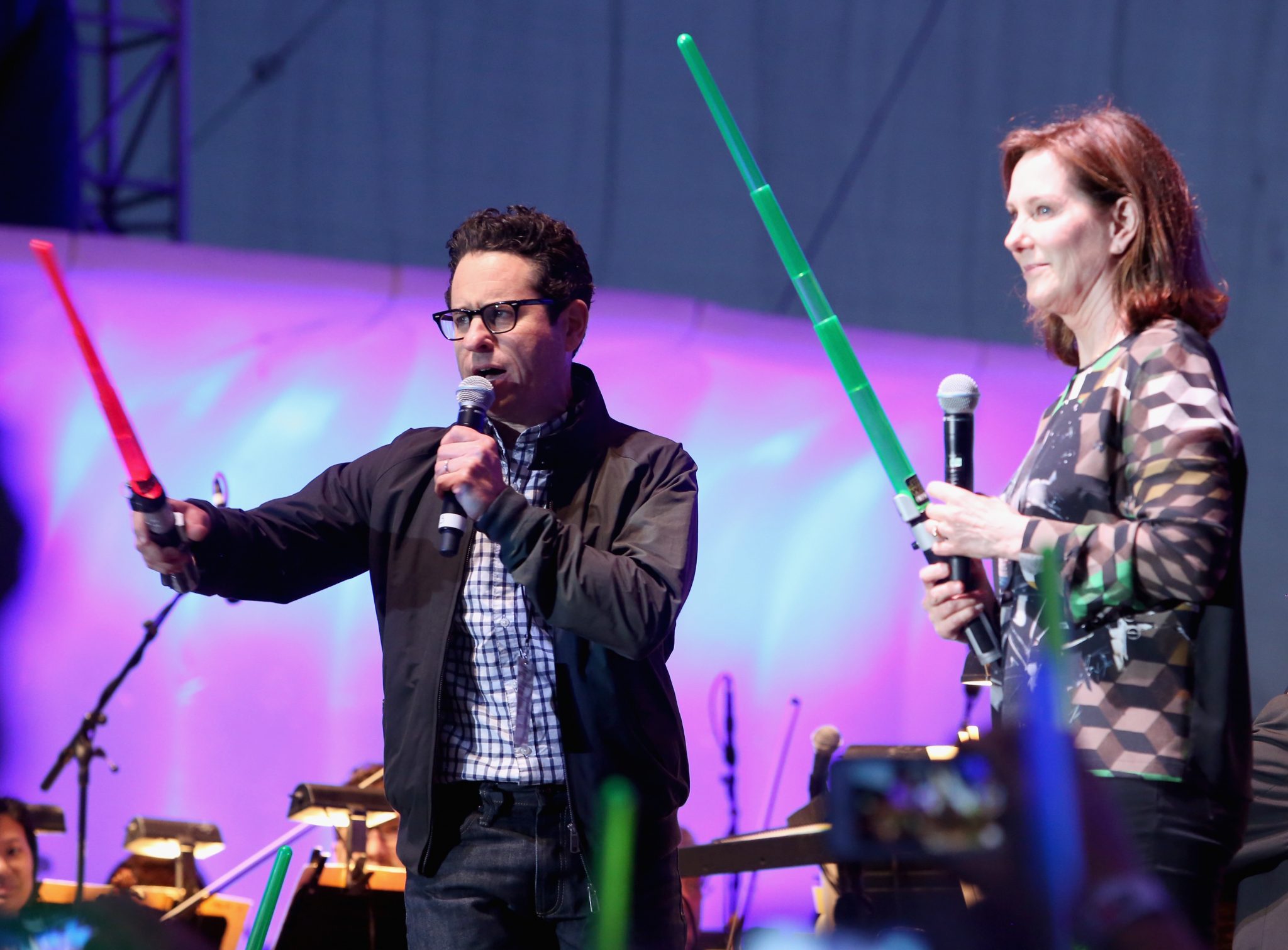 SAN DIEGO, CA – JULY 10: Director J.J. Abrams (L), producer Kathleen Kennedy and more than 6000 fans enjoyed a surprise `Star Wars` Fan Concert performed by the San Diego Symphony, featuring the classic “Star Wars” music of composer John Williams, at the Embarcadero Marina Park South on July 10, 2015 in San Diego, California. (Photo by Jesse Grant/Getty Images for Disney) *** Local Caption *** J.J. Abrams; Kathleen Kennedy