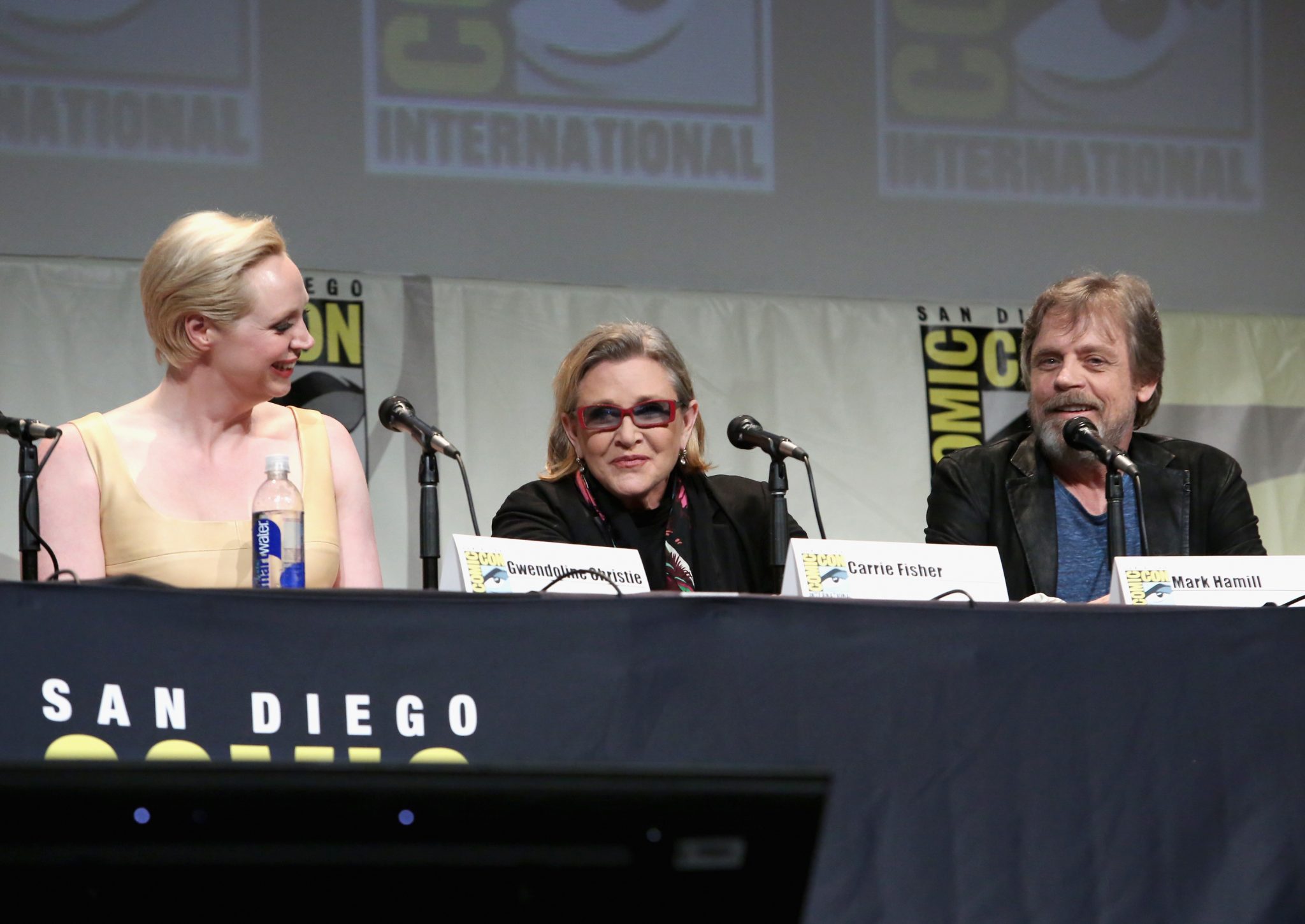 SAN DIEGO, CA – JULY 10: (L-R) Actors Gwendoline Christie, Carrie Fisher and Mark Hamill at the Hall H Panel for `Star Wars: The Force Awakens` during Comic-Con International 2015 at the San Diego Convention Center on July 10, 2015 in San Diego, California. (Photo by Jesse Grant/Getty Images for Disney) *** Local Caption *** Gwendoline Christie; Carrie Fisher; Mark Hamill