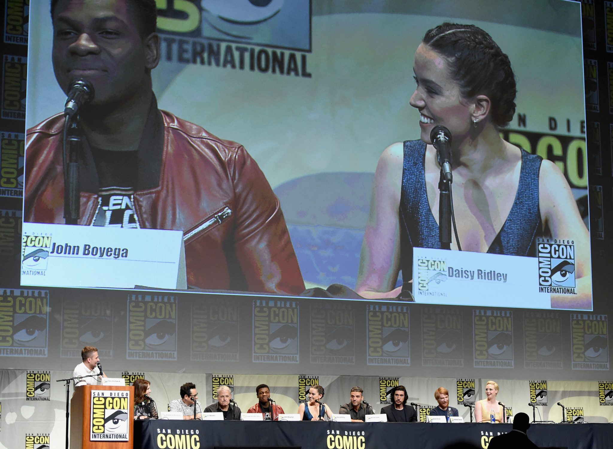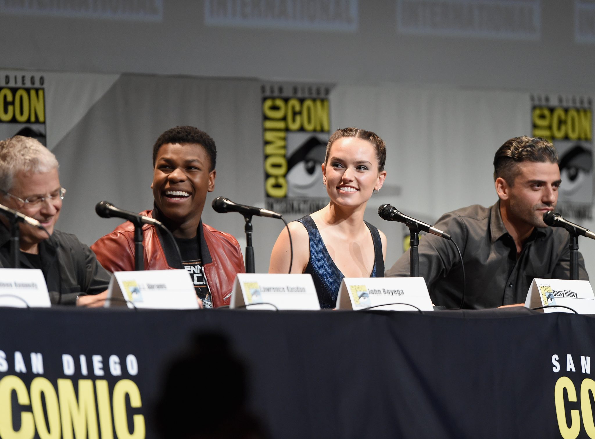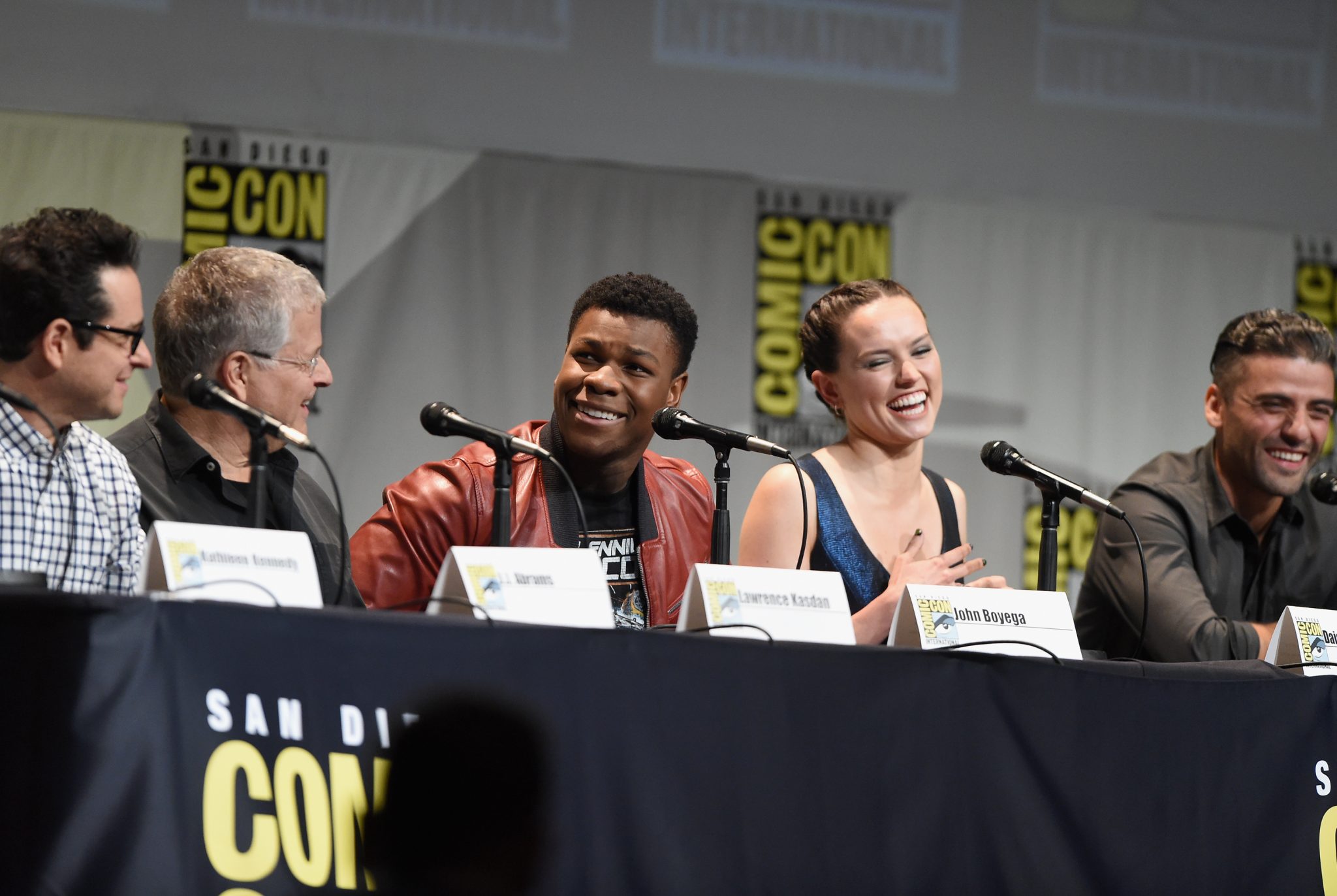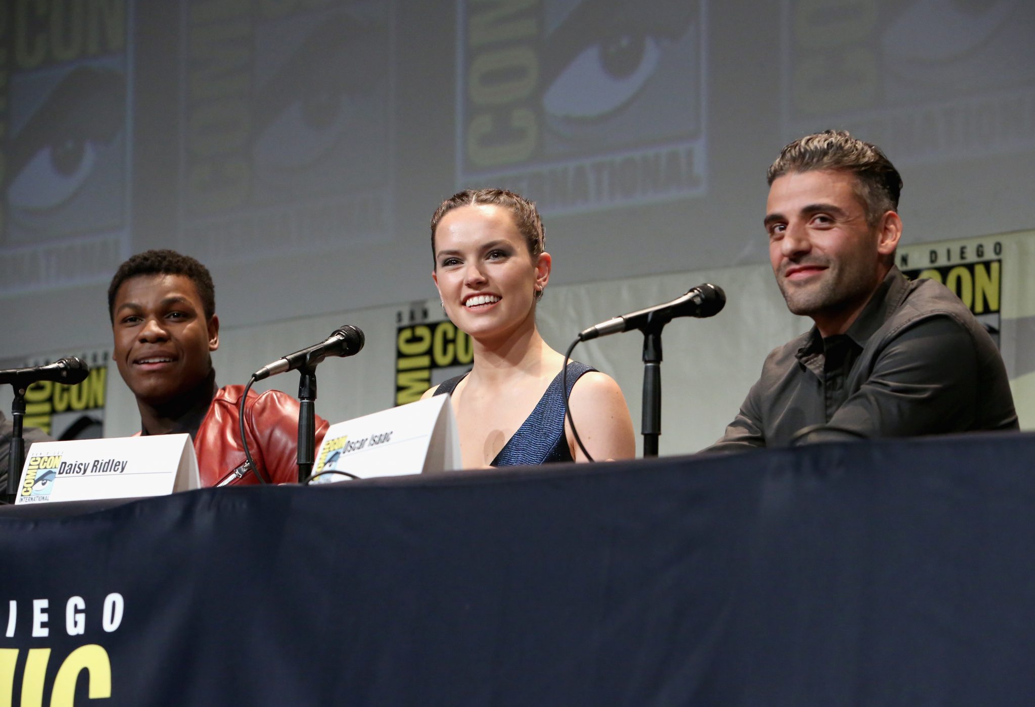 SAN DIEGO, CA – JULY 10: (L-R) Actors John Boyega, Daisy Ridley and Oscar Isaac at the Hall H Panel for `Star Wars: The Force Awakens` during Comic-Con International 2015 at the San Diego Convention Center on July 10, 2015 in San Diego, California. (Photo by Jesse Grant/Getty Images for Disney) *** Local Caption *** John Boyega; Daisy Ridley; Oscar Isaac