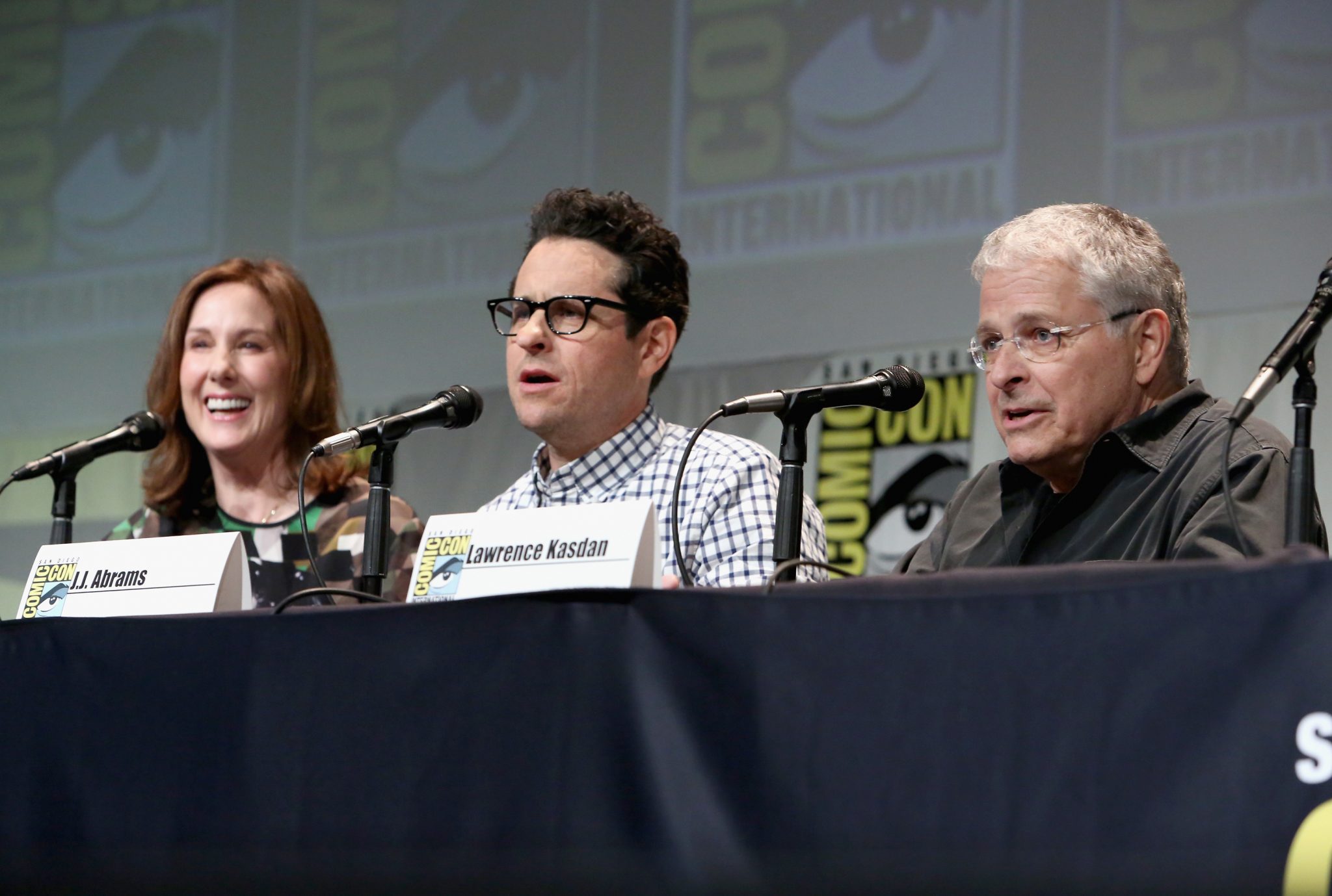 SAN DIEGO, CA – JULY 10: (L-R) Producer Kathleen Kennedy, director J.J. Abrams and screenwriter Lawrence Kasdan at the Hall H Panel for `Star Wars: The Force Awakens` during Comic-Con International 2015 at the San Diego Convention Center on July 10, 2015 in San Diego, California. (Photo by Jesse Grant/Getty Images for Disney) *** Local Caption *** Kathleen Kennedy; J.J. Abrams; Lawrence Kasdan