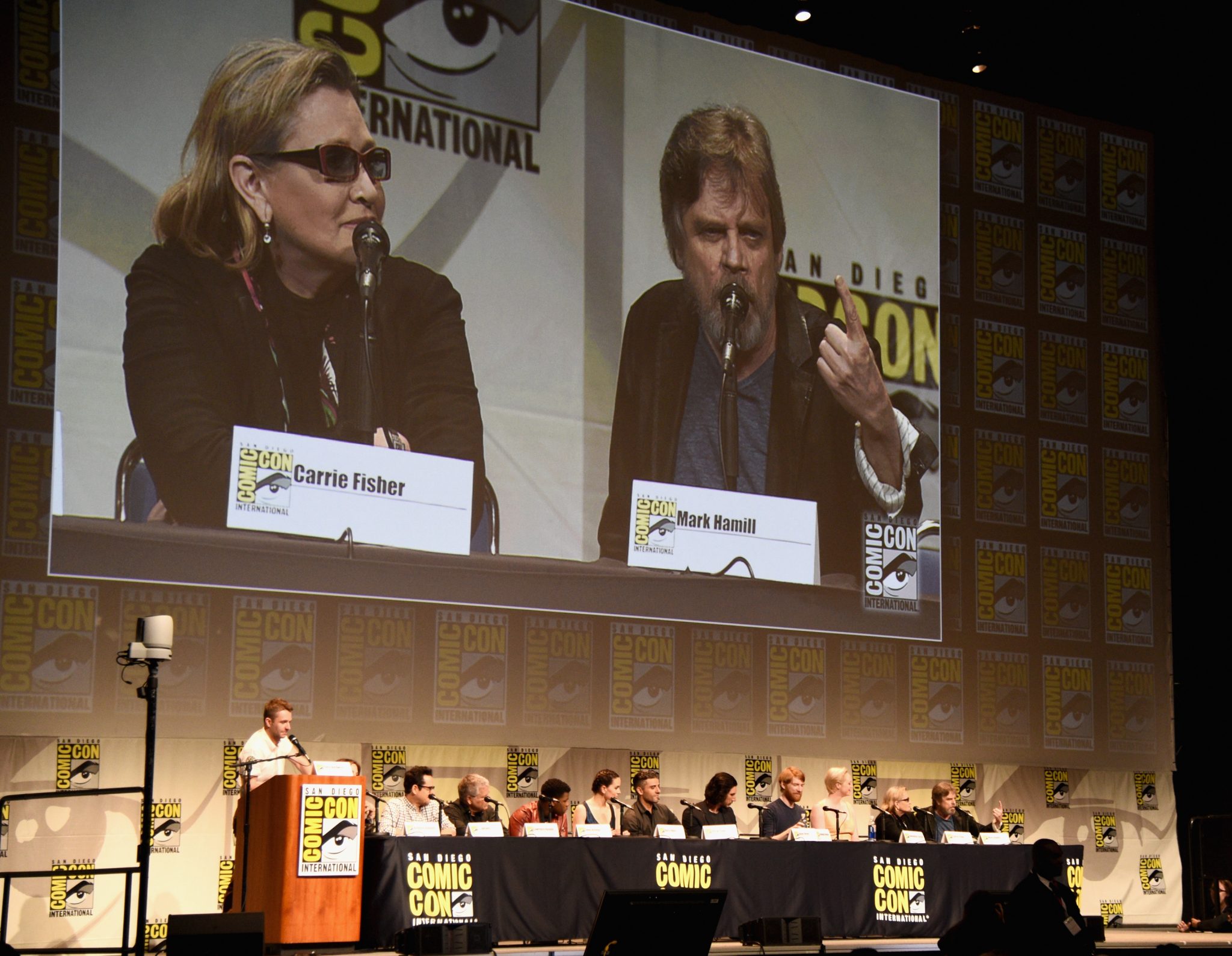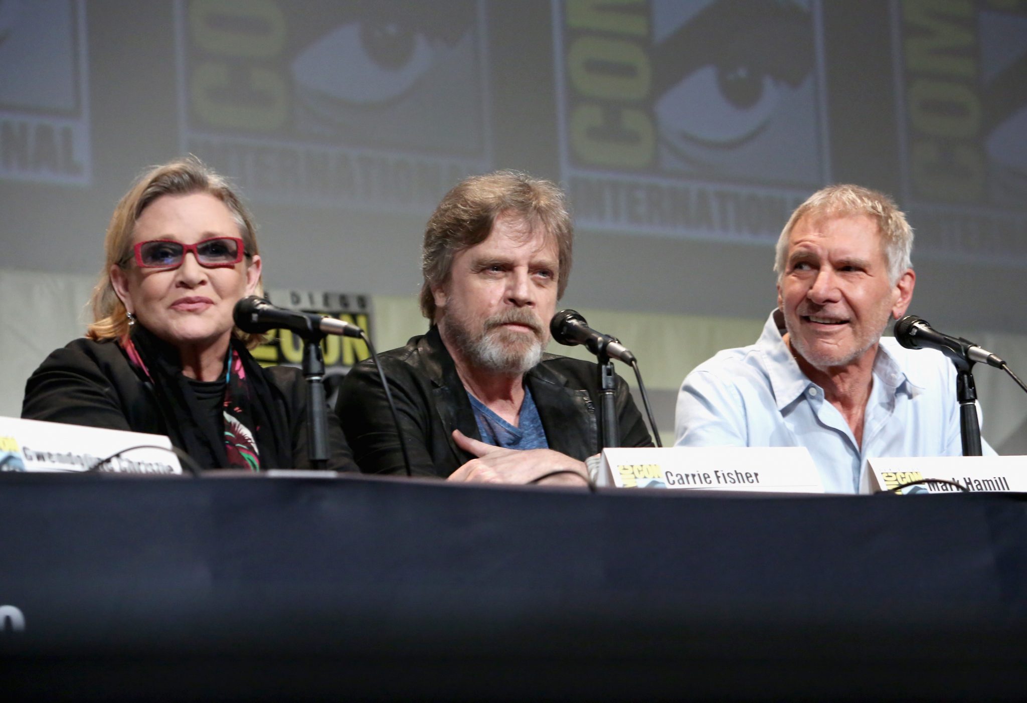 SAN DIEGO, CA – JULY 10: (L-R) Actors Carrie Fisher, Mark Hamill and Harrison Ford at the Hall H Panel for `Star Wars: The Force Awakens` during Comic-Con International 2015 at the San Diego Convention Center on July 10, 2015 in San Diego, California. (Photo by Jesse Grant/Getty Images for Disney) *** Local Caption *** Carrie Fisher; Mark Hamill; Harrison Ford