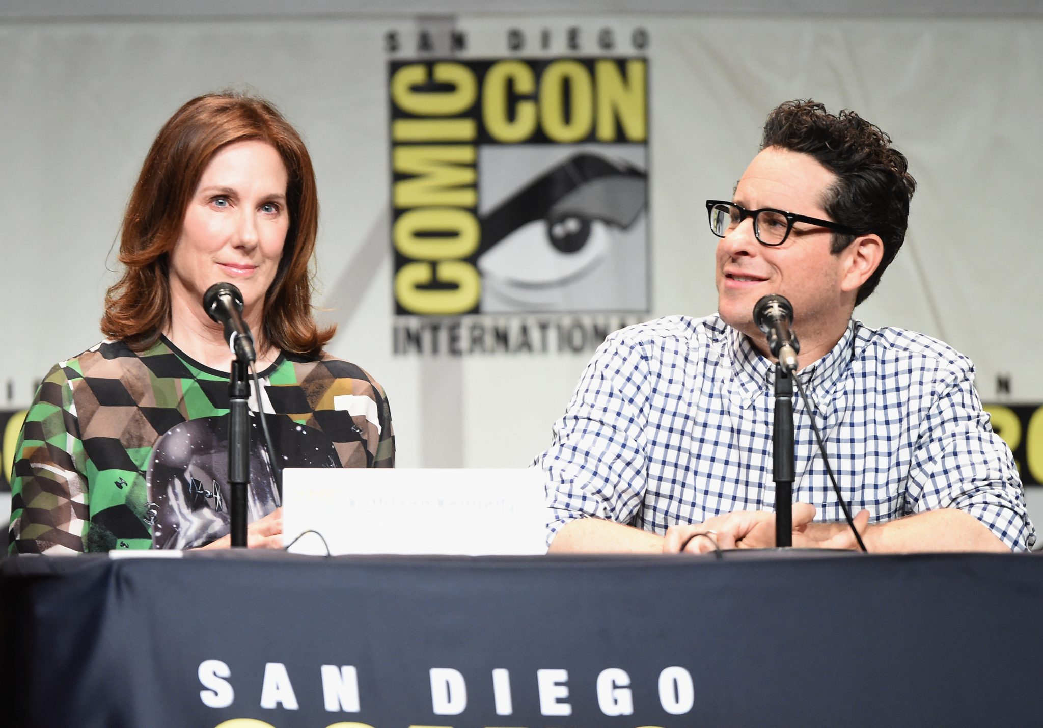 SAN DIEGO, CA – JULY 10: Producer Kathleen Kennedy (L) and director J.J. Abrams at the Hall H Panel for `Star Wars: The Force Awakens` during Comic-Con International 2015 at the San Diego Convention Center on July 10, 2015 in San Diego, California. (Photo by Michael Buckner/Getty Images for Disney) *** Local Caption *** Kathleen Kennedy; J.J. Abrams