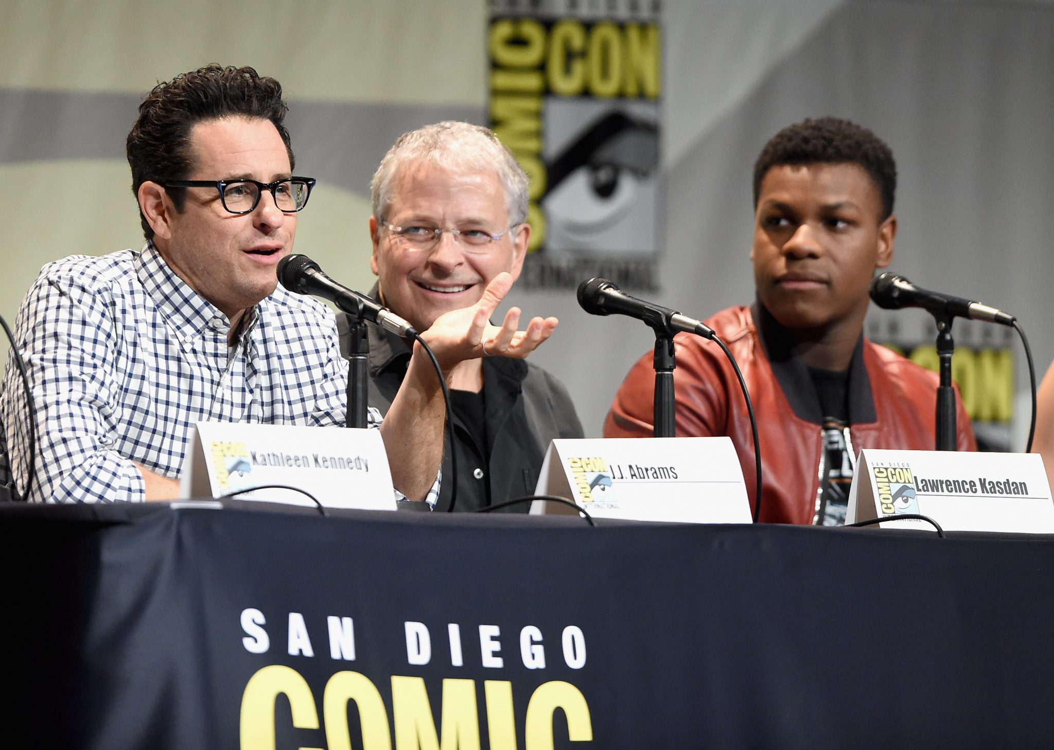 SAN DIEGO, CA – JULY 10: (L-R) Director J.J. Abrams, screenwriter Lawrence Kasdan and actor John Boyega at the Hall H Panel for `Star Wars: The Force Awakens` during Comic-Con International 2015 at the San Diego Convention Center on July 10, 2015 in San Diego, California. (Photo by Michael Buckner/Getty Images for Disney) *** Local Caption *** J.J. Abrams; Lawrence Kasdan; John Boyega