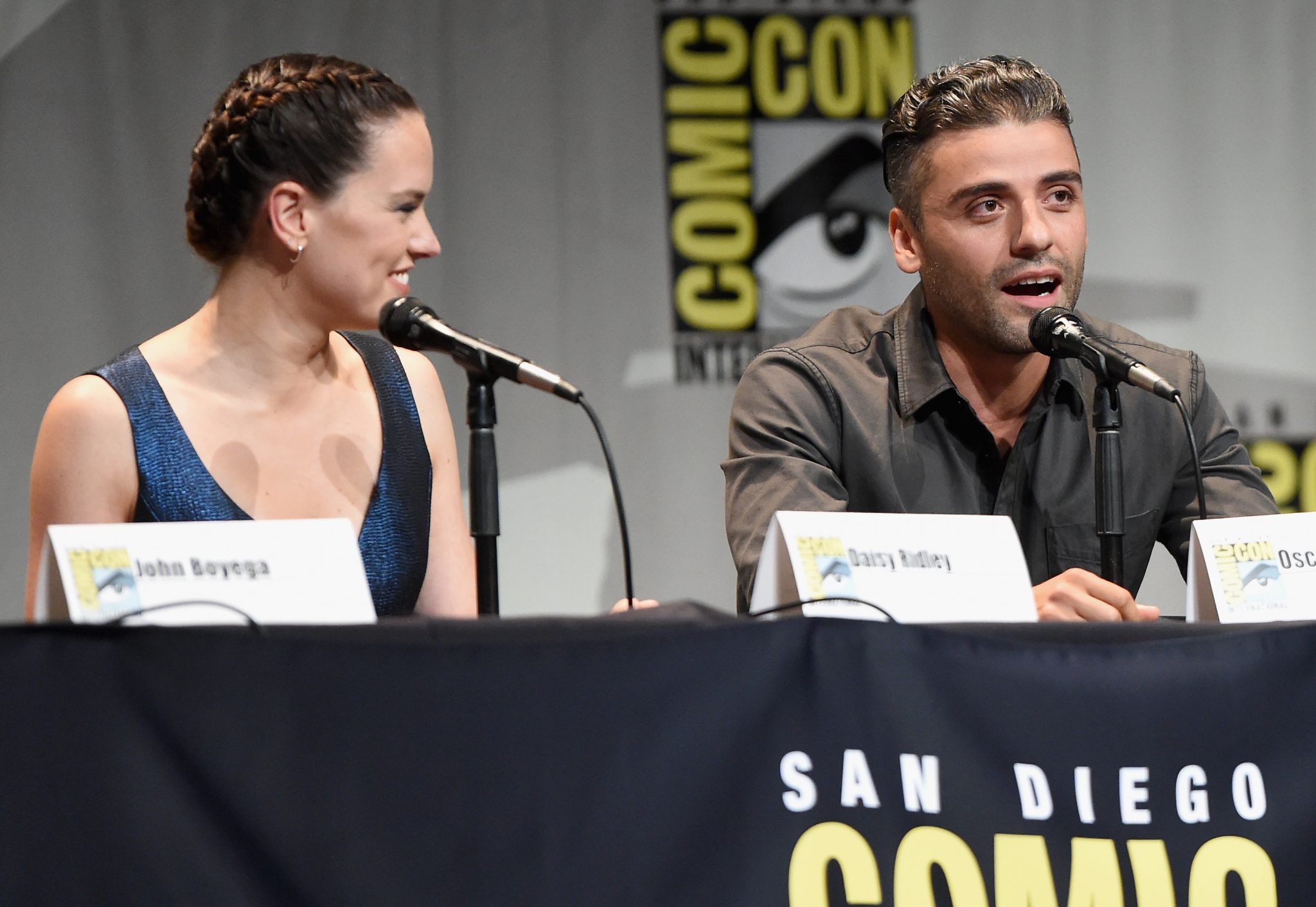 SAN DIEGO, CA – JULY 10: Actors Daisy Ridley (L) and Oscar Isaac at the Hall H Panel for `Star Wars: The Force Awakens` during Comic-Con International 2015 at the San Diego Convention Center on July 10, 2015 in San Diego, California. (Photo by Michael Buckner/Getty Images for Disney) *** Local Caption *** Daisy Ridley; Oscar Isaac