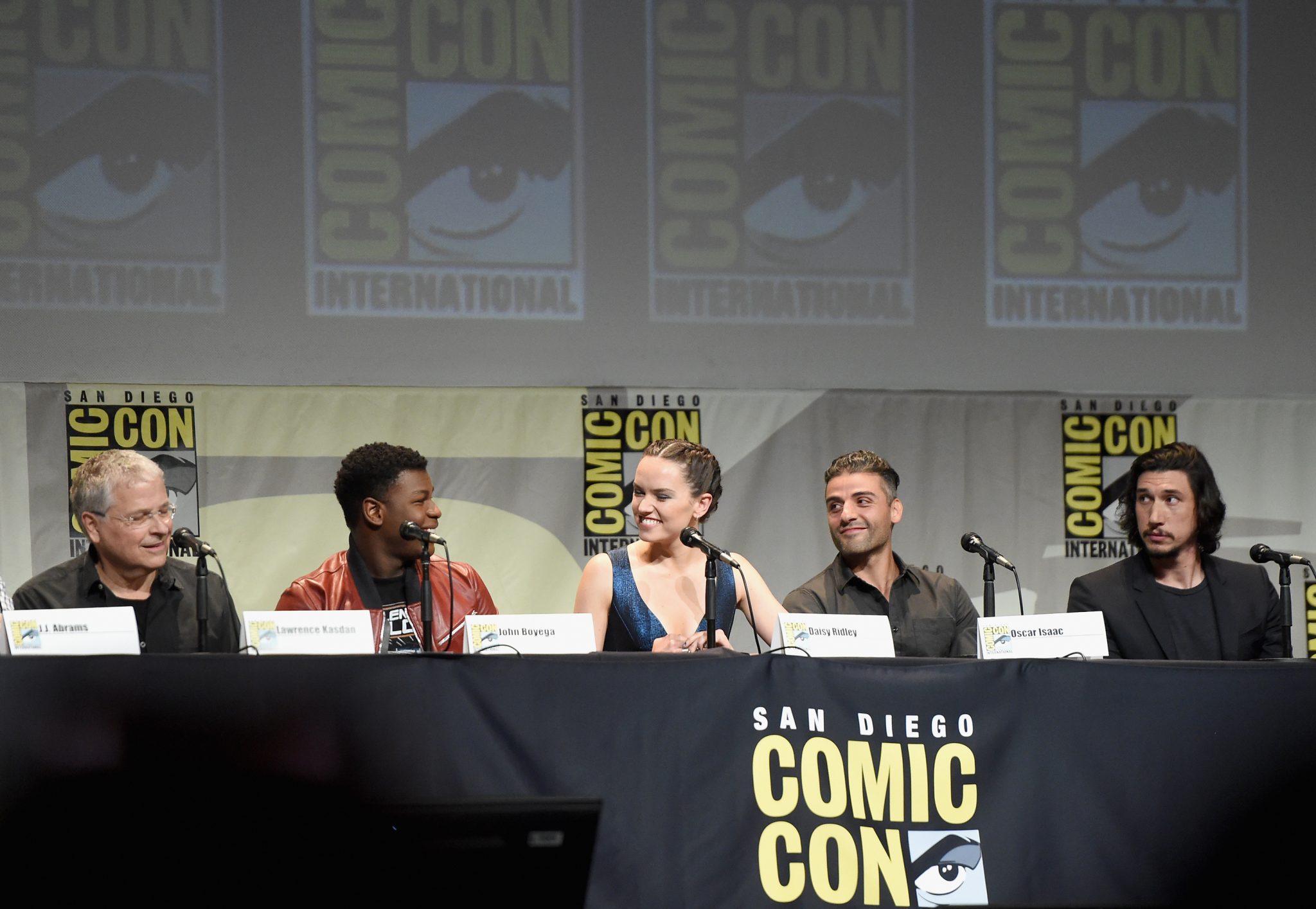 SAN DIEGO, CA – JULY 10: (L-R) Director J.J. Abrams, screenwriter Lawrence Kasdan and actors John Boyega, Daisy Ridley and Oscar Isaac at the Hall H Panel for `Star Wars: The Force Awakens` during Comic-Con International 2015 at the San Diego Convention Center on July 10, 2015 in San Diego, California. (Photo by Michael Buckner/Getty Images for Disney) *** Local Caption *** J.J. Abrams; Lawrence Kasdan; John Boyega; Daisy Ridley; Oscar Isaac
