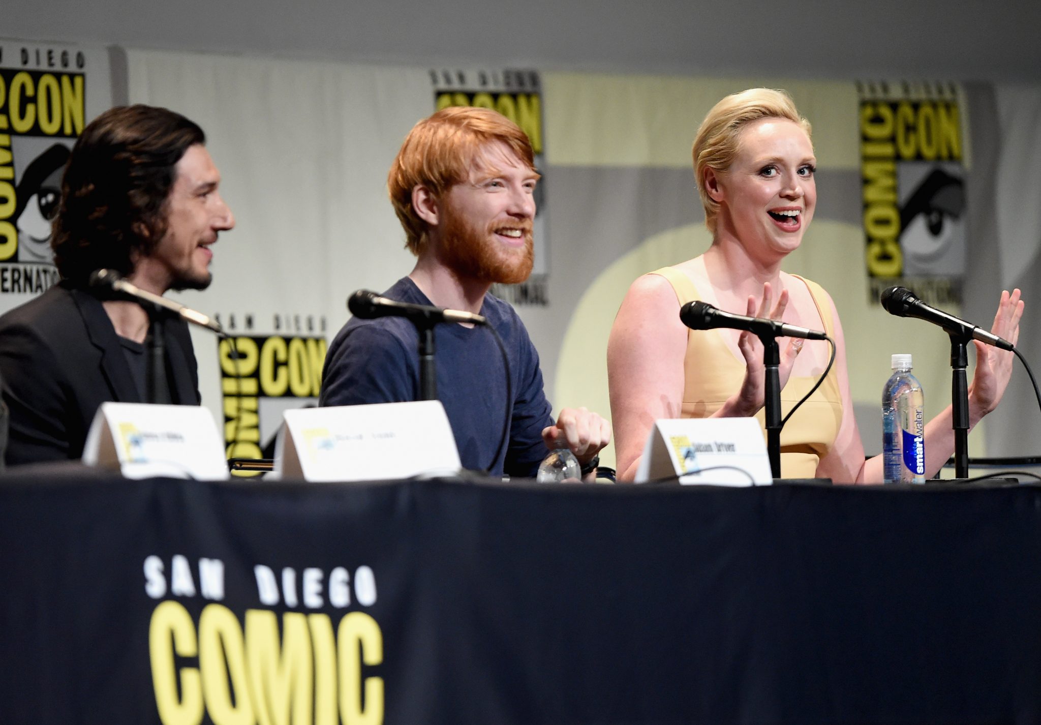 SAN DIEGO, CA – JULY 10: (L-R) Actors Adam Driver, Domhnall Gleeson and Gwendoline Christie at the Hall H Panel for `Star Wars: The Force Awakens` during Comic-Con International 2015 at the San Diego Convention Center on July 10, 2015 in San Diego, California. (Photo by Michael Buckner/Getty Images for Disney) *** Local Caption *** Adam Driver; Domhnall Gleeson; Gwendoline Christie
