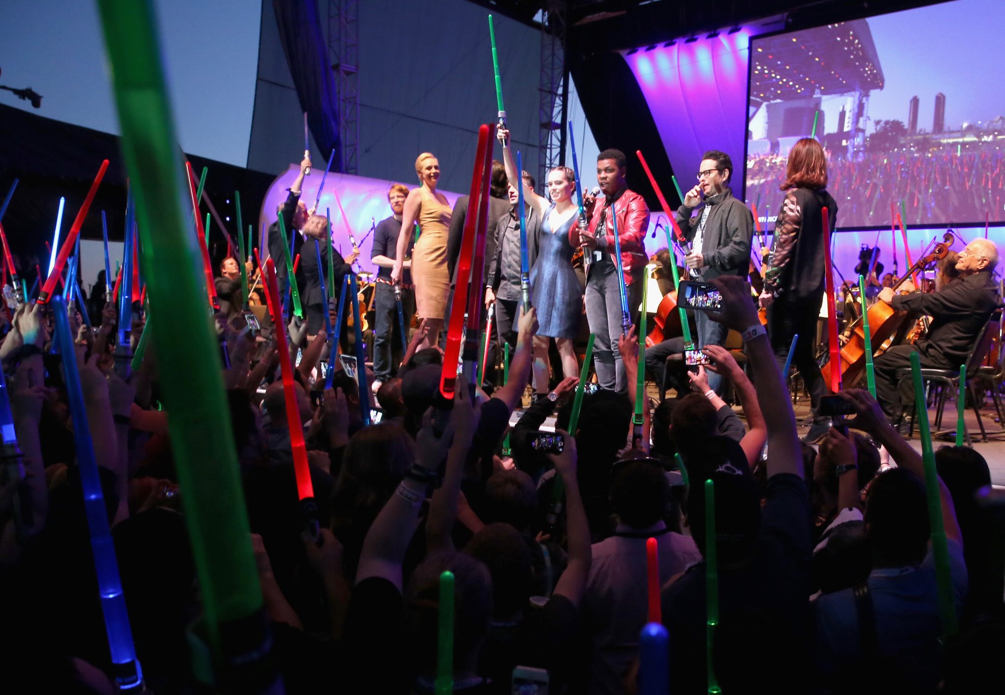 SAN DIEGO, CA – JULY 10: (L-R) Actors Daisy Ridley, John Boyega, director J.J. Abrams and more than 6000 fans enjoyed a surprise `Star Wars` Fan Concert performed by the San Diego Symphony, featuring the classic `Star Wars` music of composer John Williams, at the Embarcadero Marina Park South on July 10, 2015 in San Diego, California. (Photo by Jesse Grant/Getty Images for Disney) *** Local Caption *** Daisy Ridley; John Boyega; J.J. Abrams