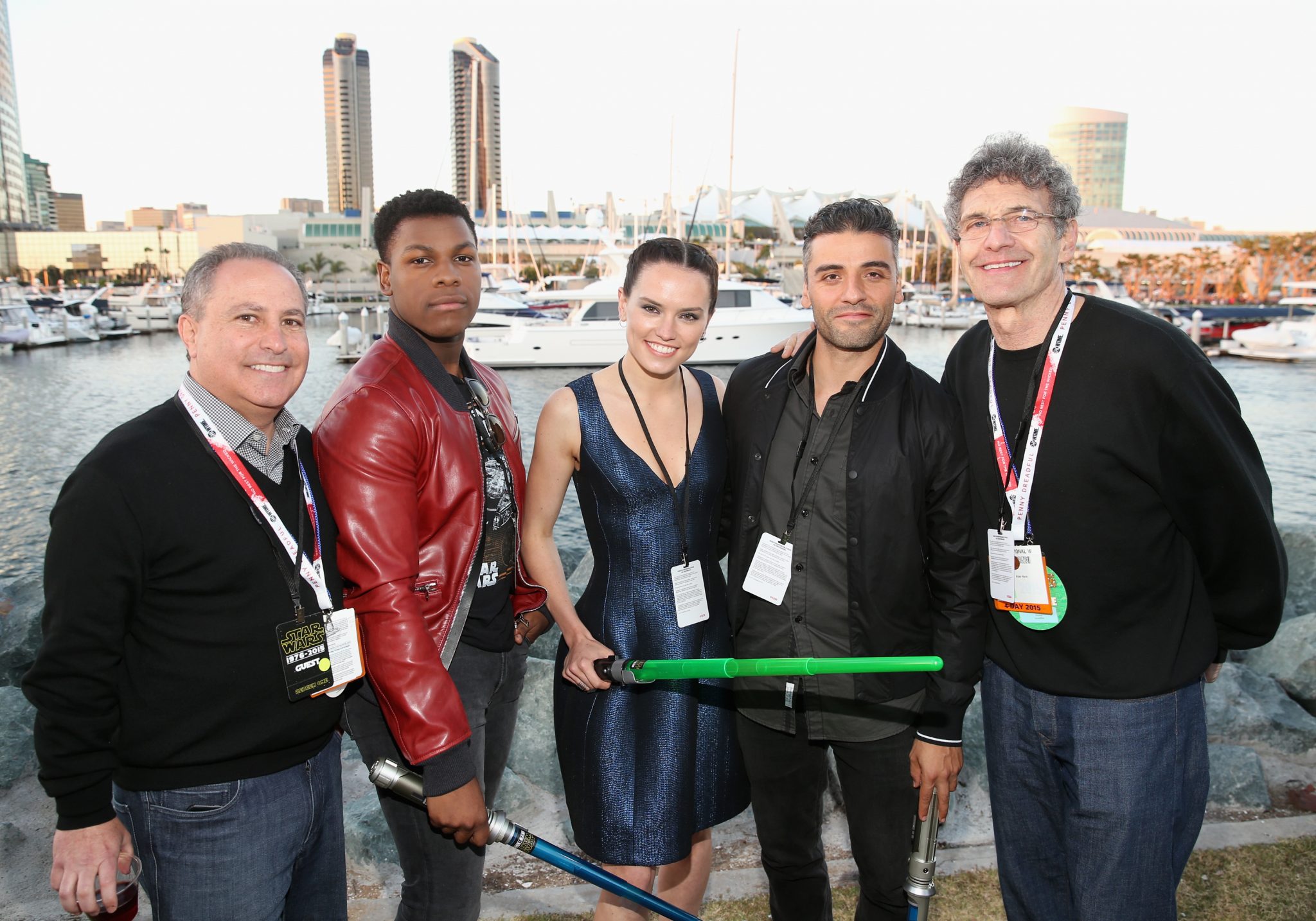 SAN DIEGO, CA – JULY 10: (L-R) President, The Walt Disney Studios, Alan Bergman, actors John Boyega, Daisy Ridley, Oscar Isaac, Chairman, The Walt Disney Studios, Alan Horn and more than 6000 fans enjoyed a surprise `Star Wars` Fan Concert performed by the San Diego Symphony, featuring the classic `Star Wars` music of composer John Williams, at the Embarcadero Marina Park South on July 10, 2015 in San Diego, California. (Photo by Jesse Grant/Getty Images for Disney) *** Local Caption *** Alan Bergman; Oscar Isaac; John Boyega; Daisy Ridley; Alan Horn