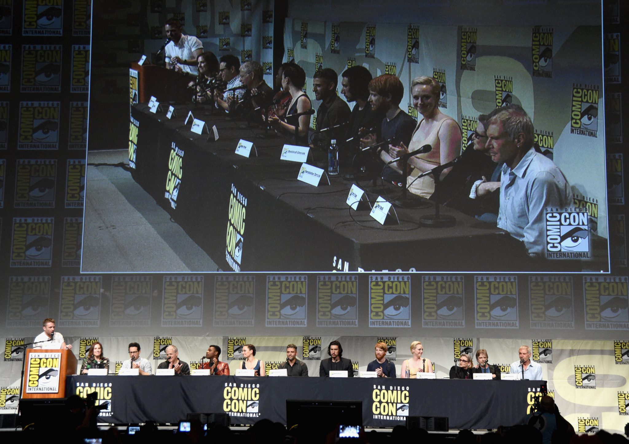 SAN DIEGO, CA – JULY 10: (L-R) Actors Domhnall Gleeson, Gwendoline Christie, Carrie Fisher, Mark Hamill and Harrison Ford at the Hall H Panel for `Star Wars: The Force Awakens` during Comic-Con International 2015 at the San Diego Convention Center on July 10, 2015 in San Diego, California. (Photo by Jesse Grant/Getty Images for Disney) *** Local Caption *** Domhnall Gleeson; Gwendoline Christie; Carrie Fisher; Mark Hamill; Harrison Ford