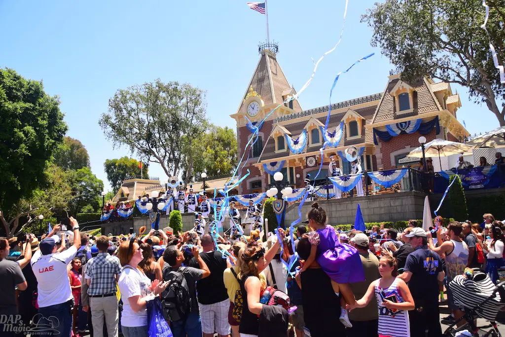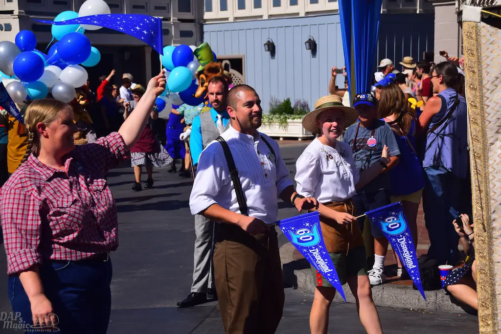 The day also marked the premier of the revamped Disneyland Band. The band had 4 sets scheduled for the day, but ended up having 5 because right after the ceremony was a special performance for executives and television crews to record. The sets were filled with high energy and great medleys! It was fun to watch and drew a great crowd. The second set of the day was the most magical, featuring a march along down Main Street starting at Sleeping Beauty Castle. The band performed a couple songs and then proceeded down Main Street with Mickey and crew, picked up the Dapper Dans and ended at the Train Station. There the Dans led everyone in singing along with one of the 60th songs while Mickey and friends beckoned guests to dance with them. Streamers shot through at the conclusion of the song. It was spectacular for being such a short and somewhat small performance.