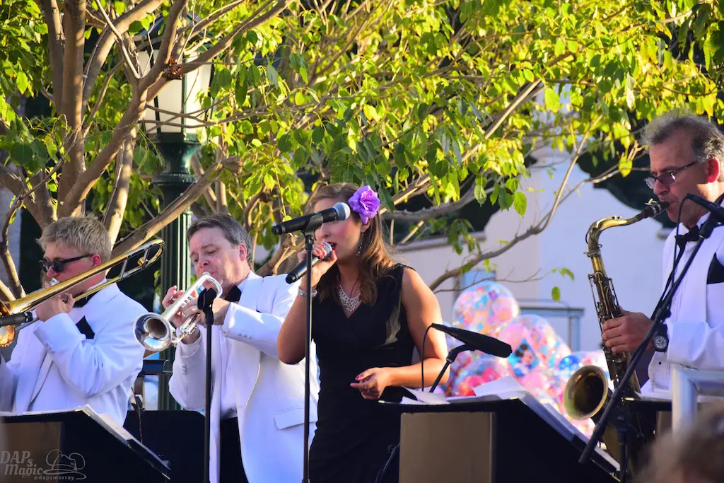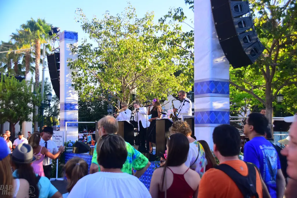 At night, the 50’s dress that Disney Parks Blog announced guests could take part in paid off as two bands presented dance parties to harken back to the era. At Disney California Adventure, a stage near Carthay Circle held the Side Street Swing Orchestra playing jazzy renditions of Disney tunes with swing dancers in the street. Over in Tomorrowland, Scot Bruce paid tribute to the King of Rock and Roll for dancing pleasure.