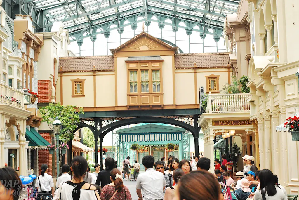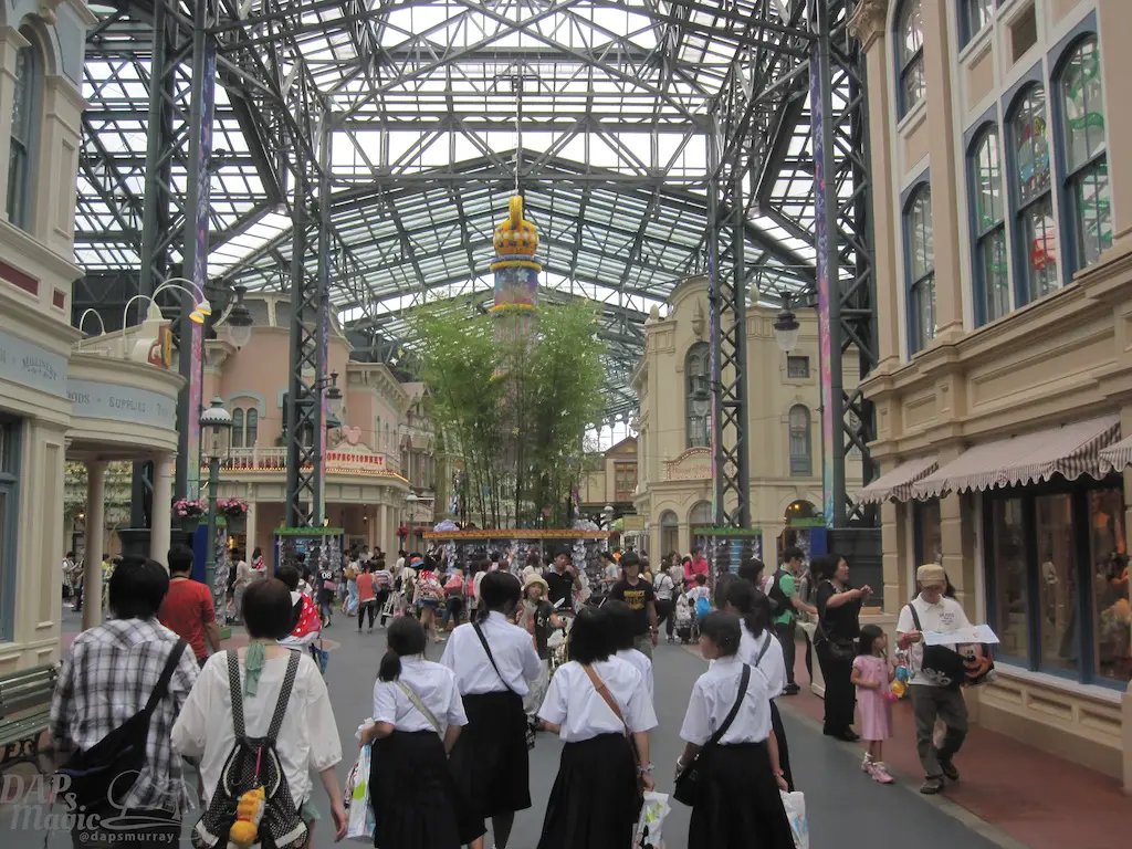 World Bazaar has a Main Street feel. Turn of the century buildings line the streets. But, the whole area is covered by a glass ceiling. It’s essentially a giant show building! The reason is because of the frequent rain that hits Japan. World Bazaar is a place of cover for the wet guest.