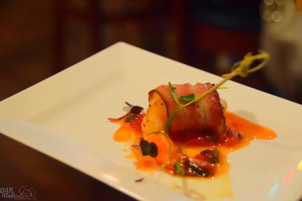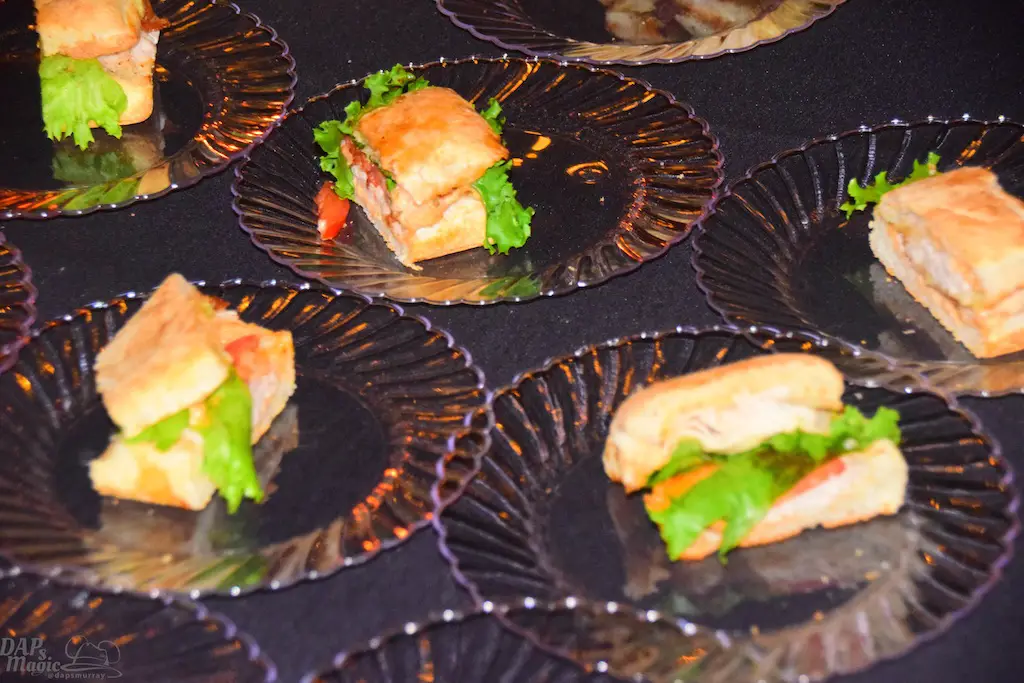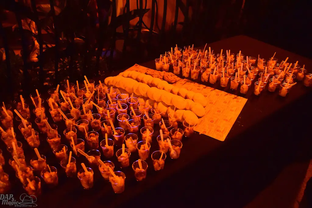 The night starts by pulling up to the Grand Californian to check in. Guests are divided into groups to tour the various locations. Each location has a selection of drinks and food, tapas style. You start in a particular food location and wait to move on within about 15 minutes. This allows for a good amount of time to savor the choices while being able to have everyone provided for.