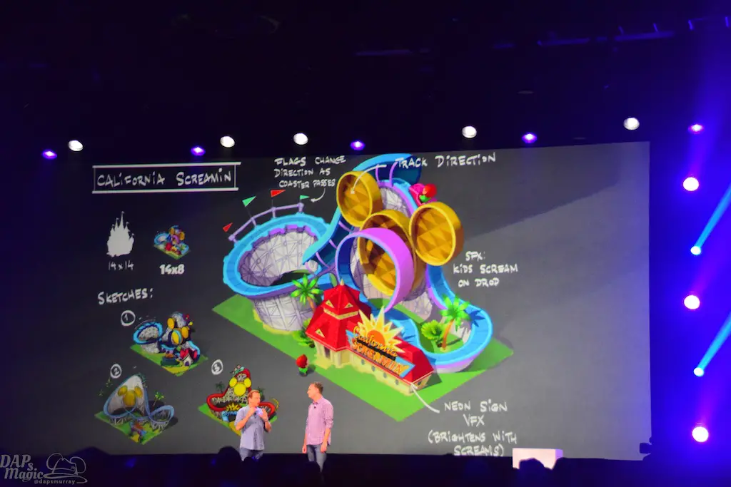 The presentation moved onto mobile apps with Scott Humphries and Tom Morris. They went through how games on mobile devices have taken off and become hits. But, this was about announcing what’s next. Disney’s Magic Kingdoms will debut on mobile devices to give theme park experiences outside of the parks. The mobile apps group is working with Imagineering to convey the magic and excitement of the Disney parks in a digital experience. Shown was concept art of pieces such as Space Mountain and California Screamin’. Also told was that though this game is about building your own Disney theme park, a story will be revealed where you will have to defeat villains with other Disney characters.