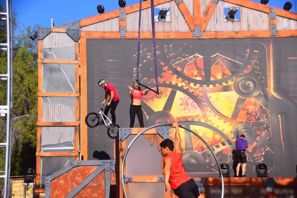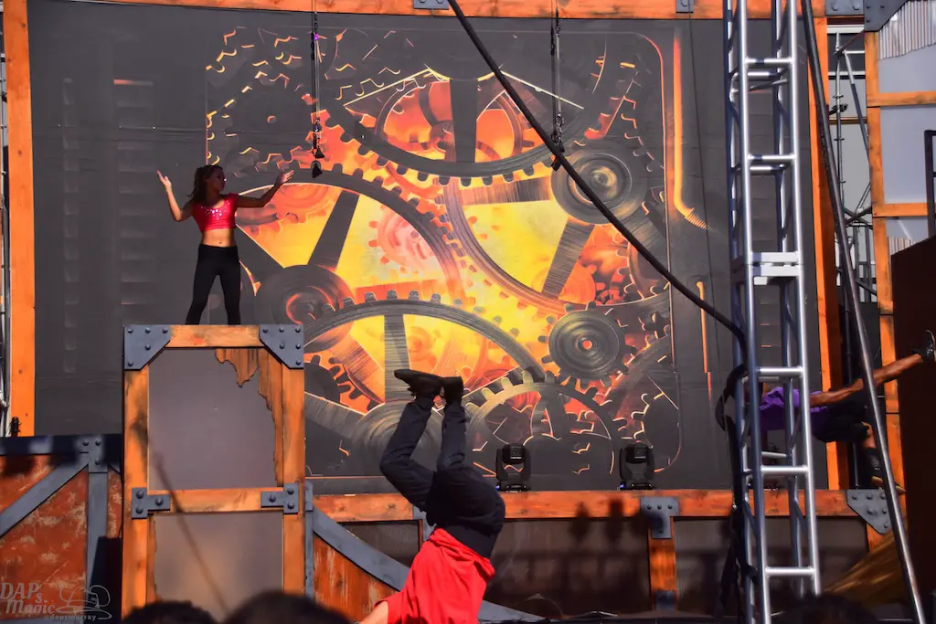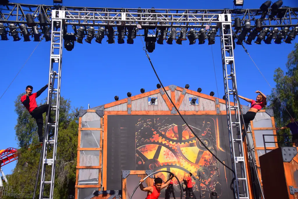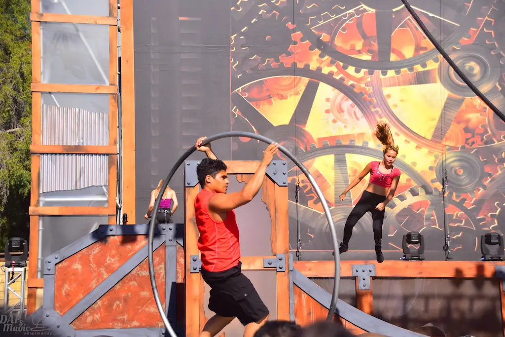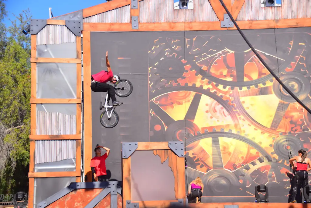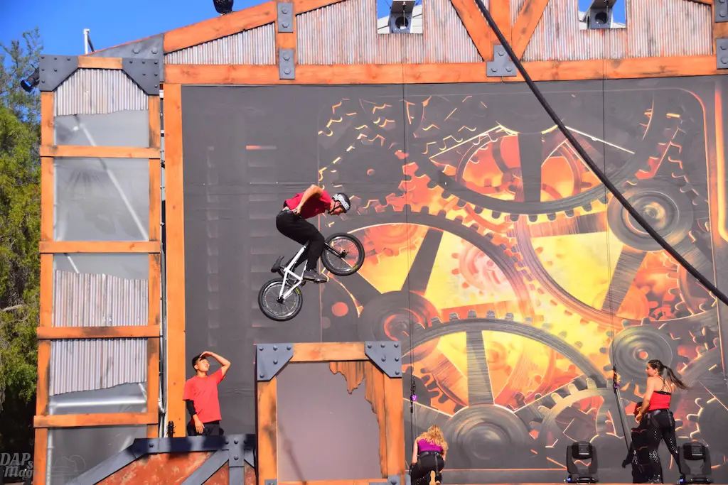 Over in Ghost Town, even more thrills abounded in Vertical Impact. Acrobats and BMX stunt riders entertained in one of the most unique shows I’ve ever seen. Trampolines lined some of the main stage and enabled performers to reach great heights and amazing flips. BMX riders had ramps to perform high in the air jumps and flips. Hoops, trapezes, and ropes enabled the acrobats to show off high in the sky skills that took some breath away. The performance was full of excitement and amazing moves that aren’t done just anywhere else.
